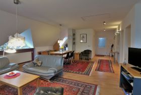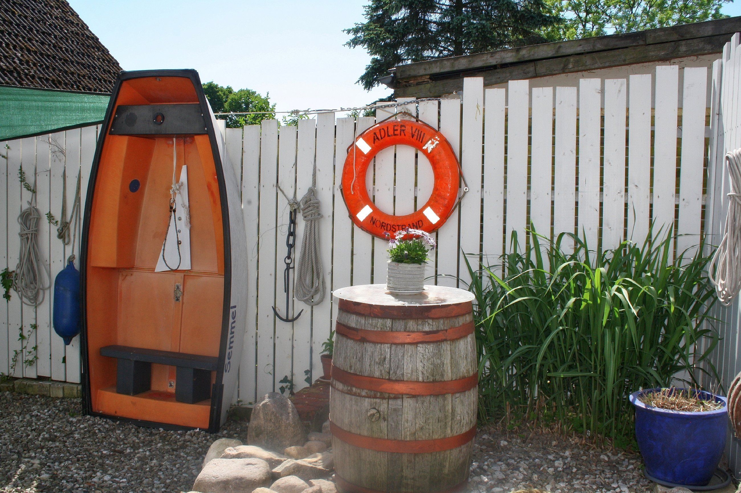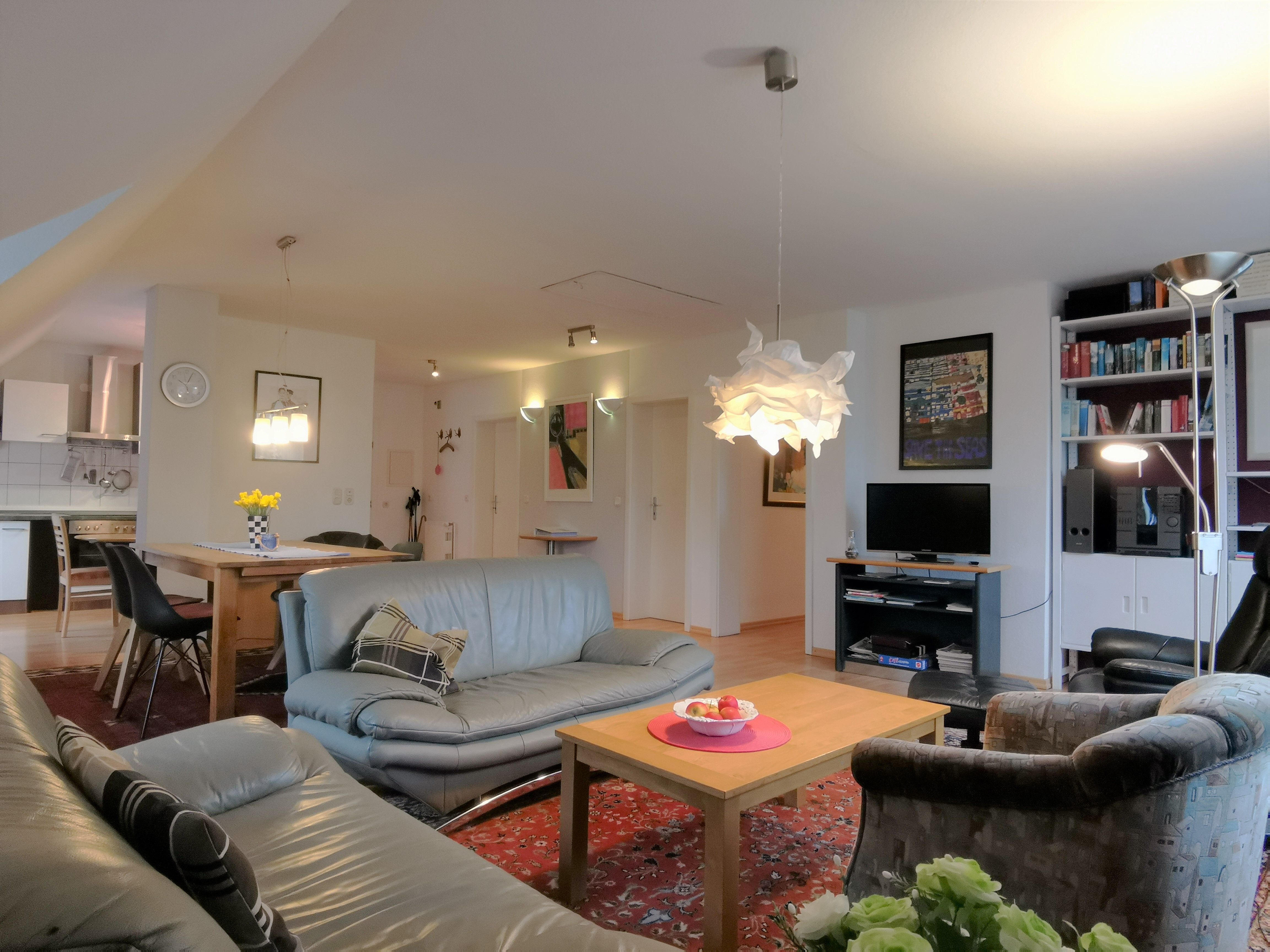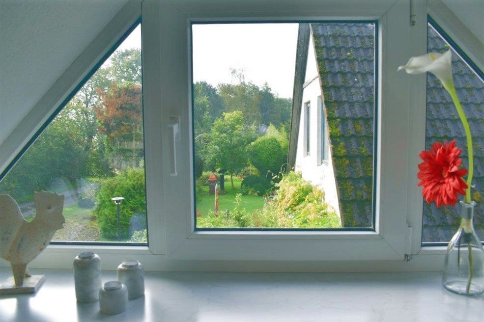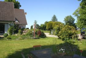 Die Ferienwohnung Kobs liegt in ruhiger Sackgassenlage in wunderschöner, ländlicher Umgebung. Sie ist 98 qm groß, gemütlich eingerichtet, liegt im Obergeschoss und verfügt über einen eigenen Eingang. Der große Wohn- und Essbereich mit Blick in den schönen Garten und ins Grüne verfügt über einen Esstisch, eine Sitzecke mit Sofas und Lesesessel, eine kleine Bibliothek, eine Musikanlage und TV. Vom großen Raum ist die gut ausgestattete Küche mit kleinem Tisch und zwei Stühlen begehbar (mit Gefrierfach, Mikrowelle, Herd und Spülmaschine). Die Wohnung verfügt über zwei Schlafzimmer: vom Schlafzimmer mit Doppelbett und großem Kleiderschrank geht das Bad mit Badewanne ab, das Schlafzimmer mit zwei Einzelbetten, Schrank und kleinem Schreibtisch hat neben sich das kleinere Bad mit Dusche und Waschmaschine liegen. Unabhängig vom Wetter kann man herrlich unter der überdachten Terrasse mit Gartenmöbeln und Grill sitzen - umgeben von maritimer Dekoration, die Lust auf einen Ausflug ans Meer macht.