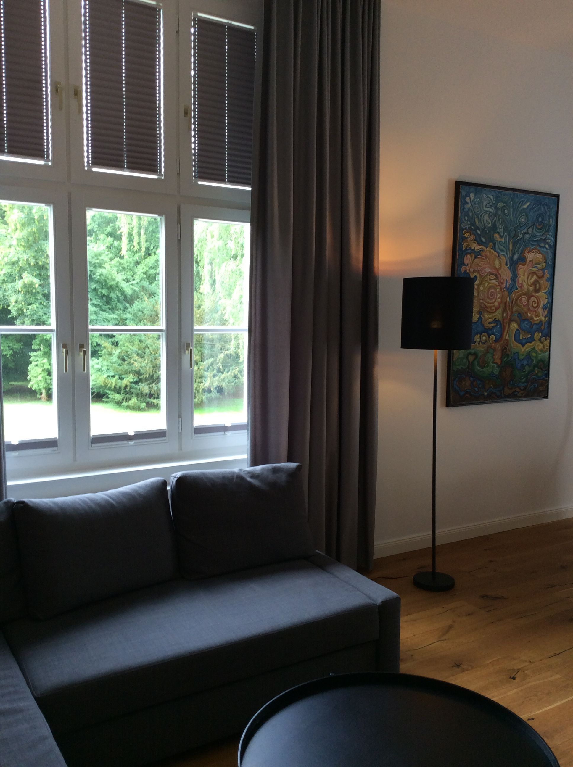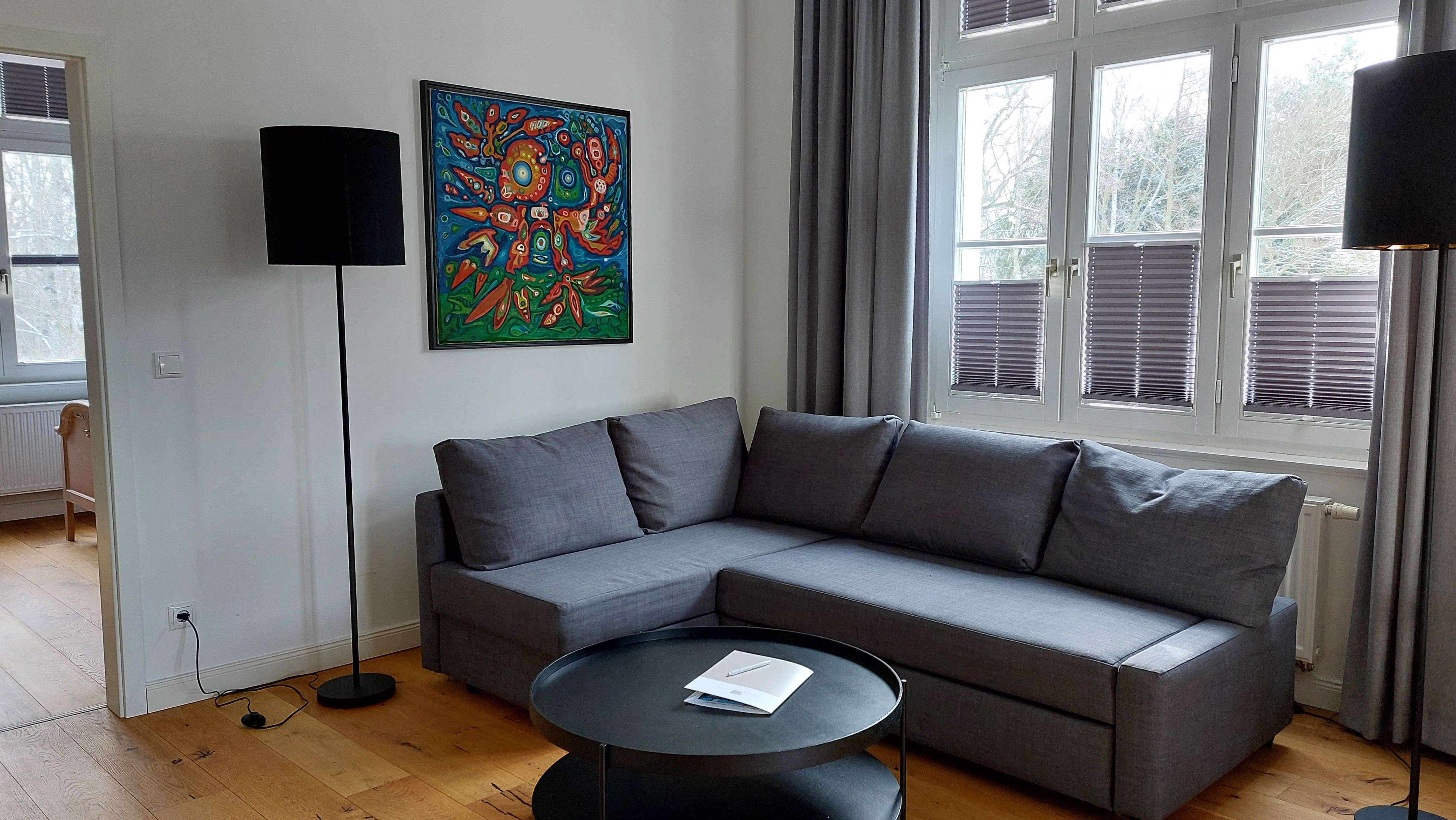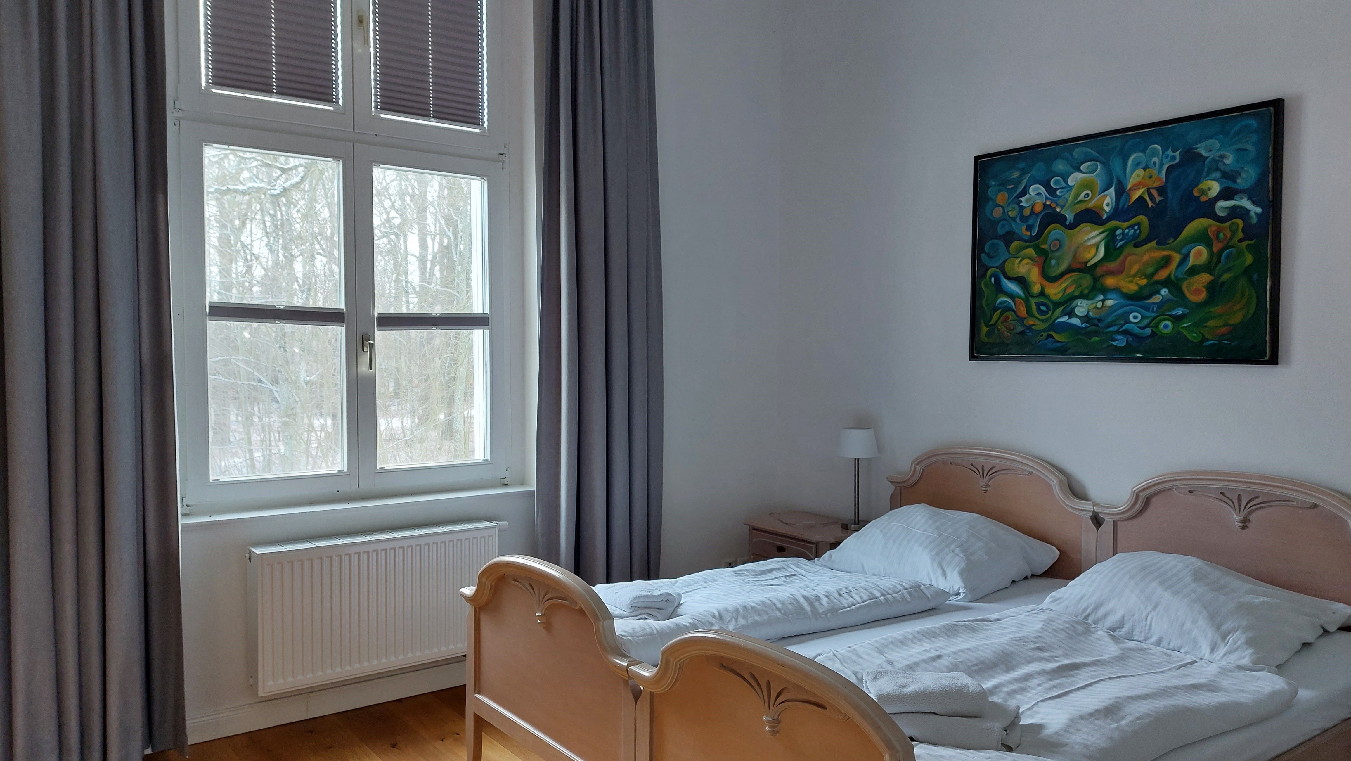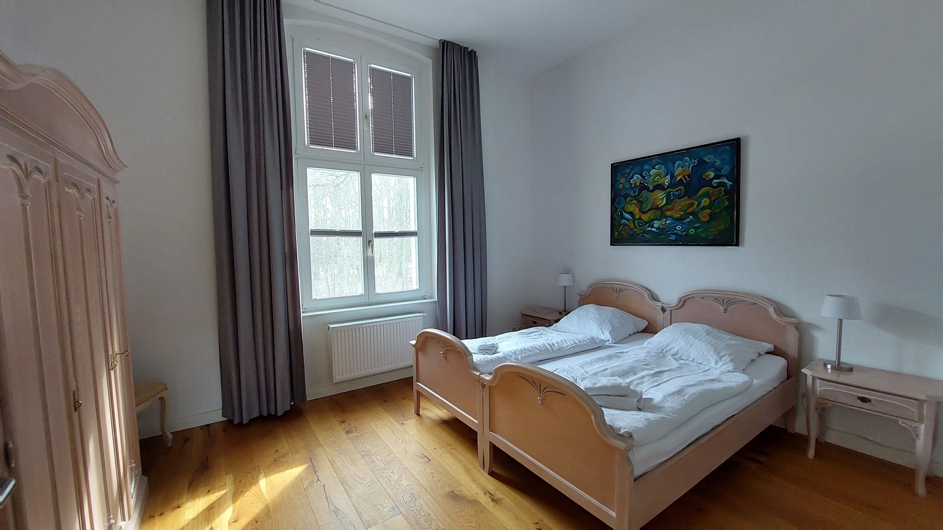 Dieses Schloss Royal Apartment ist Teil des ehemaligen Wohnbereiches des Grafen von Trautvetter, der hier bis 2010 lebte. Es ist ein großzügiges Apartment mit hohen Decken im ersten Obergeschoß (mit dem Aufzug erreichbar), einem separaten Schlafzimmer mit einem Doppelbett (1,80 Meter breit) und einem offenen Wohn-Küchenbereich mit Schlafcouch (1,60 Meter breit), sowie einem einladenden Flur und großem Tageslicht-Bad.