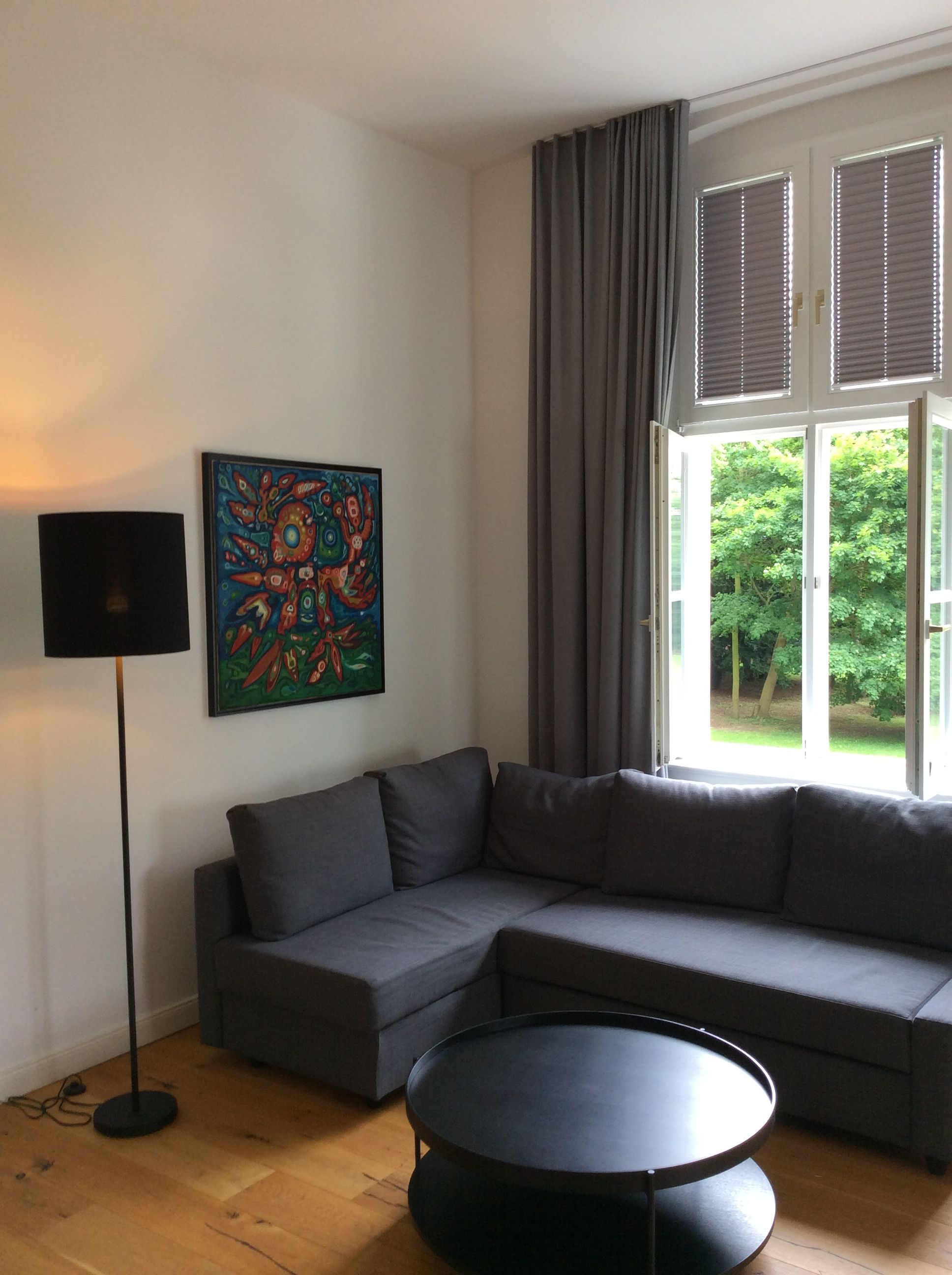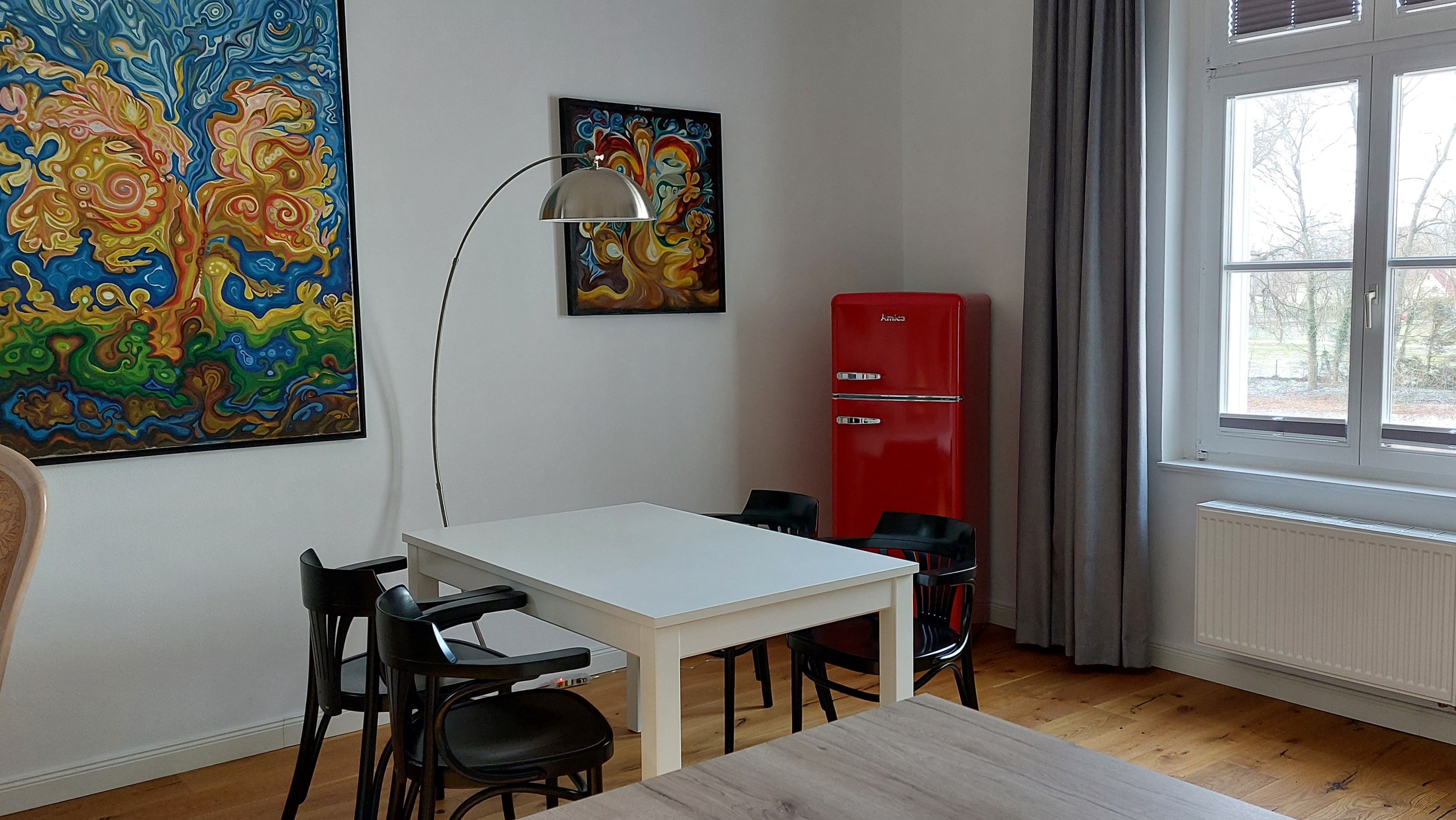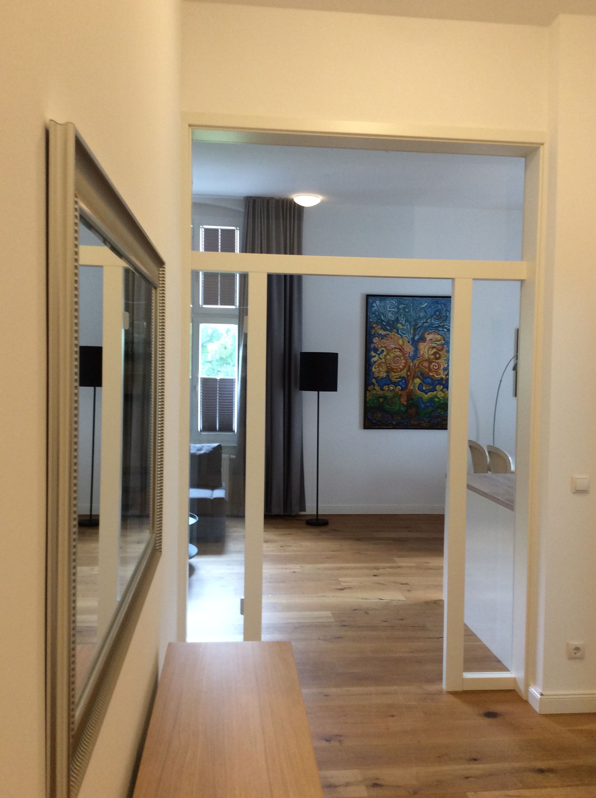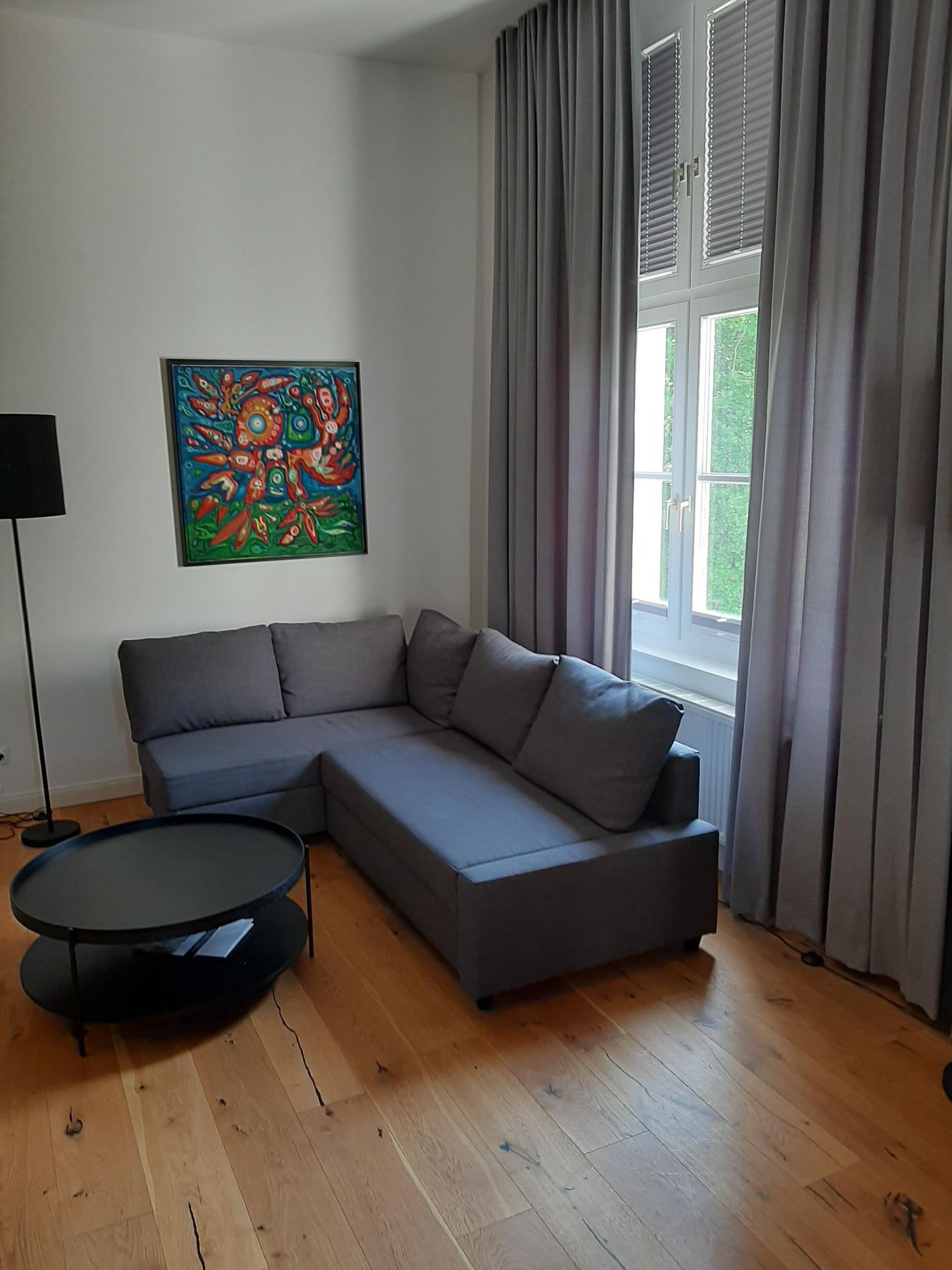 Dieses Schloss Royal Apartment ist Teil des ehemaligen Wohnbereiches des Grafen von Trautvetter, der hier bis 2010 lebte. Es ist ein großzügiges Apartment mit hohen Decken im ersten Obergeschoß (mit dem Aufzug erreichbar), einem separaten Schlafzimmer mit einem Doppelbett (1,80 Meter breit) und einem offenen Wohn-Küchenbereich mit Schlafcouch (1,60 Meter breit), sowie einem einladenden Flur und großem Tageslicht-Bad.