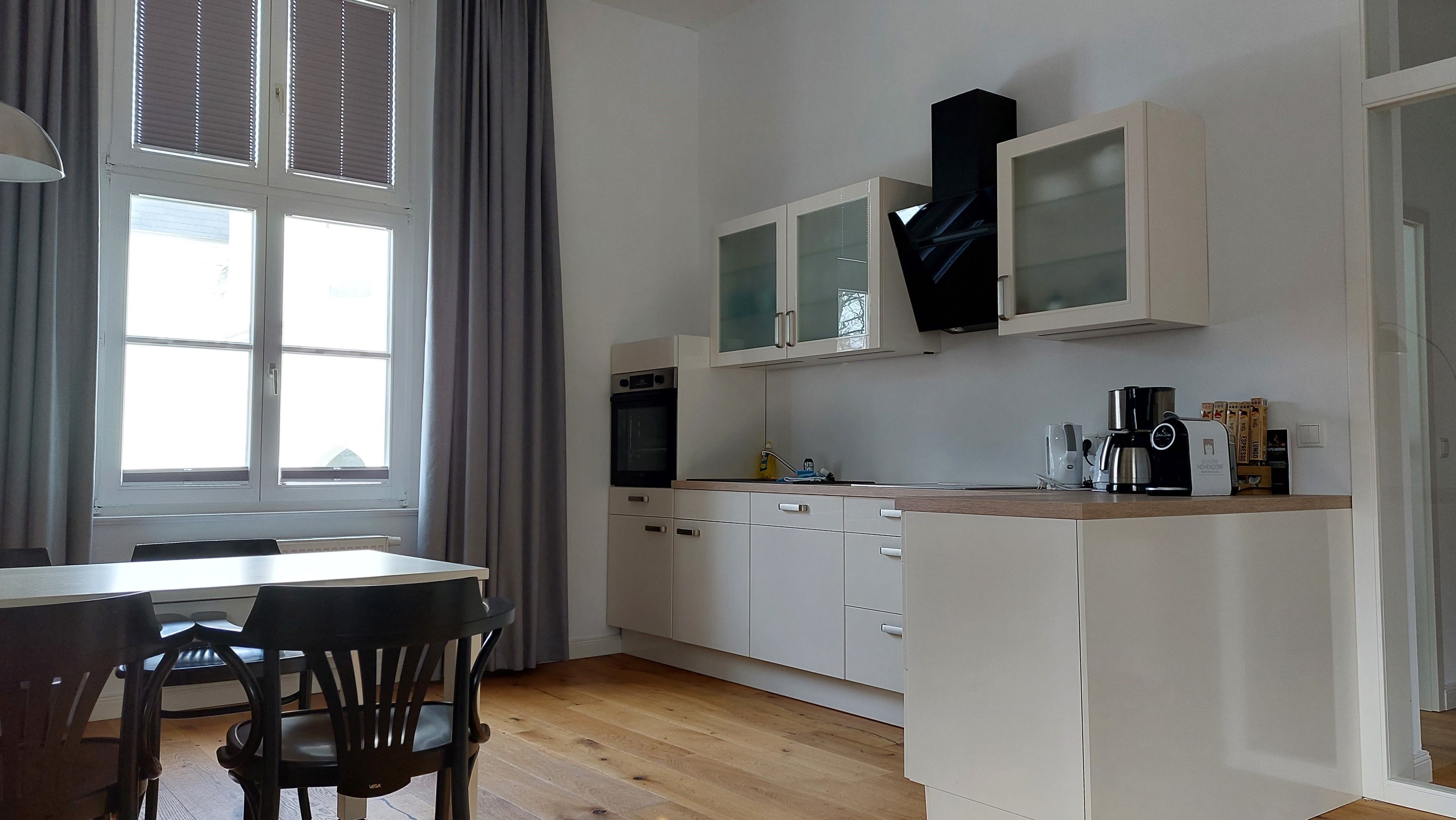 Alle Wohnungen sind ausgestattet mit einer modernen Küchenzeile, einem Kühlschrank und einer Backofen-/Mikrowellen-Kombination. In Anlehnung an das Gesamtkonzept der Kontraste ist das klassische Schloss innen hochmodern eingerichtet. So gibt es auch für Feriengäste sowohl modern, als auch klassisch ausgestattete Apartments.