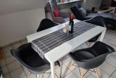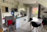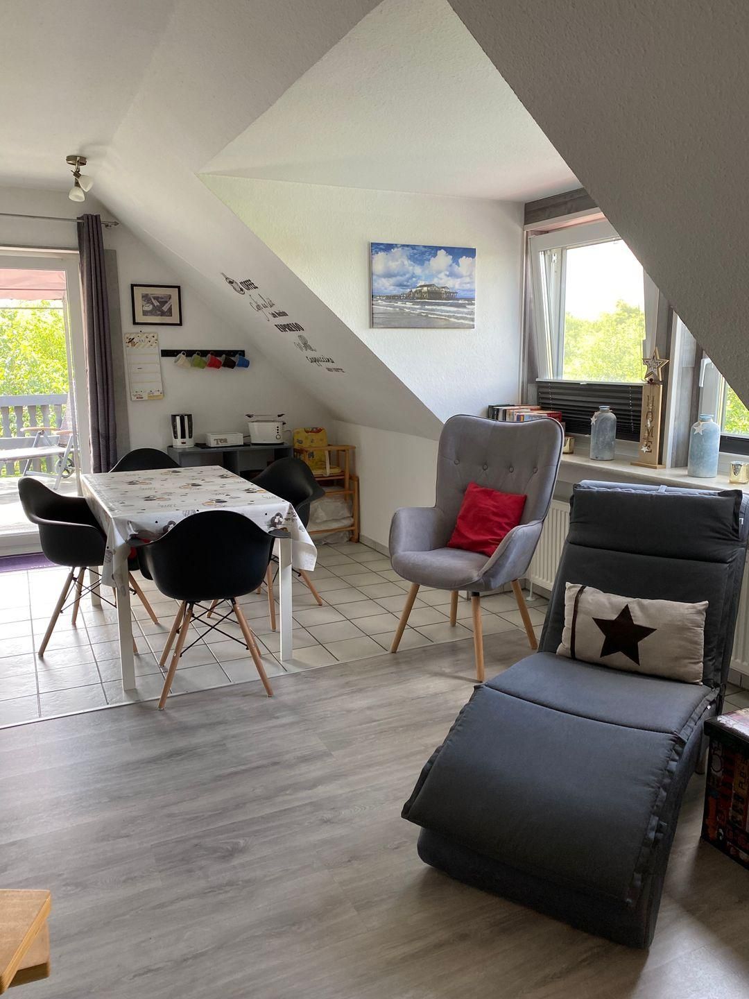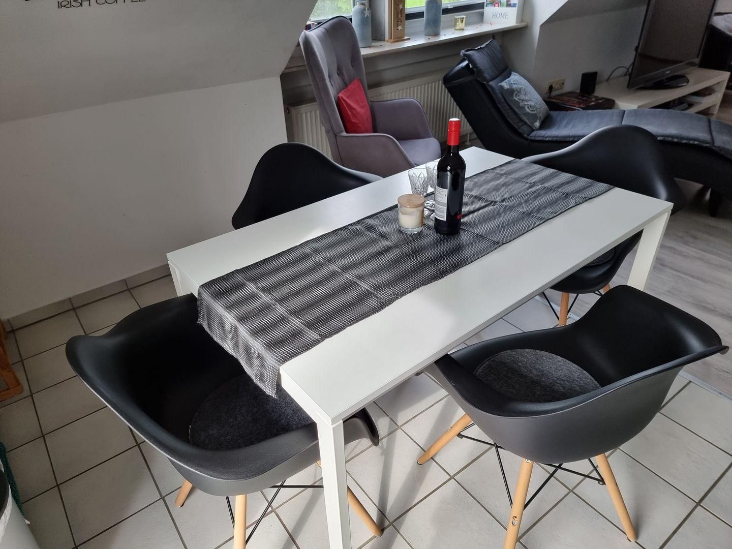 Der Wohn-Essbereich, das Herzstück unserer Ferienwohnung, ist mit einer voll ausgestatteten Einbauküche versehen, die keine Wünsche offen lässt. Genießen Sie die Annehmlichkeiten eines Ceranfelds, Backofens, einer Spülmaschine, eines Kühlschranks mit Gefrierfach, einer Mikrowelle sowie einer Kaffeemaschine, eines Toasters und eines Wasserkochers – begleitet von einer Auswahl an Küchenutensilien, die das Kochen zum Vergnügen machen.