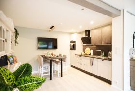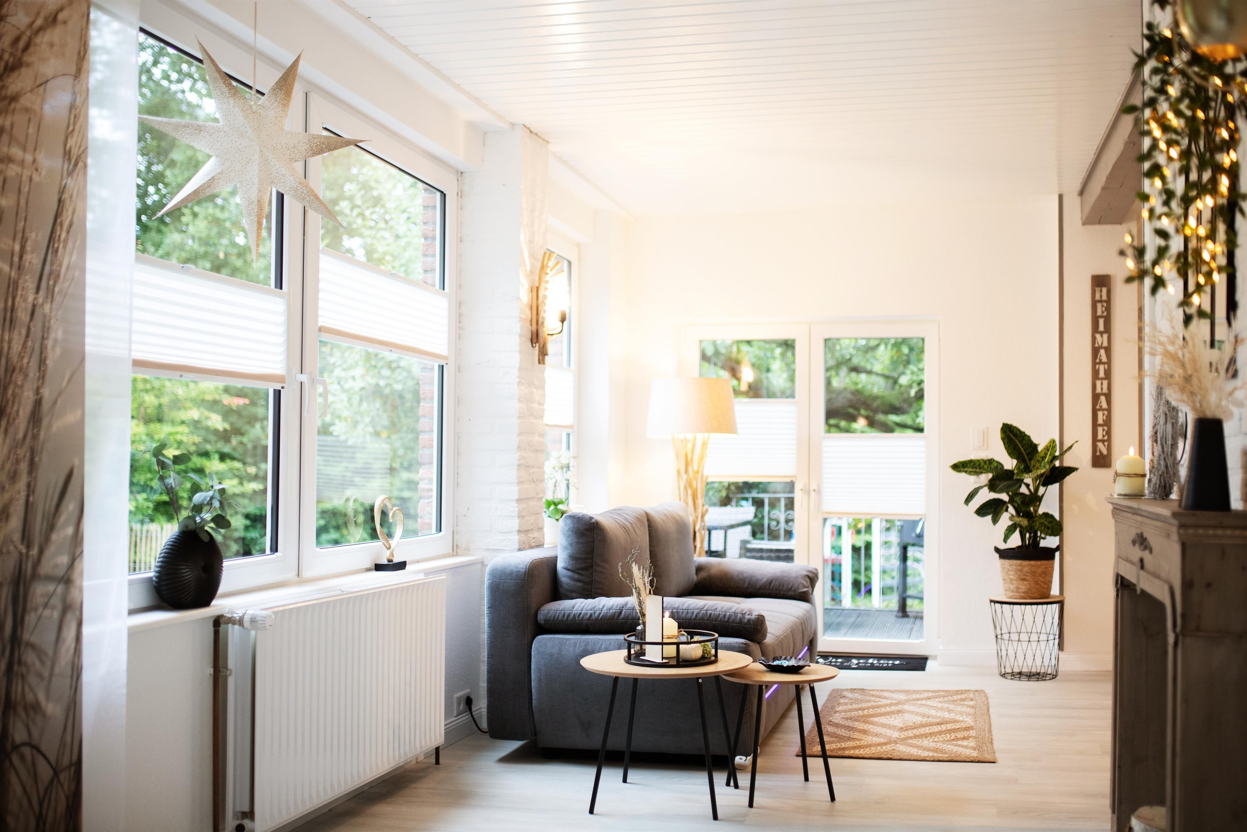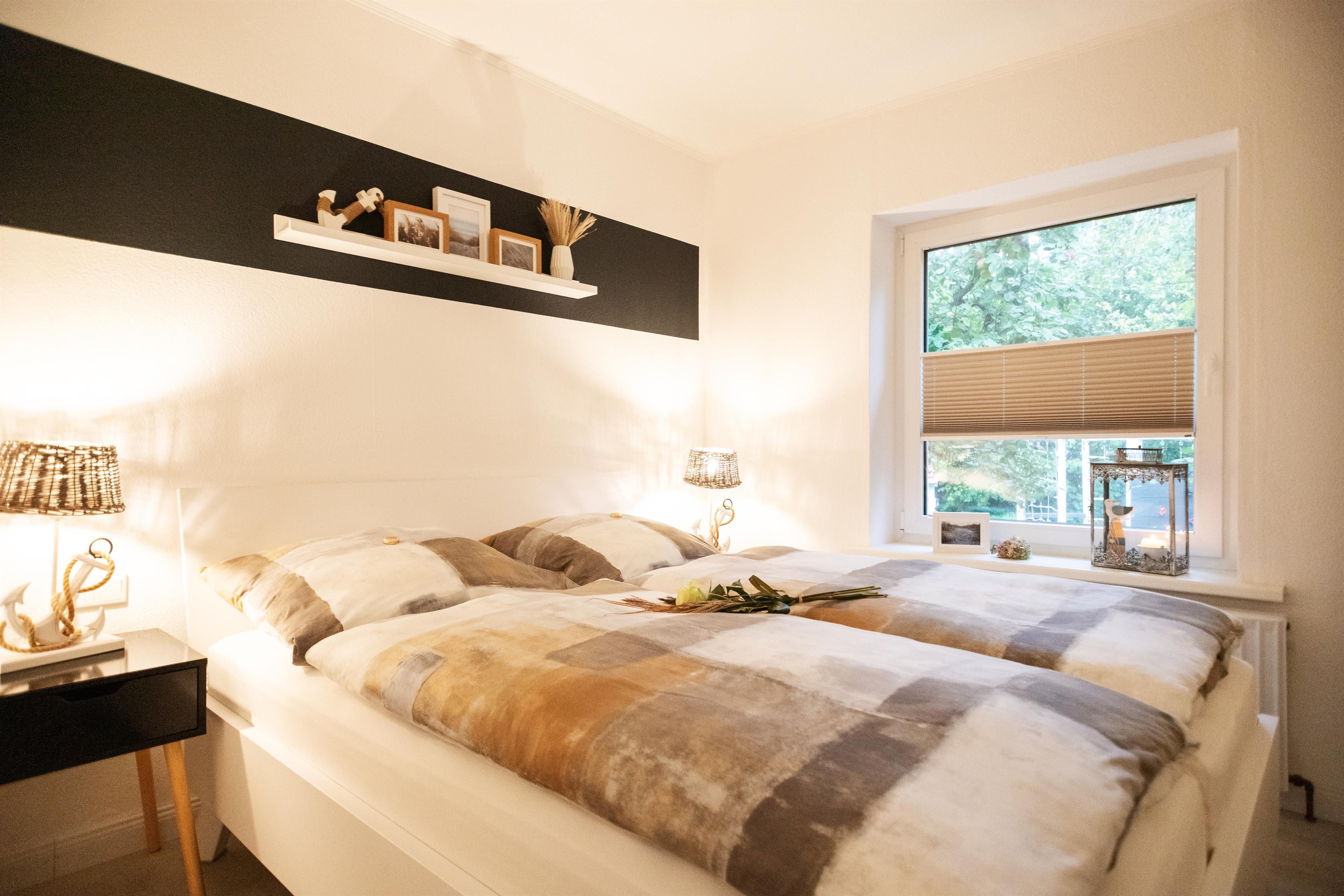 Die Wohnung eignet sich für 2 Erwachsene und 2 Kinder. Es gibt ein Doppelbett im Schlafzimmer sowie ein Boxspring-Schlafsofa für max. zwei Personen im Wohnzimmer. Es gibt eine Terrasse zur Südseite mit Garten und Kinderspielplatz mit Klettergerüst. Von hier haben Sie Blick in den Garten und in die Felder.