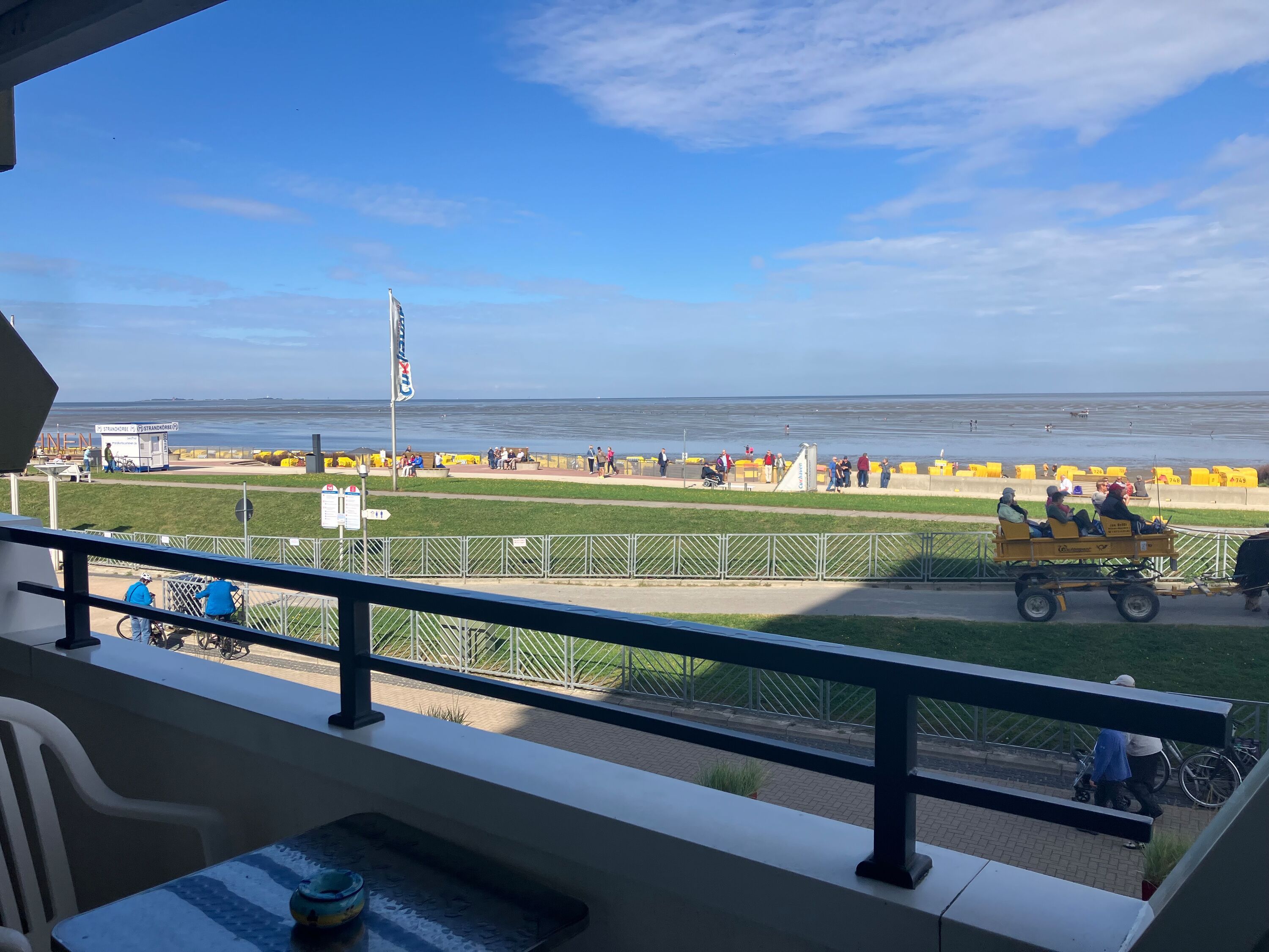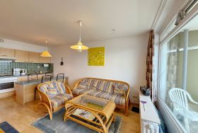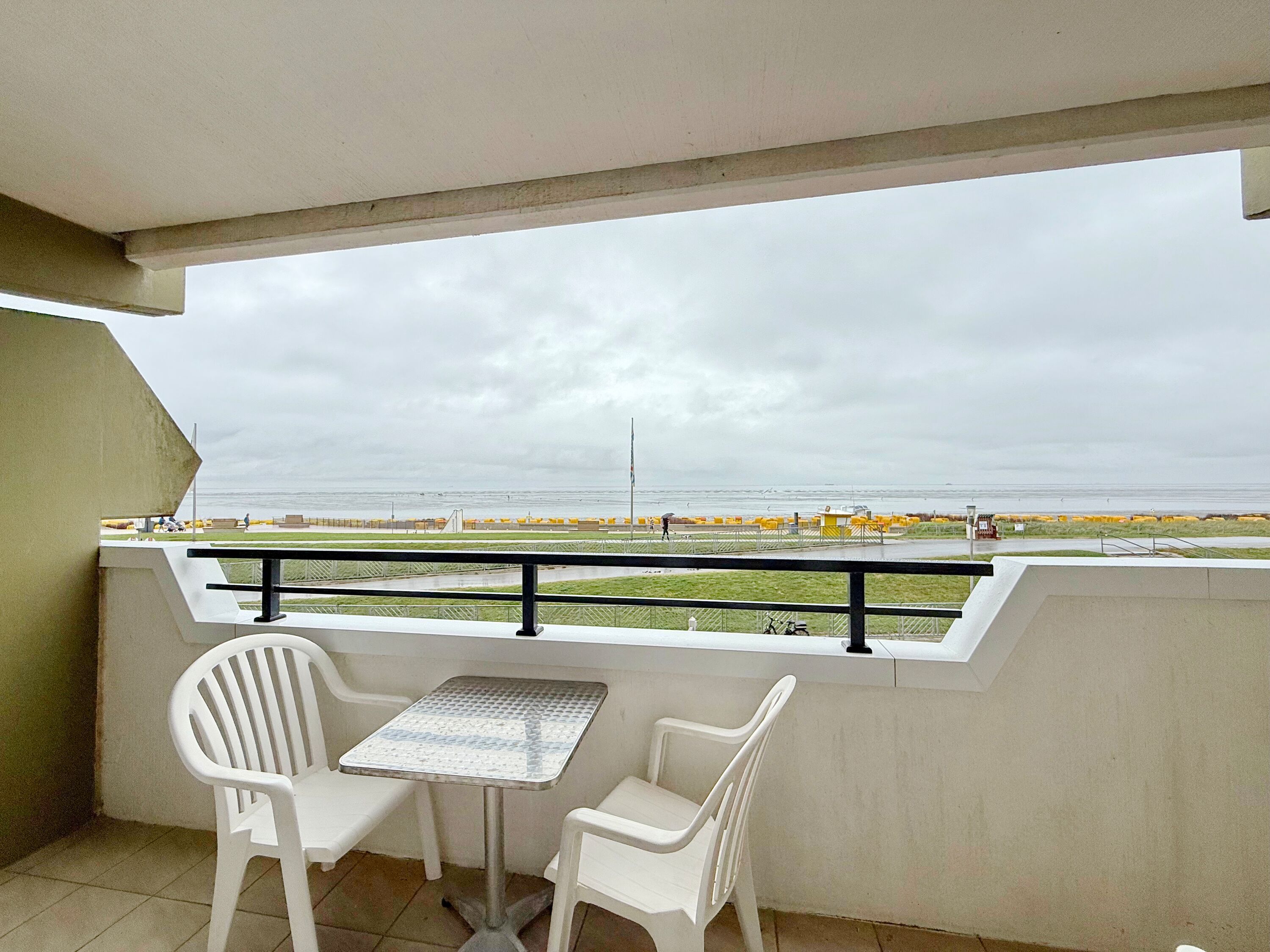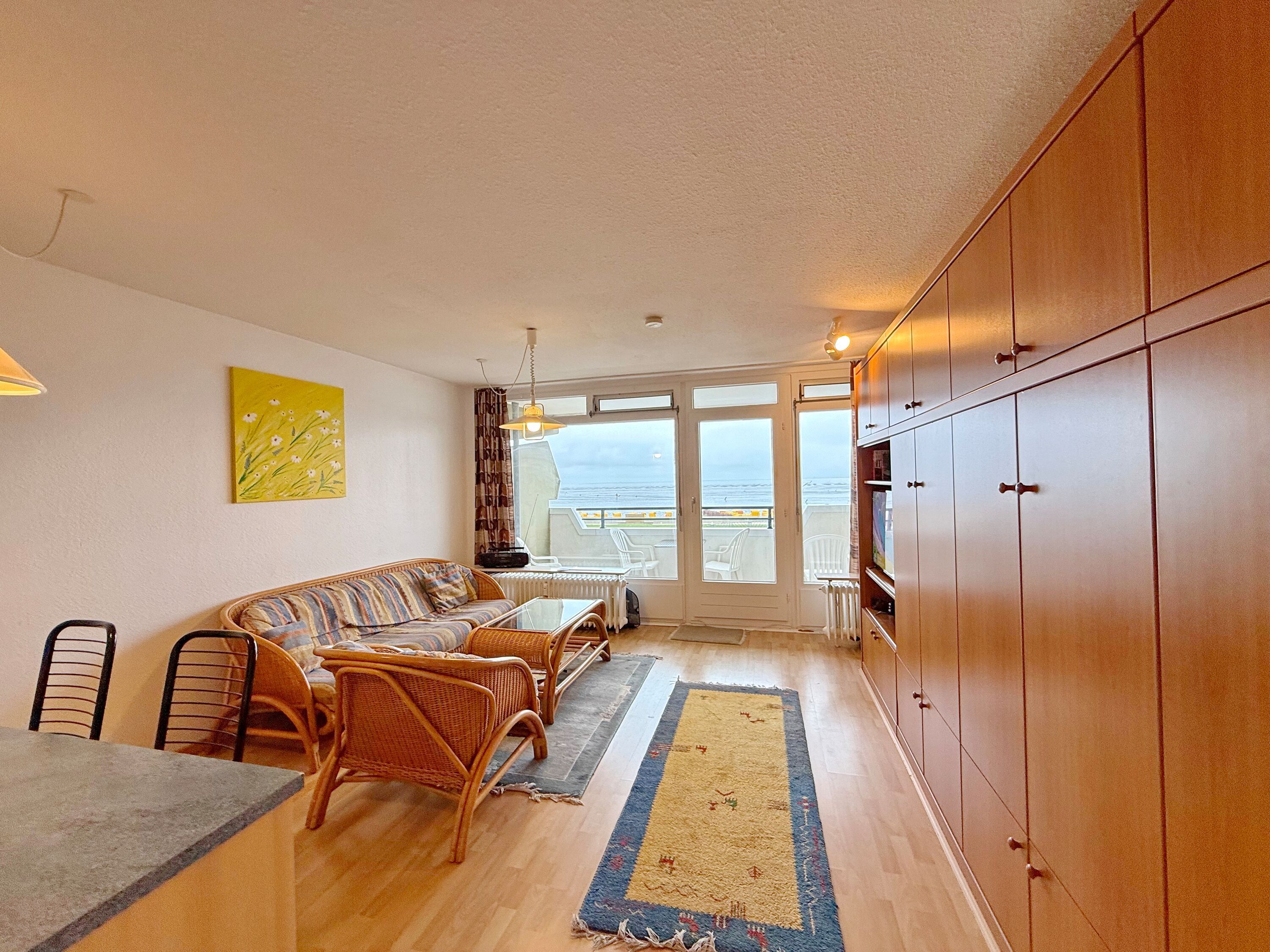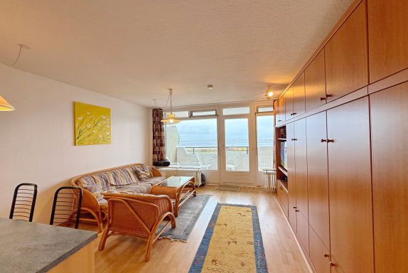 Traum-Blick direkt am Deich von Duhnen auf der 1. Etage. Die Ferienwohnung bietet Platz für 2 Personen. Bei einer Größe von ca. 45 m² verfügt die Wohnung über ein kombiniertes Wohn-Schlafzimmer (2 Einzelschrankbetten) mit Küchenzeile und Zugang zum überdachten Nordbalkon mit tollem Blick aufs Wattenmeer. Im Wohnungsflur befinden sich 2 Etagenbetten und der Zugang zum Duschbad.
