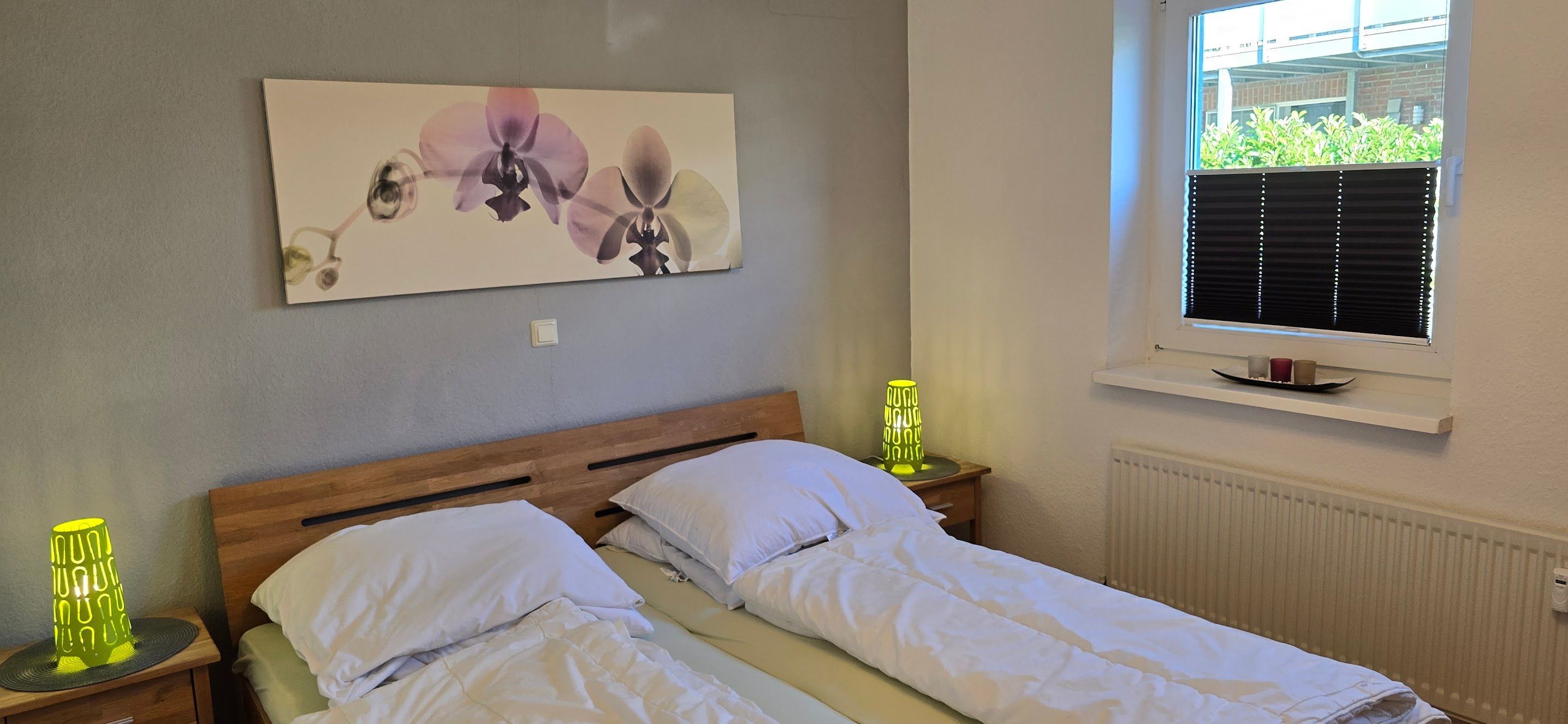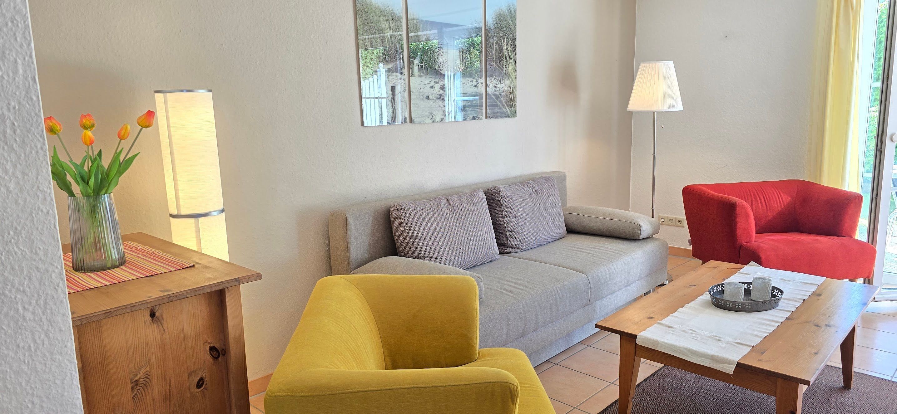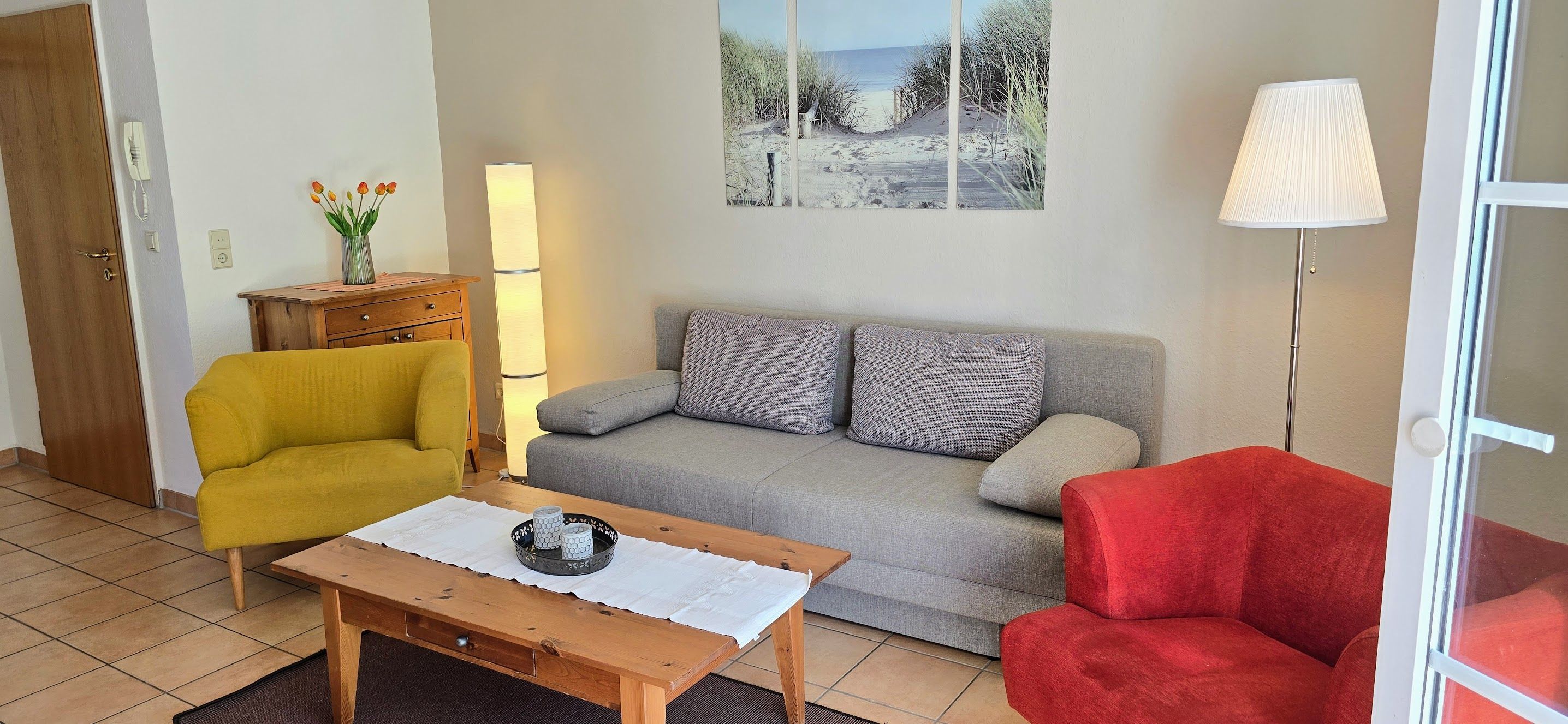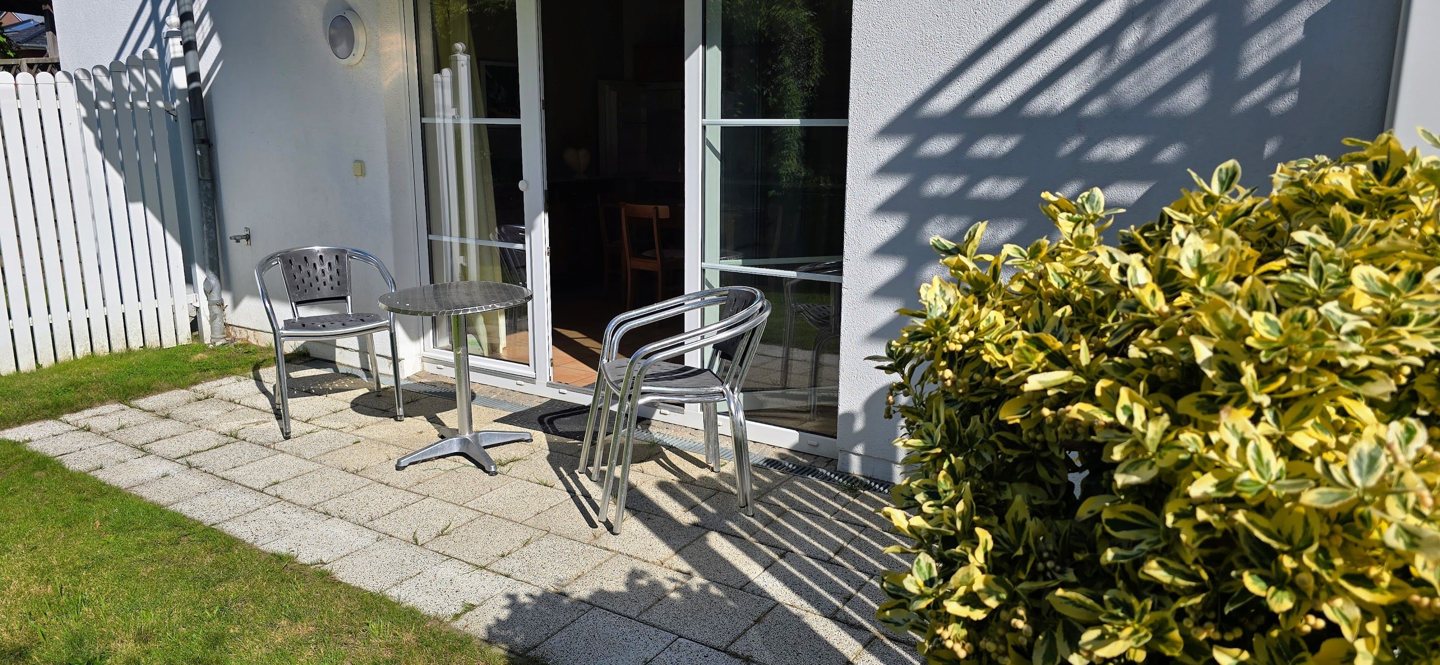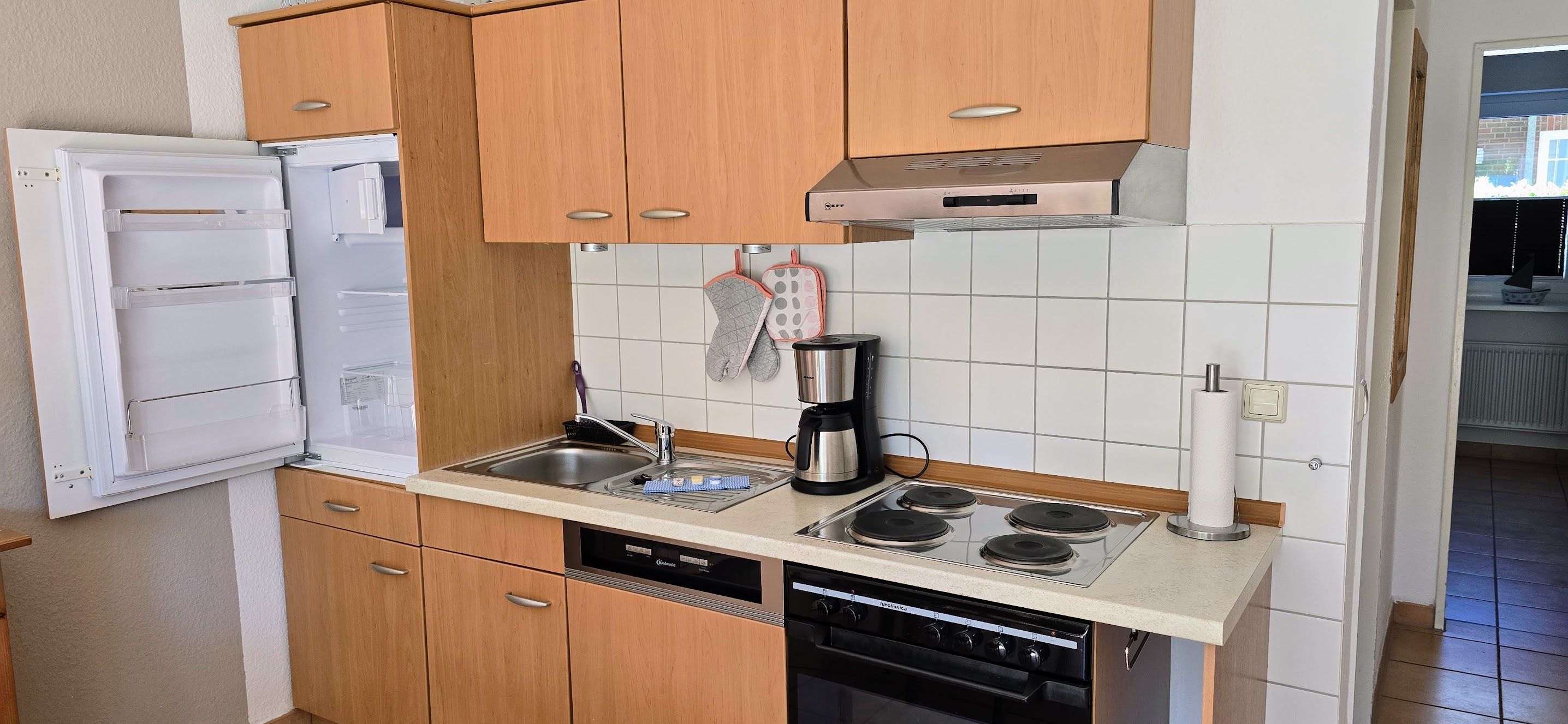 2 Raum Apartement mit Terrasse , 1,80m x 2 Doppelbett im Schlafzimmer und Schlafcouch im Wohnzimmer sowie einer gut ausgestatteten Küchenzeile mit Geschirrspüler und Backofen . Esstisch für 4 Personen. Kaffemaschine und Toaster sind vorhanden. Erstausstattung Bettwäsche und Handtücher vorhanden. Kinderbett und Hochstuhl für die Kleinsten bitte vorbestellen . Für Ihr Auto ist ein Garagenplatz vorgesehen. Max. Höhe 1,50m.