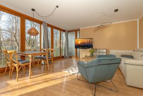 Das Schlafsofa ist für die 3. und 4. Person ein Highlight, denn es lässt sich mit schnellen und einfachen Handgriffen zu einem Bett umbauen mit einer komfortablen Matratze. Vom Wohnbereich aus haben Sie Zugang zum Balkon und Garten.