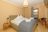 Das Schlafzimmer besitzt, ebenso wie das Wohnzimmer, einen eigenen Zugang zur Terrasse. In dem großen Doppelbett werden Sie einen erholsamen Schlaf finden. Auch an Ihre Urlaubsgarderobe ist gedacht: Ein geräumiger Kleiderschrank bietet viel Platz für die mitgebrachte Urlaubsgarderobe. Im Schlafzimmer finden Sie einen weiteren Flatscreen-TV für abendliches Fernsehprogramm.