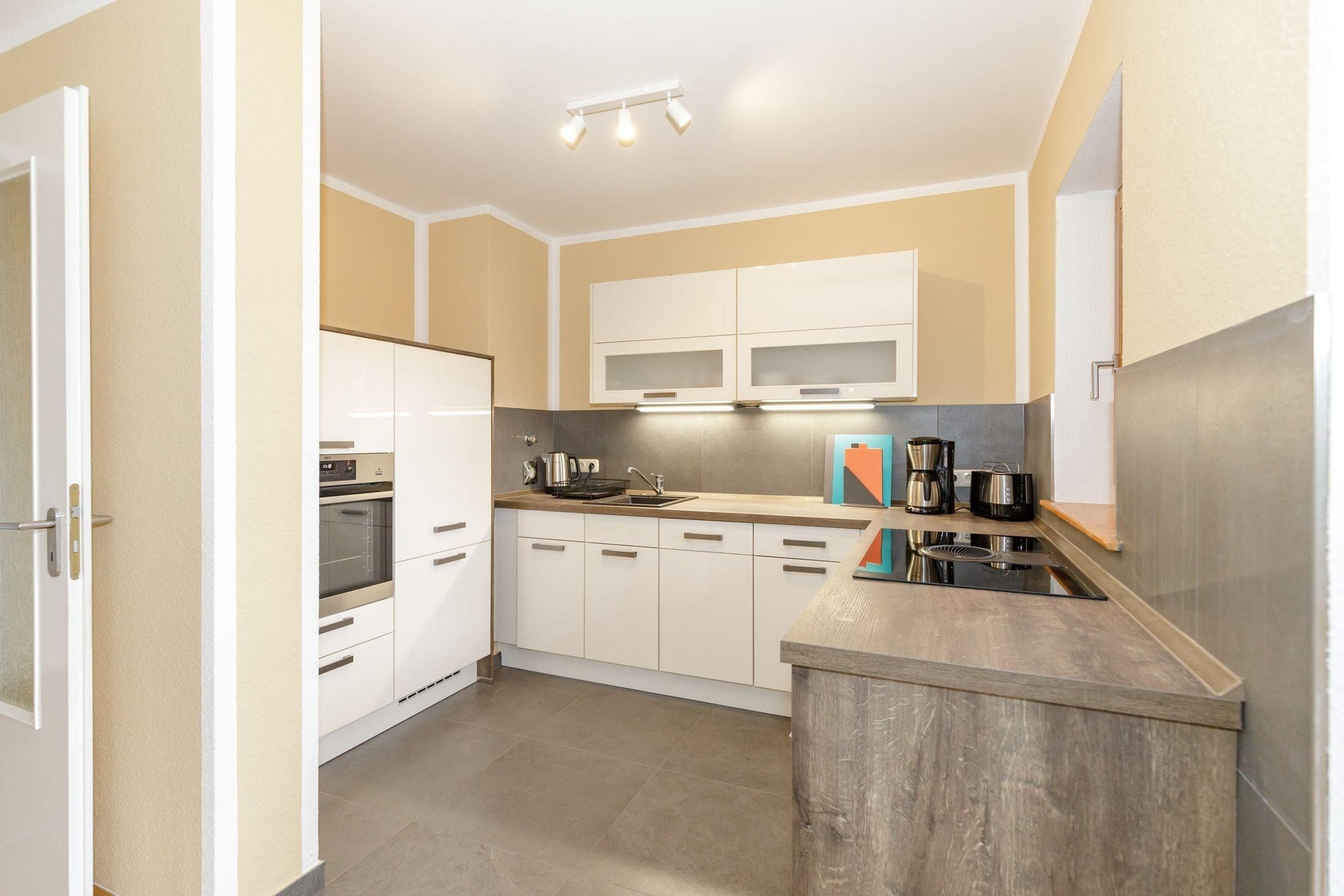 An den Wohnbereich grenzt die offene und sehr moderne Küche. Diese ist mit allen Annehmlichkeiten ausgestattet wie Geschirrspüler, 4 Platten-Touch-Kochfeld, Gefrierschrank, Mikrowelle, Wasserkocher, Kaffeemaschine Toaster und vieles mehr.