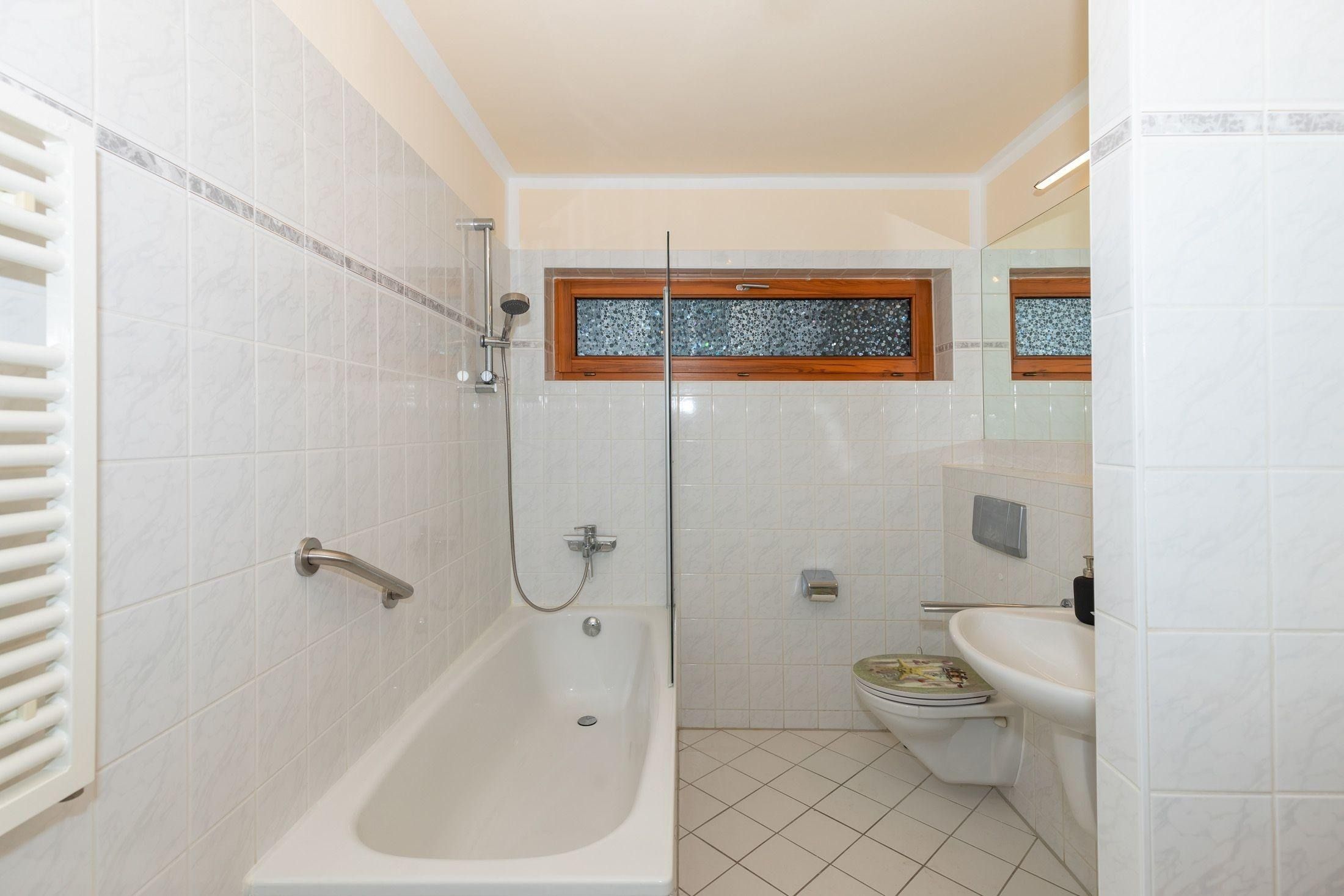 Das Badezimmer mit Fenster ist geräumig und modern gestaltet. Genießen Sie hier ein entspanntes Bad oder eine erfrischende Dusche.