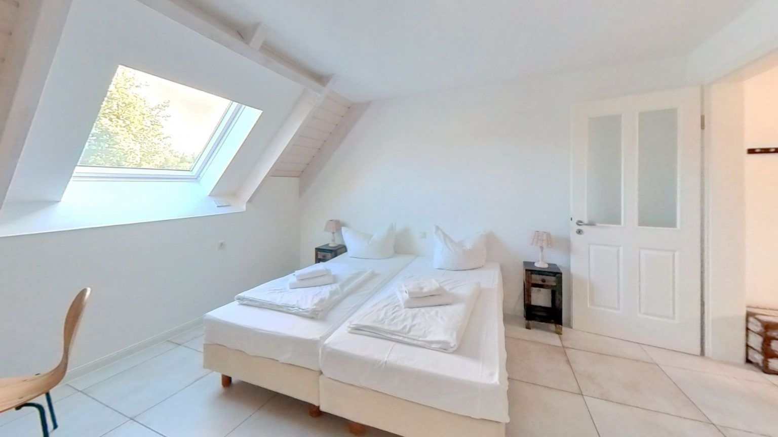 Im ersten Obergeschoss finden Sie ein gemütliches Schlafzimmer, das mit drei Betten ausgestattet ist. Es bietet ausreichend Platz für erholsame Nächte und einen ruhigen Rückzugsort.