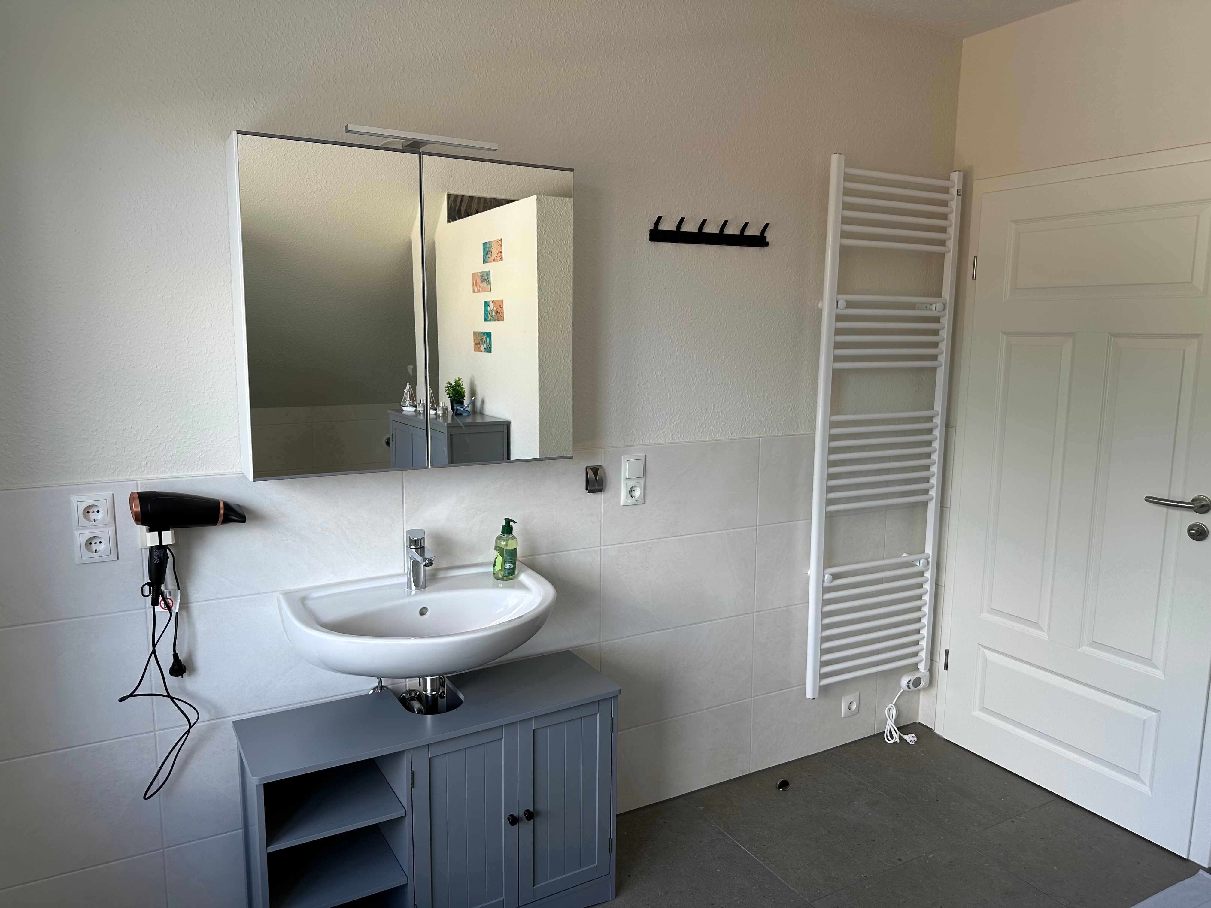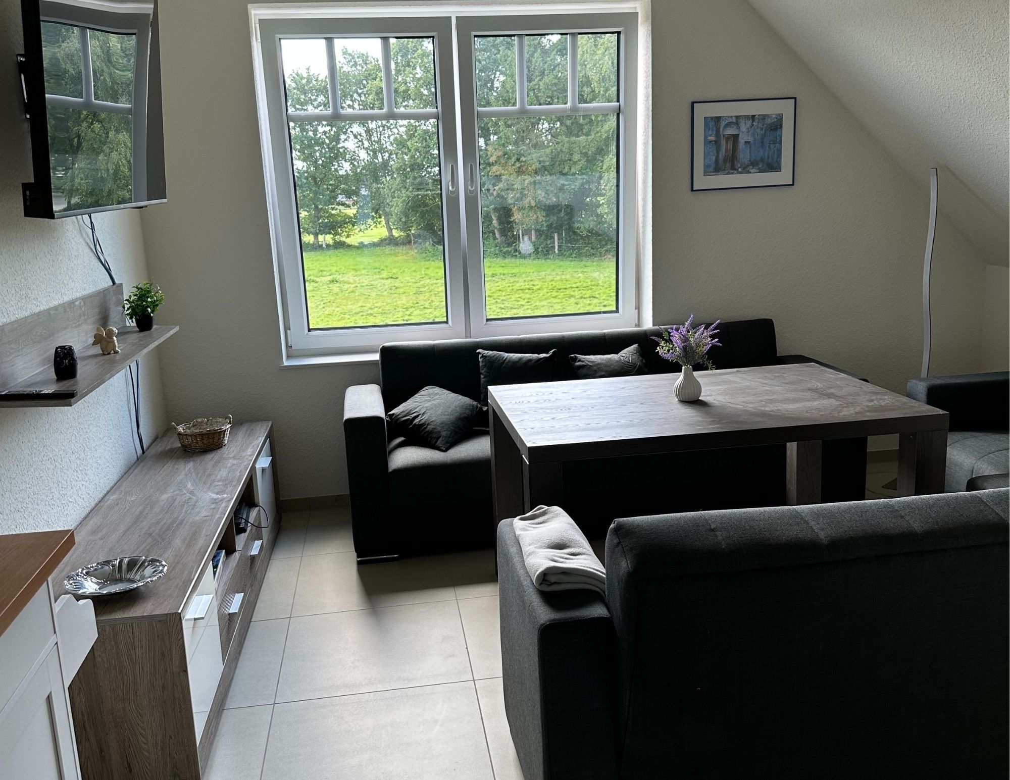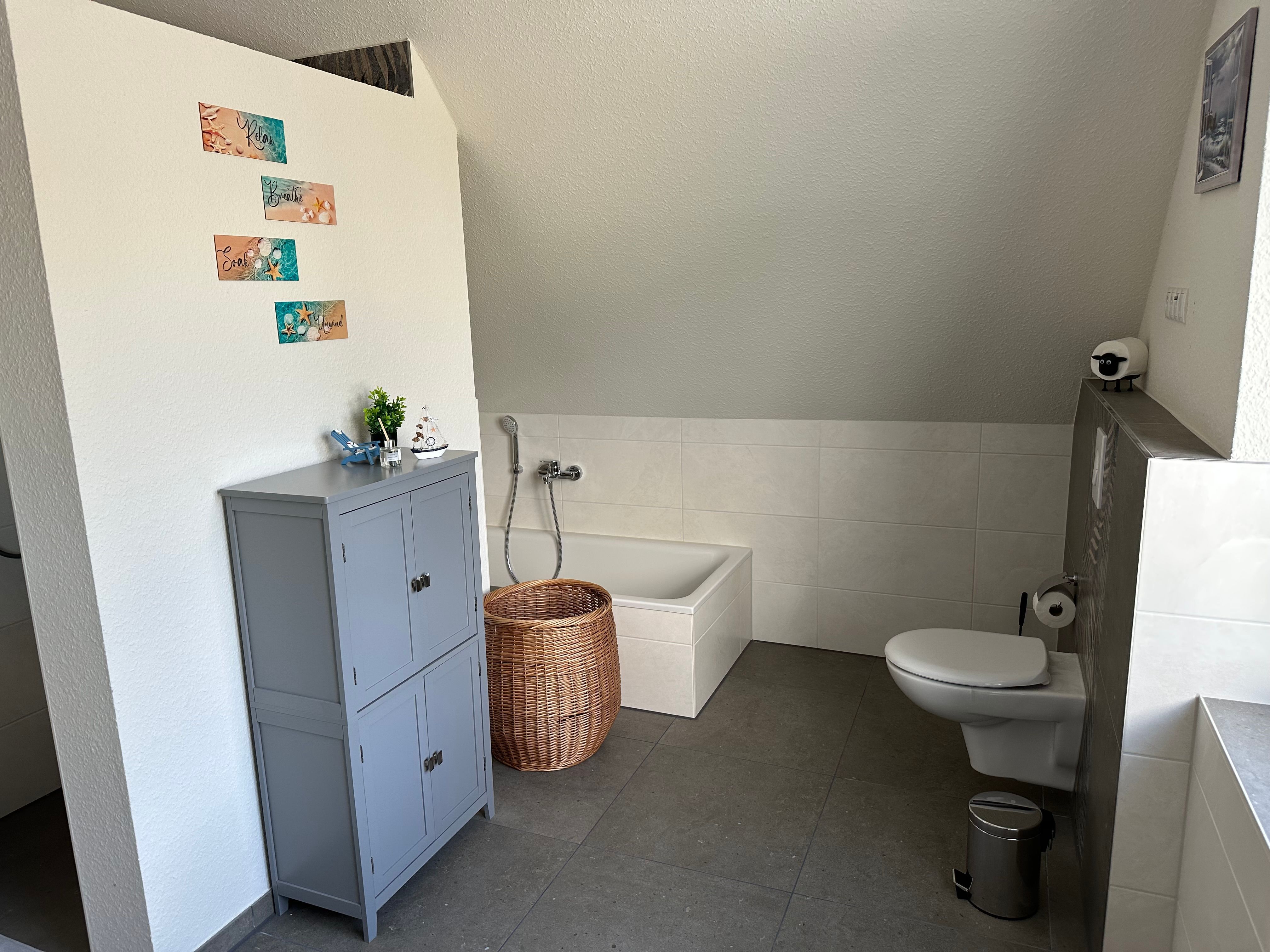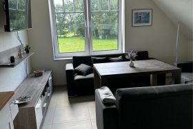 Die neu gebaute Ferienwohnung liegt im Obergeschoss und verfügt über eine gemütliche Wohnküche mit einem schönen Blick in die Natur. Die Wohnküche bietet eine zusätzliche Schlafmöglichkeit durch eine Couch, zwei gemütliche Doppelzimmer (1 Boxspringbett 1,80m x 2,00m und 1 Doppelbett 1,40m x 2,00m) sowie ein Bad mit einer Badewanne zum Entspannen und einer ebenerdigen Dusche. Eine Sitzecke im Garten steht Ihnen zur Verfügung.