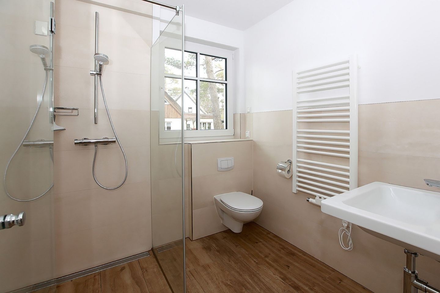 Ebenfalls im Erdgeschoss befindet sich ein Badezimmer mit ebenerdiger Dusche, WC, beheizbarem Handtuchhalter sowie einer separaten Lüftung – Komfort und Funktionalität in einem. Ein weiteres, ebenso ausgestattetes Badezimmer steht Ihnen im Obergeschoss zur Verfügung.
