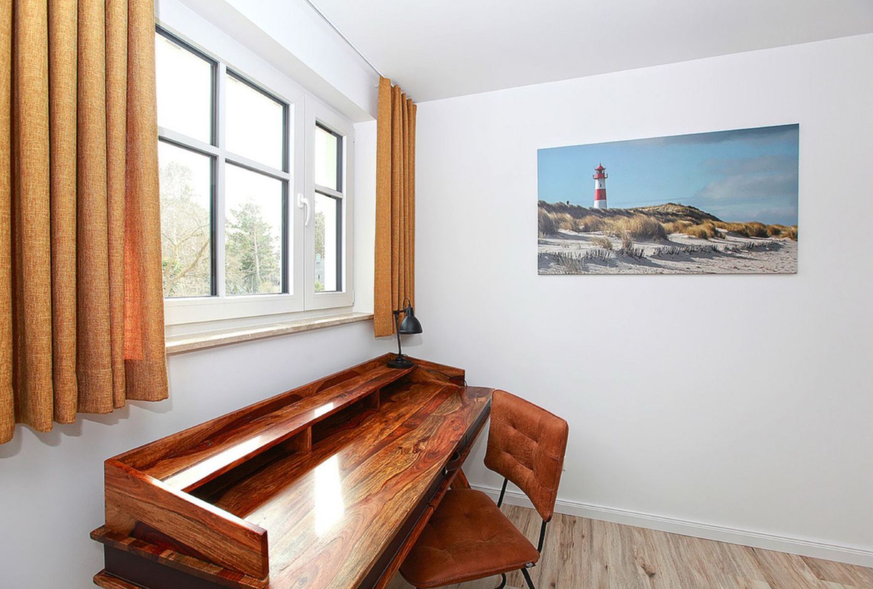 Ein Schlafzimmer mit einem Doppelbett (1,80 × 2,00 m) und einem praktischen Schreibtisch – ideal auch für ruhige Arbeitsstunden oder zum Schreiben.