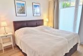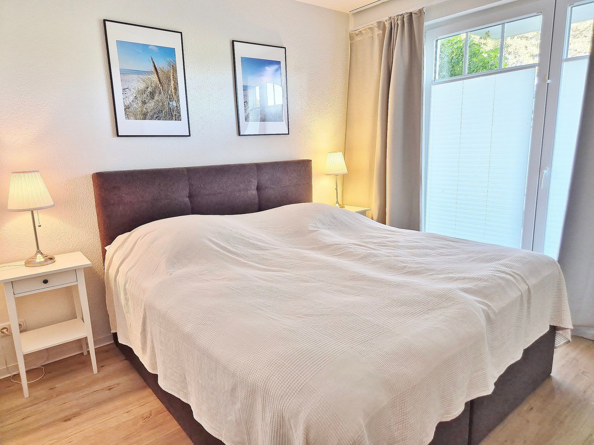 Das einfach eingerichtete Schlafzimmer ist mit einem Doppelbett (180x200cm) und einem Kleiderschrank ausgestattet. Das Fenster lässt sich vollständig verdunkeln.