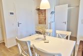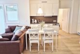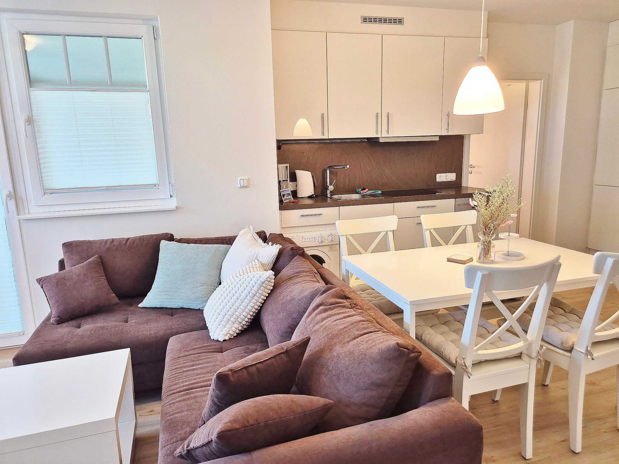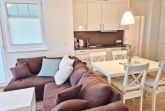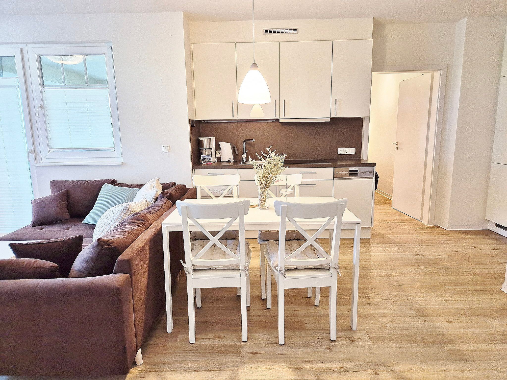 Moderne, komplett eingerichtete, zum Wohn- und Esszimmer offen Küche mit 4 Platten-Cerankochfeld, Backofen, Spülmaschine, Mikrowelle, Kühlschrank mit kleinem 3-Sterne Gefrierfach, Kaffeemaschine, Wasserkocher und Toaster. Außerdem befindet sich in der Küche eine kleine Waschmaschine.