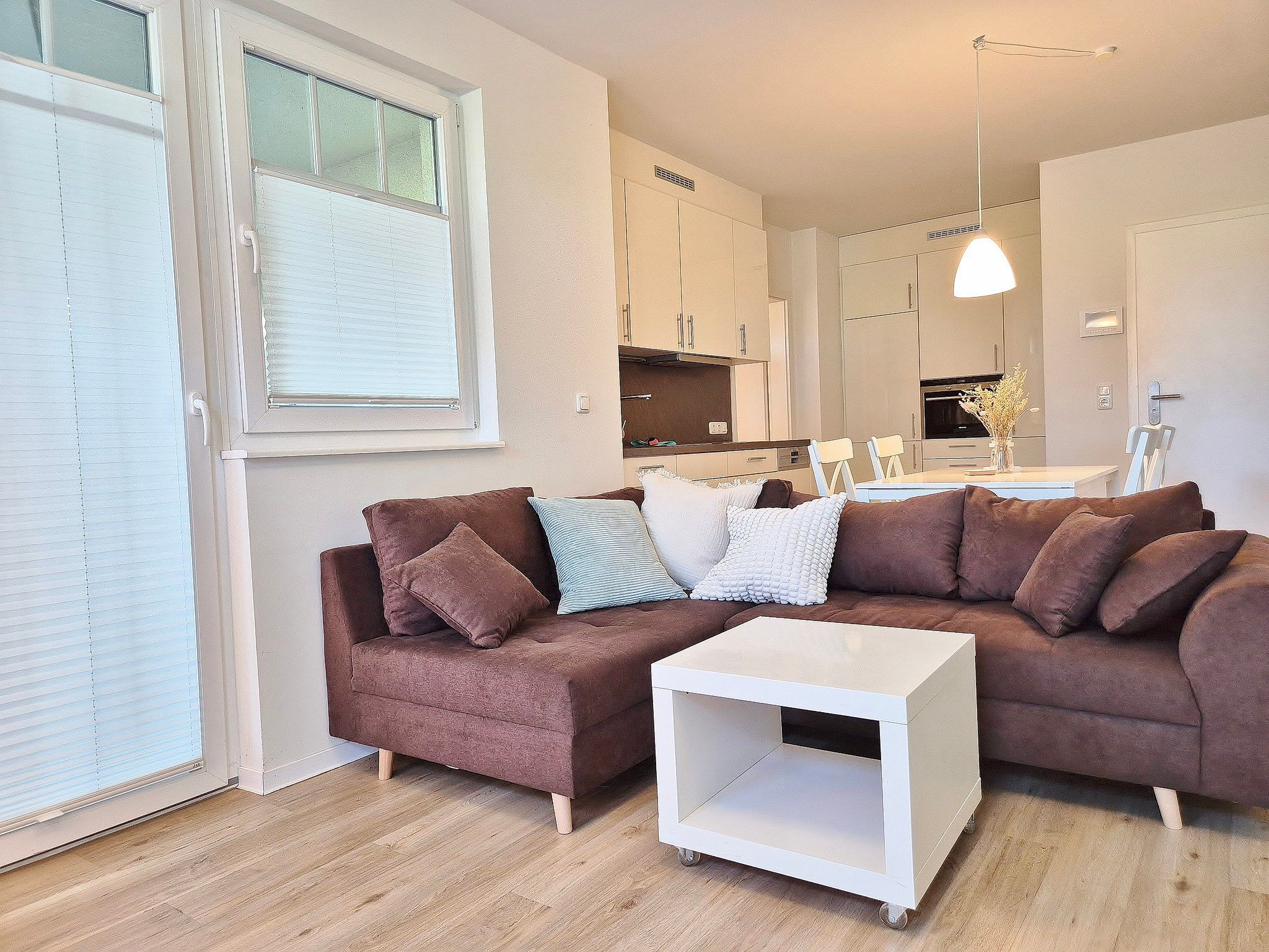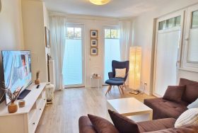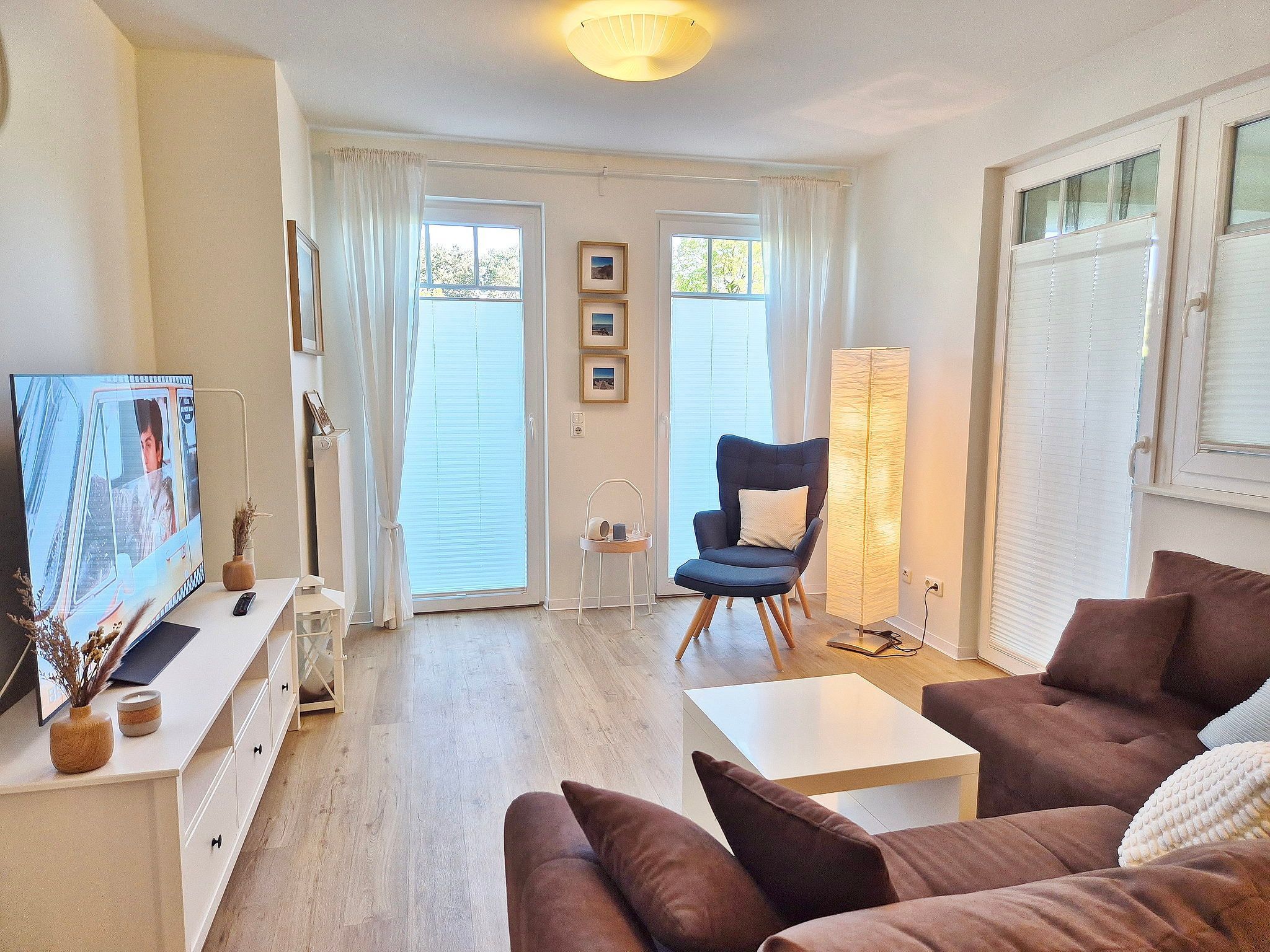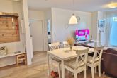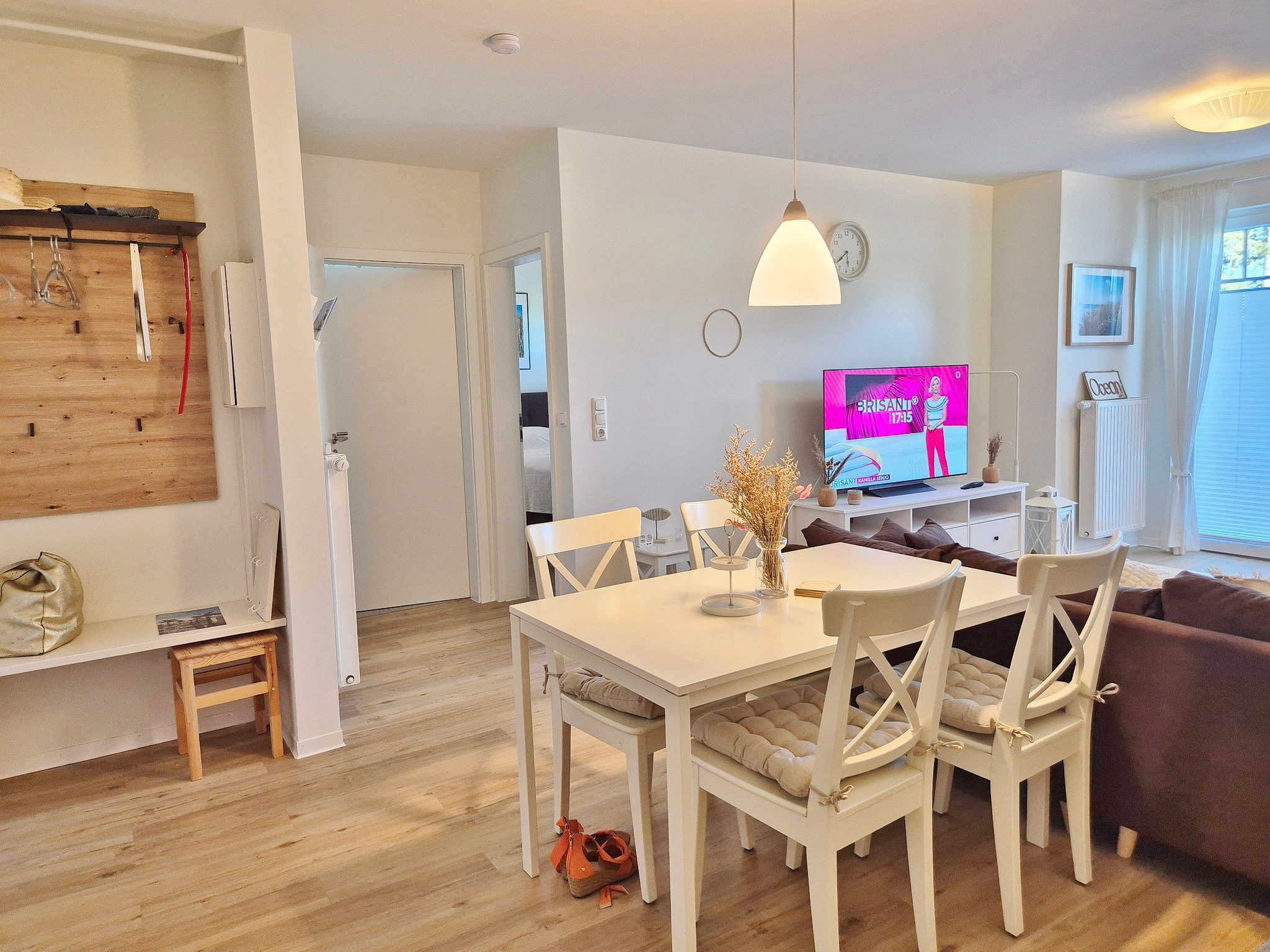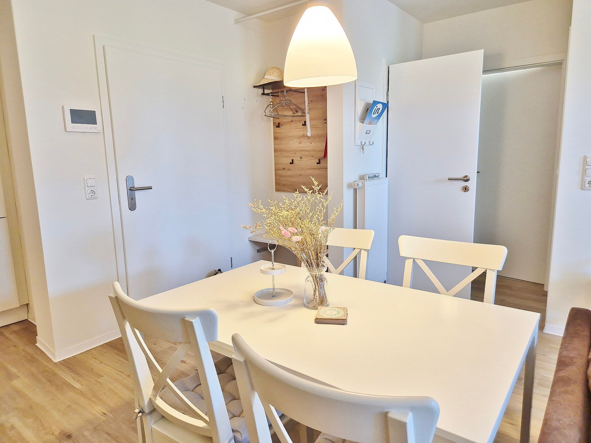 Helles, freundliches, modern und hochwertig ausgestattetes Wohn- und Esszimmer mit direktem Zugang zur Terrasse mit schönem Blick auf den Deich. Das Wohn- und Esszimmer ist mit einer Eckcouch, einem Sessel mit Fußauflage, einem Couchtisch und einem Essplatz für 4 Personen ausgestattet. Zur Unterhaltung stehen ein Flachbildschirm und ein Blu-Ray Player zur Verfügung. An den Fenstern befinden sich Plissees zum Sichtschutz.
