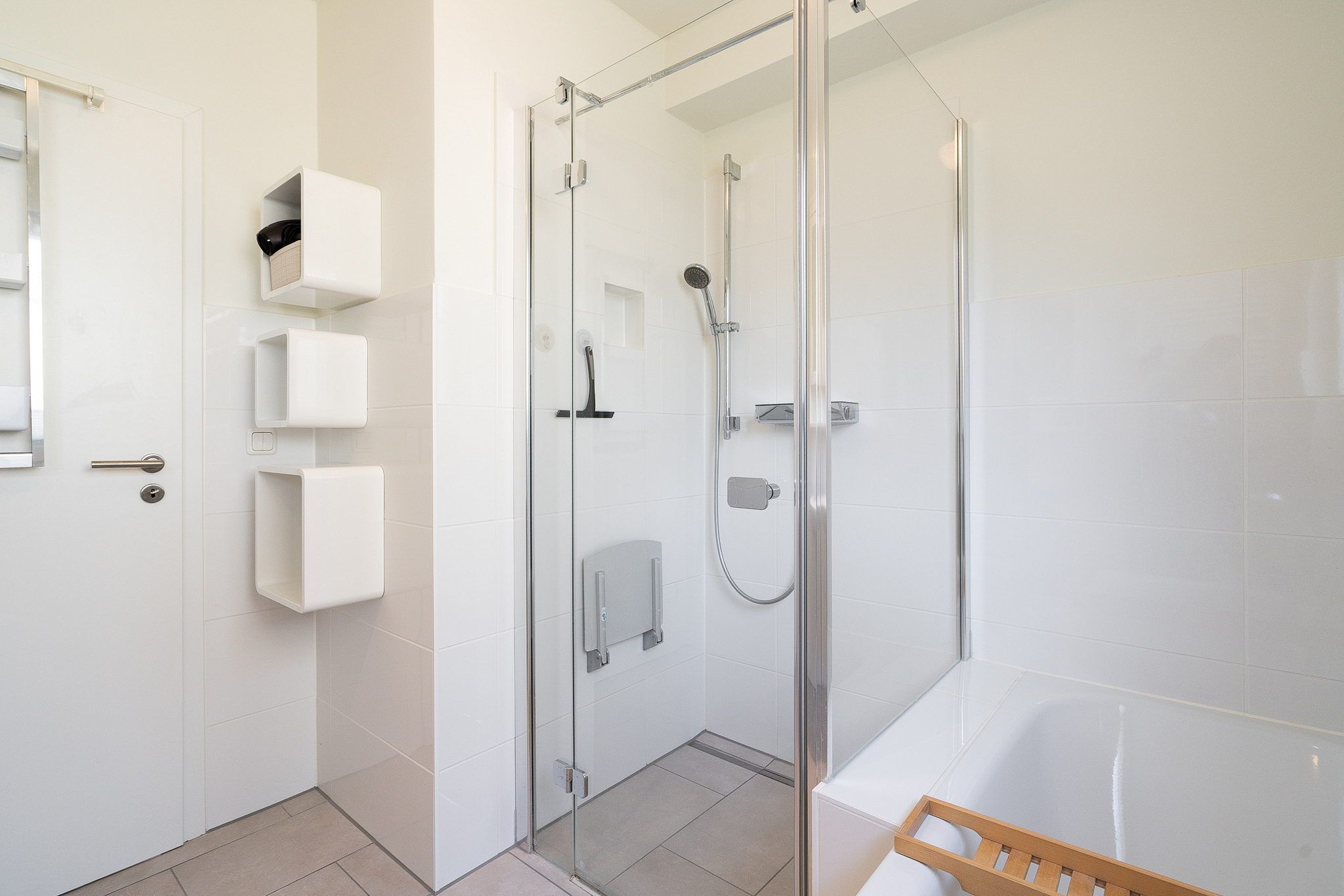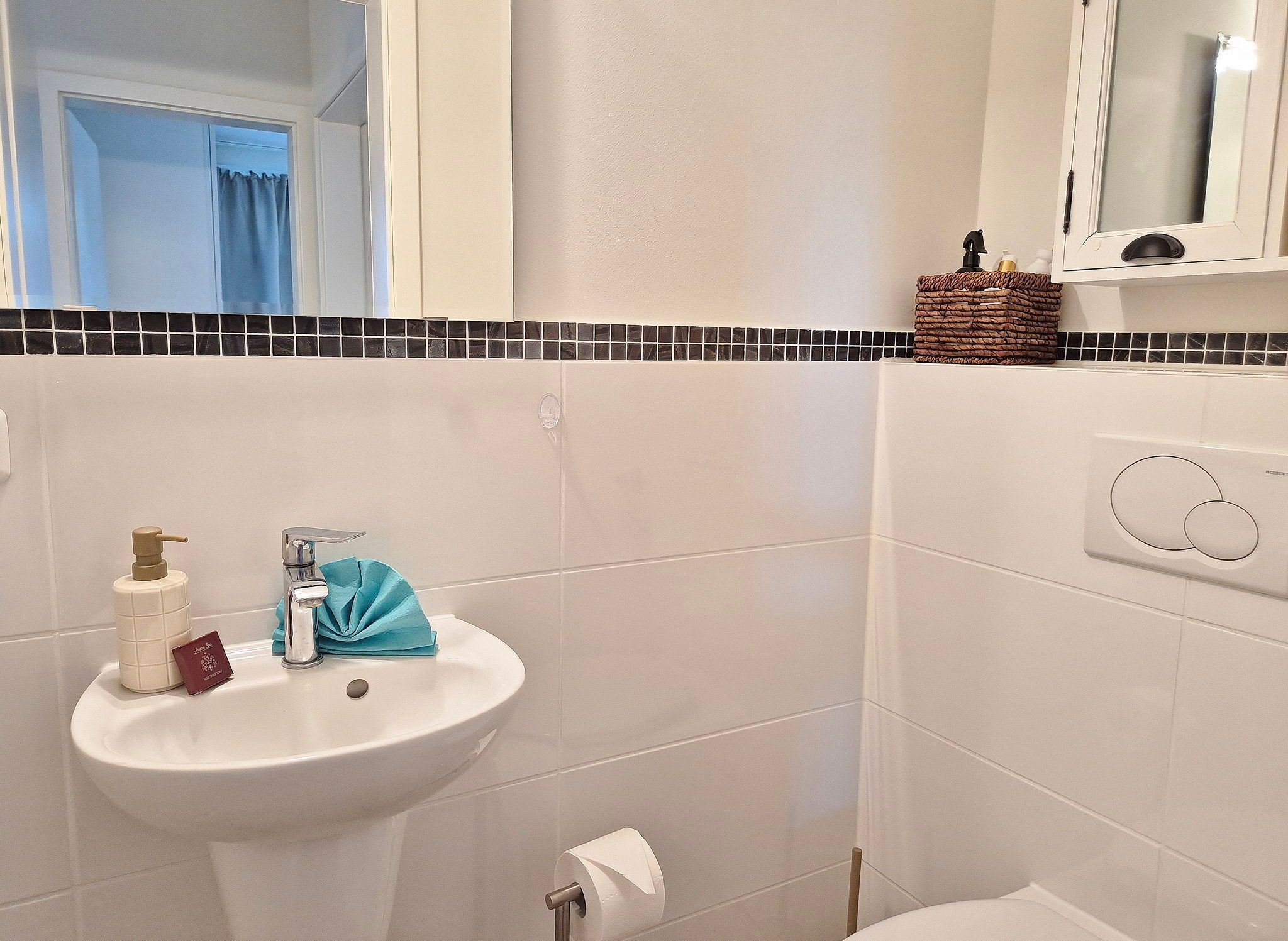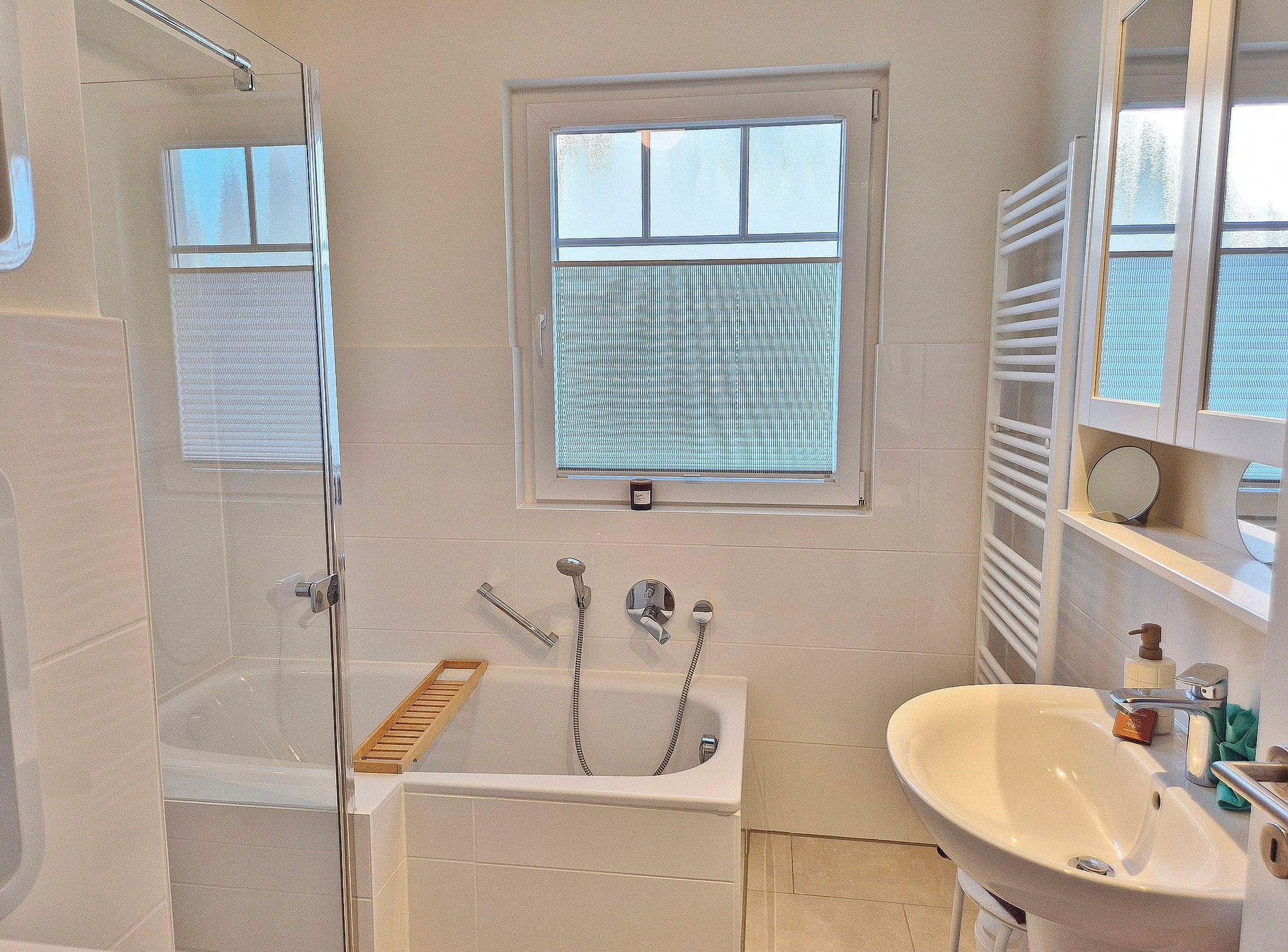 Die Wohnung verfügt über ein Tageslichtbadezimmer mit Dusche, Badewanne und Waschbecken, allerdings ohne WC. Zusätzlich gibt es noch eine separate Toilette mit Waschbecken ohne Fenster.