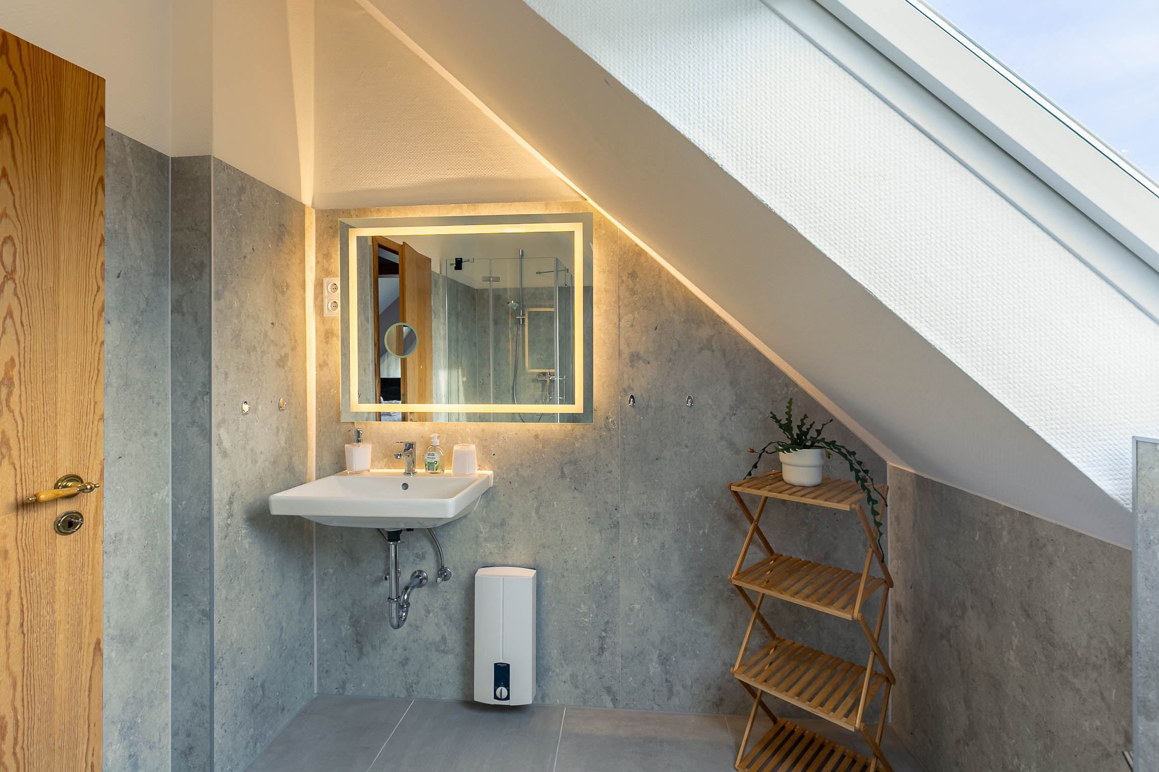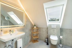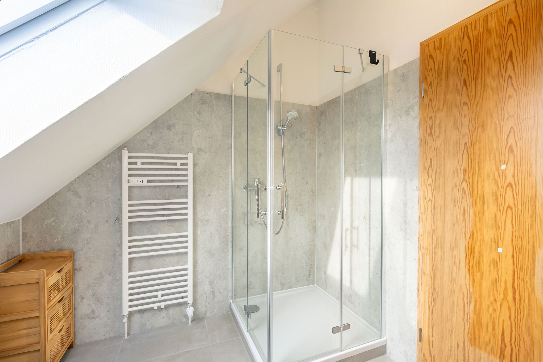 Badezimmer (Duschbad) mit Dusche (90x90cm), WC, Handtuchwärmer und Tageslicht.