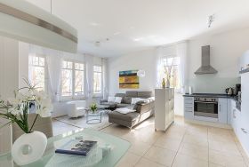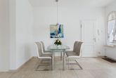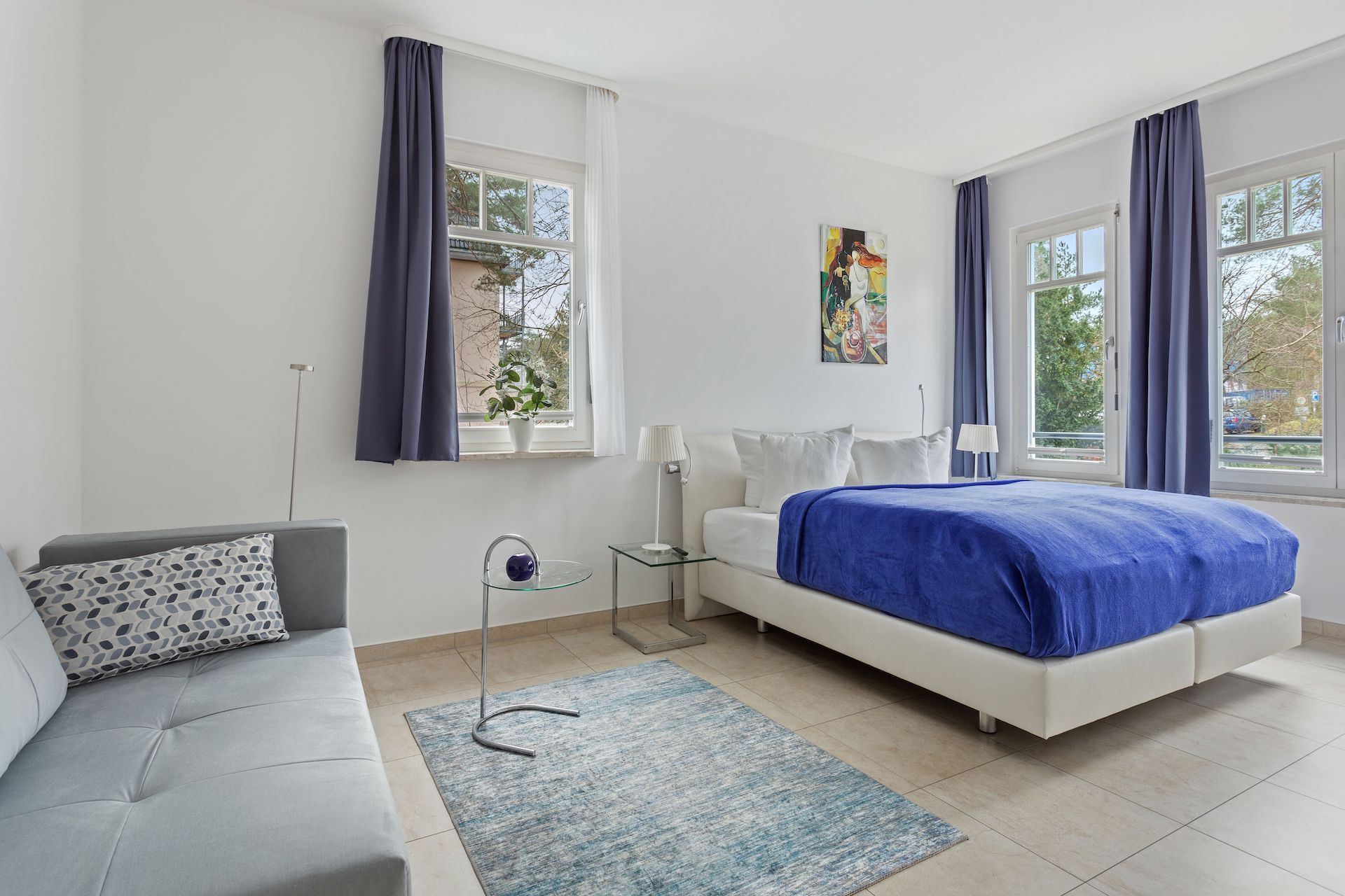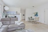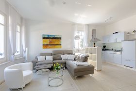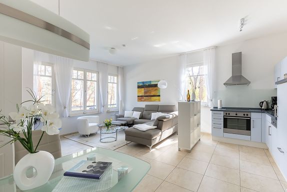 Das 60 m² große 2-Raum-Apartment Düne bietet Ihnen lichtdurchflutete Räume dank vieler Fenster und liegt im gemütlichen Hochparterre perfekt für 2 Erwachsene und 1 Kind bis 16 Jahre. Vom Wohnbereich genießen Sie durch die begrünte Düne einen Blick auf die Ostsee. Im Wohnraum erwarten Sie eine elegante sandgraue Ledercouch, stilvolle Essstühle, ein moderner UHD-LED-TV sowie eine offene, voll ausgestattete Küche. Das Schlafzimmer verwöhnt Sie mit einem komfortablen Boxspringbett (2,00 m x 1,80 m) und einem beleuchteten, 2 m breiten Kleiderschrank. Für Kinder bis 16 Jahre steht hier eine gemütliche Recamiere als zusätzliche Schlafgelegenheit bereit. Da sich unter dem Schlafzimmer der ebenerdige Wellnessbereich befindet, schlafen Sie angenehm erhöht wie im ersten Stock und blicken aus dem Fenster auf einen kleinen Park. Das Badezimmer verfügt über Dusche, Waschtisch, WC, Fenster und praktische Ablagen. Alle Fenster zur Ost- und Südseite sind mit außenliegenden, wärmereflektierenden Sonnenschutzrollos ausgestattet. Das schwellenfreie Apartment bietet durchgehend Fußbodenheizung, zwei gemütliche Außensitzplätze sowie einen PKW-Stellplatz direkt am Haus.