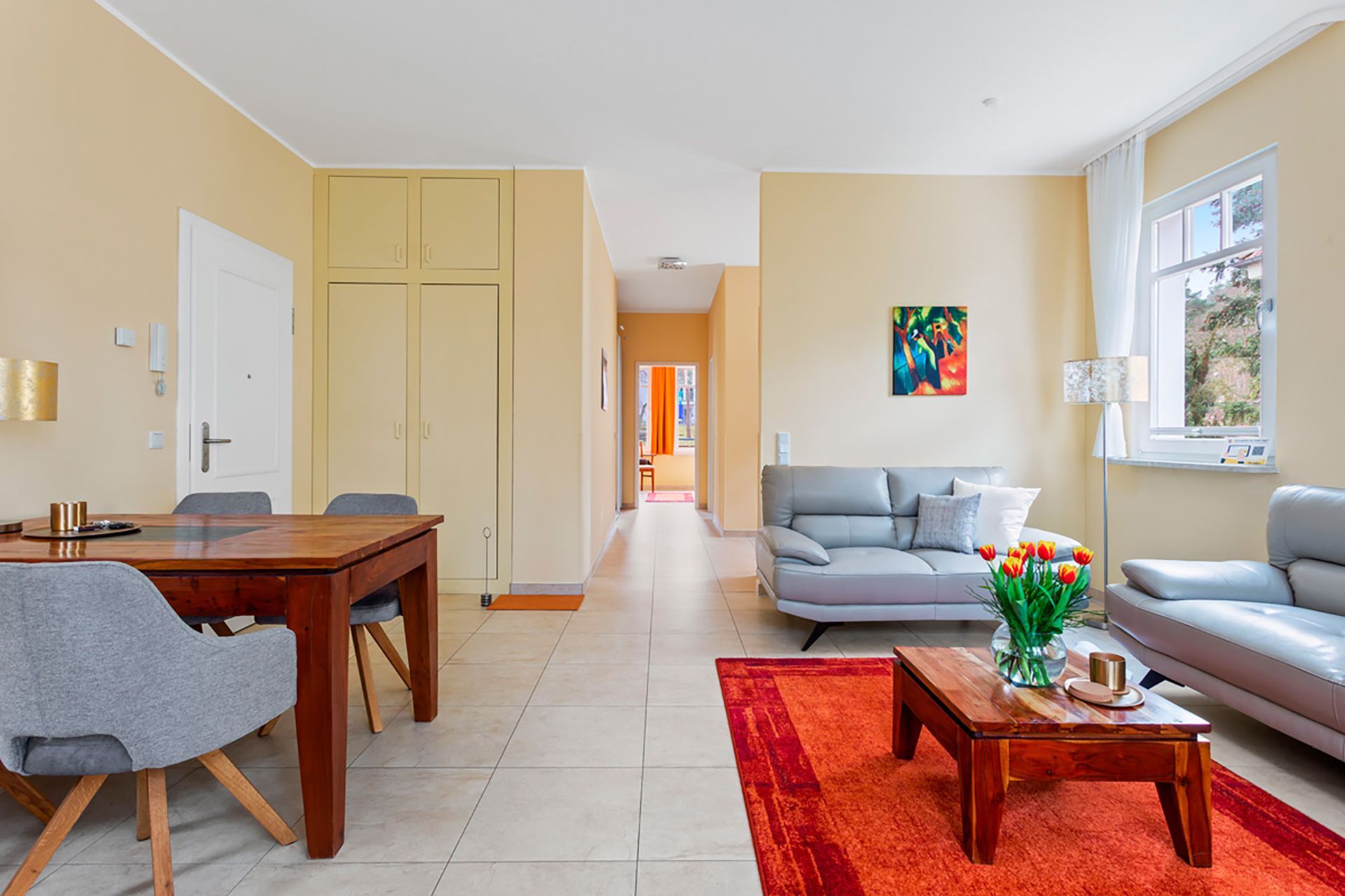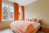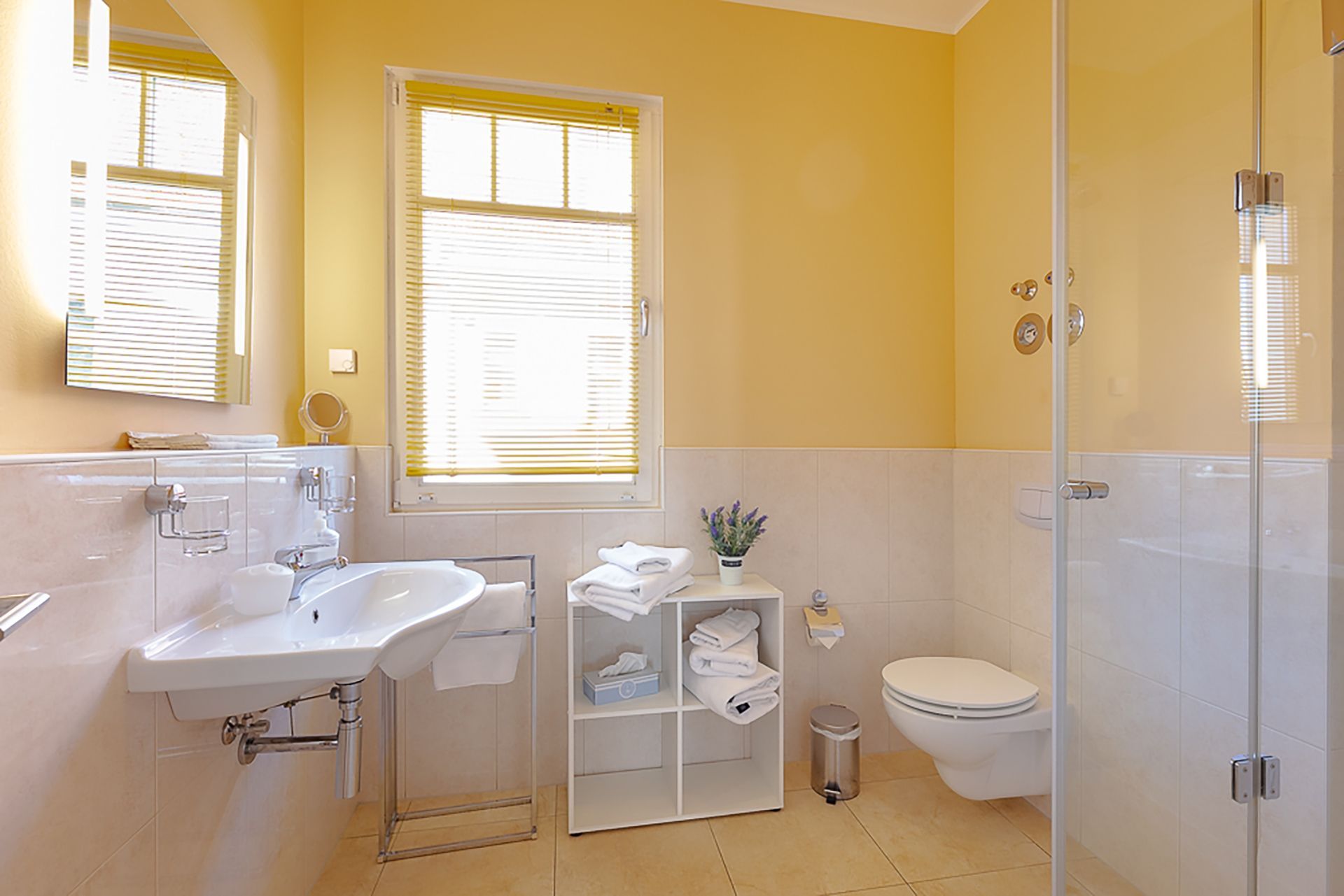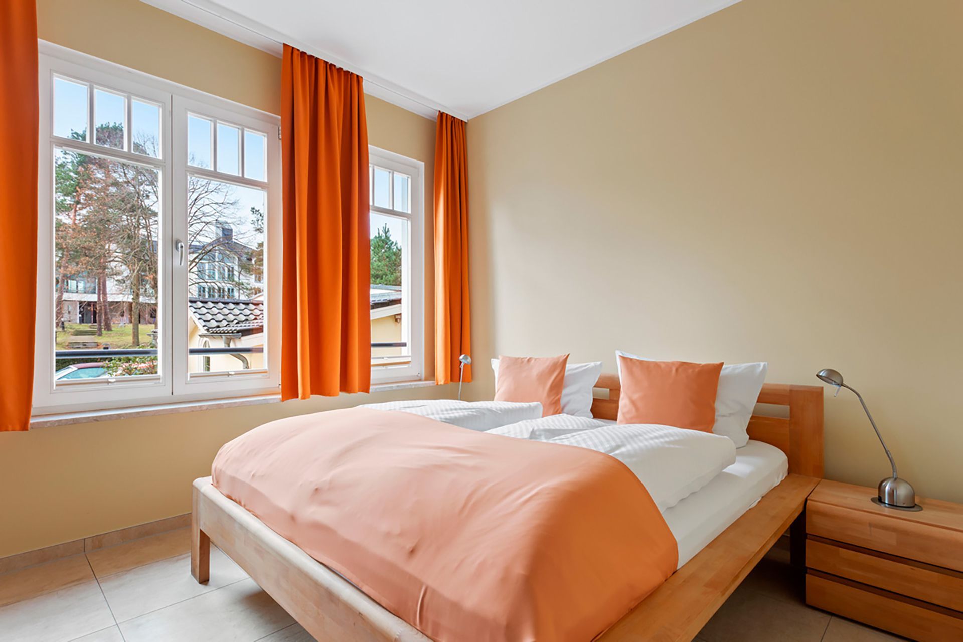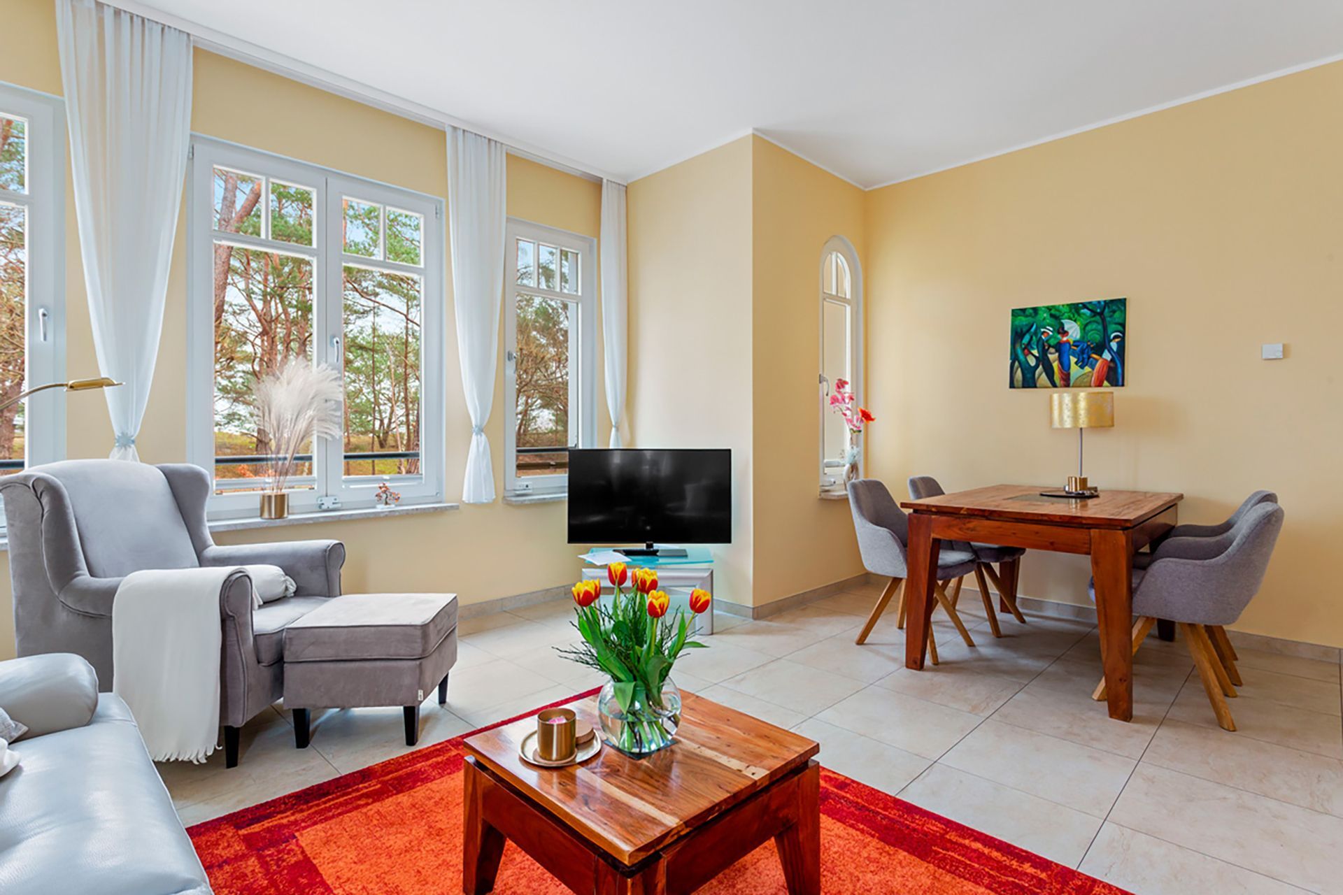 Das 58 m² große 2-Raum-Appartement Bernstein liegt im gemütlichen Hochparterre und ist ideal für 2 Personen. Warme Farben, eine elegante Ledersitzgruppe, bequeme Essstühle, ein Lesesessel und ein moderner UHD-LED-TV sorgen für ein behagliches Ambiente. Direkt vor der Tür erwartet Sie Ihr eigener Außensitzplatz perfekt für entspannte Stunden an der frischen Ostseeluft. Schon beim Eintreten, mit einem Blick nach rechts, können Sie trotz der grünen Düne die Ostsee sehen. Das nach Süden ausgerichtete Schlafzimmer ist mit außenliegenden, wärmereflektierenden Sonnenschutzrollos ausgestattet. Da sich darunter der Wellnessbereich des Hauses befindet, schlafen Sie angenehm erhöht wie im ersten Stock. Das komfortable Doppelbett (2,00 m x 1,80 m) wird ergänzt durch ein stilvolles Gründerzeit-Vertigo und bietet zudem Platz für ein Kinderreisebett. Ein 2 m breiter Kleiderschrank befindet sich platzsparend in einer Nische im Flur, direkt gegenüber vom Badezimmer. Das Bad ist mit Dusche, Waschtisch, WC, großzügigem Fenster und praktischen Ablagen ausgestattet. Die separate Küche ist vollständig für 23 Personen eingerichtet und bietet alles, was Sie für Ihren Aufenthalt benötigen. Ein PKW-Stellplatz direkt am Haus rundet das Angebot ab.