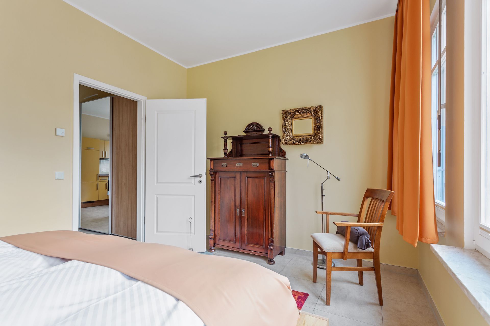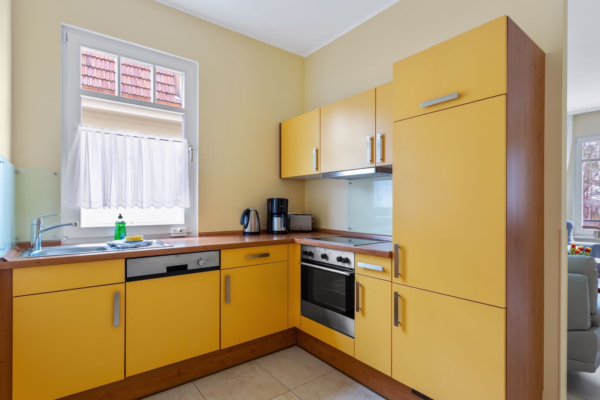 Das 58 m² große 2-Raum-Appartement „Bernstein“ liegt im gemütlichen Hochparterre und ist ideal für 2 Personen. Warme Farben, eine elegante Ledersitzgruppe, bequeme Essstühle, ein Lesesessel und ein moderner UHD-LED-TV sorgen für ein behagliches Ambiente. Direkt vor der Tür erwartet Sie Ihr eigener Außensitzplatz perfekt für entspannte Stunden an der frischen Ostseeluft. Schon beim Eintreten, mit einem Blick nach rechts, können Sie trotz der grünen Düne die Ostsee sehen. Das nach Süden ausgerichtete Schlafzimmer ist mit außenliegenden, wärmereflektierenden Sonnenschutzrollos ausgestattet. Da sich darunter der Wellnessbereich des Hauses befindet, schlafen Sie angenehm erhöht wie im ersten Stock. Das komfortable Doppelbett (2,00 m x 1,80 m) wird ergänzt durch ein stilvolles Gründerzeit-Vertigo und bietet zudem Platz für ein Kinderreisebett. Ein 2 m breiter Kleiderschrank befindet sich platzsparend in einer Nische im Flur, direkt gegenüber vom Badezimmer. Das Bad ist mit Dusche, Waschtisch, WC, großzügigem Fenster und praktischen Ablagen ausgestattet. Die separate Küche ist vollständig für 23 Personen eingerichtet und bietet alles, was Sie für Ihren Aufenthalt benötigen. Ein PKW-Stellplatz direkt am Haus rundet das Angebot ab.