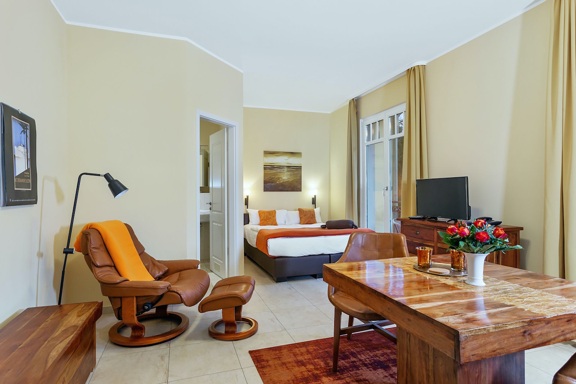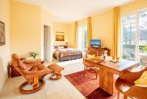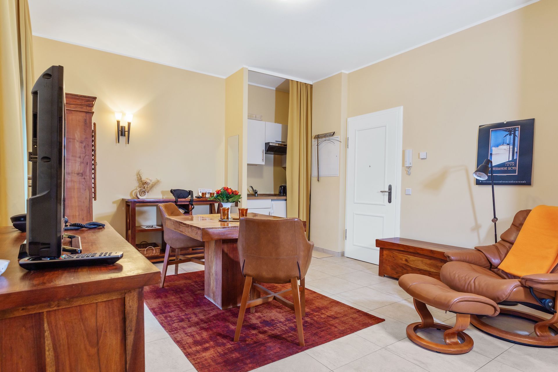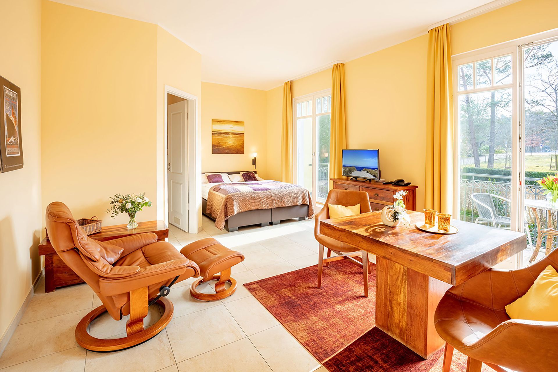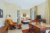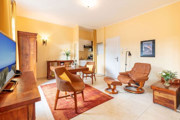 Das 31 m² große 1-Raum-Appartement Wiek liegt im gemütlichen Hochparterre und ist ideal für 2 Personen. Highlight ist der großzügige Südbalkon, der sich über die gesamte Breite des Apartments erstreckt perfekt für sonnige Stunden und den Blick ins Grüne. Im bequemen Stressless-Sessel mit Hocker können Sie entspannt lesen, fernsehen oder einfach den Vögeln im Garten zusehen. Die Einrichtung in warmen goldbraunen Tönen mit Echtholzmöbeln, UHD-LED-TV, einem Esstisch mit komfortablen Stuhlsesseln sowie einer 1,20 m breiten Küchenzeile schafft eine behagliche Atmosphäre. Das 1,60 m breite Boxspringbett sorgt für erholsamen Schlaf. Ergänzt wird es durch Kommoden, ein Regal und einen Kleiderschrank mit integriertem Safe. Geschirr für zwei Personen ist selbstverständlich vorhanden. Die beiden Balkontüren sind mit außenliegenden, wärmereflektierenden Sonnenschutzrollos ausgestattet. Das moderne Bad verfügt über eine Dusche, beheizbaren Handtuchtrockner und wie das gesamte Appartement über eine angenehme Fußbodenheizung. Da sich unter dem Appartement der Wellnessbereich des Hauses befindet, wohnen Sie angenehm erhöht wie im ersten Stock. Direkt neben Ihrer Wohnungstür steht Ihnen eine kleine Abstellkammer für leere Gepäckstücke zur Verfügung. Ein PKW-Stellplatz auf dem Hof ist im Preis inbegriffen.