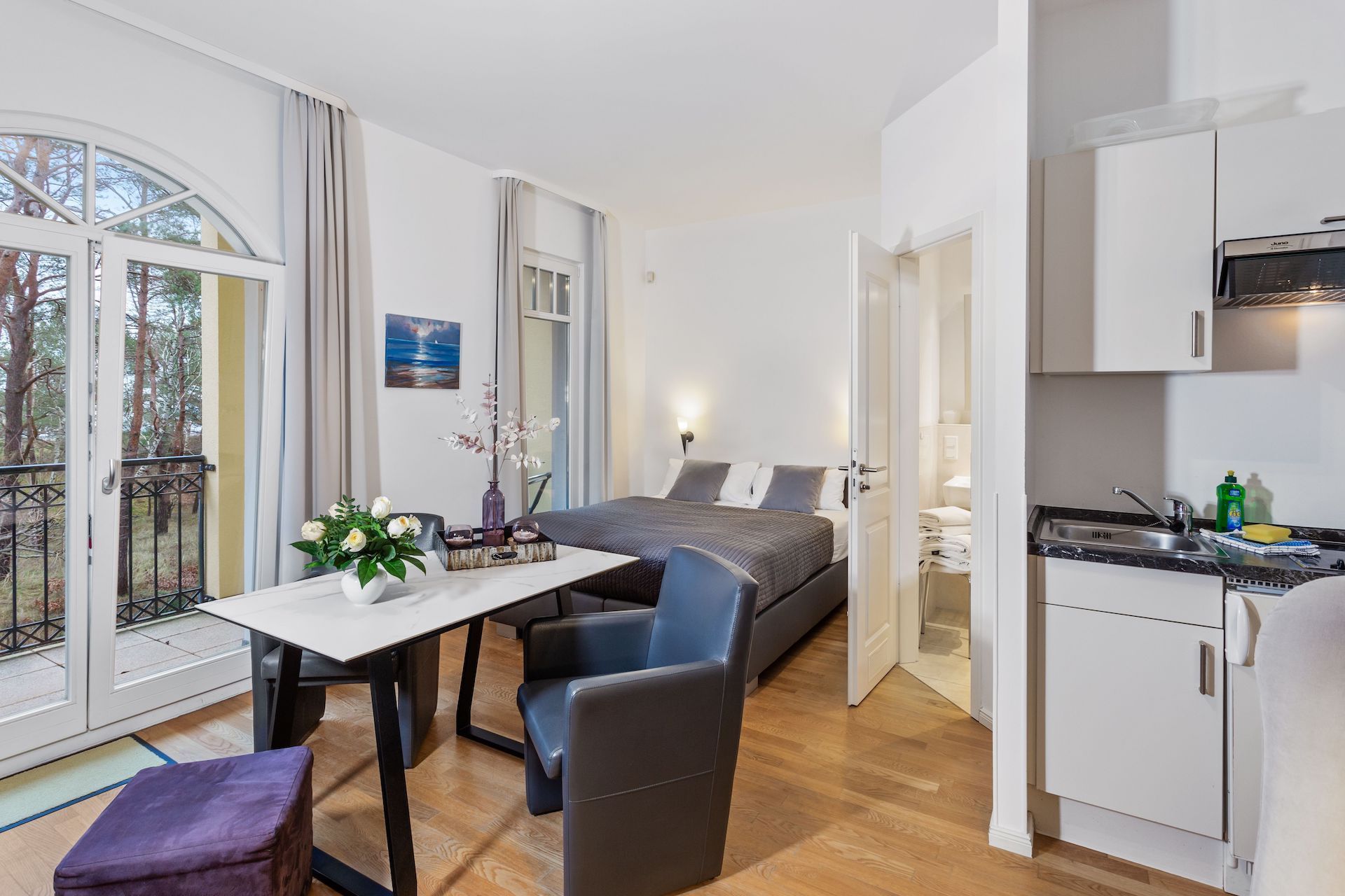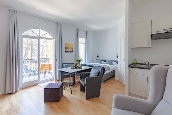 Das 25 m² große 1-Raum-Appartement Oie in der 2. Etage begrüßt Sie mit dem beruhigenden Klang der Ostseewellen. Im Sommer erleben Sie den Sonnenaufgang bequem aus dem Bett ein perfekter Start in den Tag. Der über die gesamte Breite des Appartements reichende, eingebaute Balkon lädt zu gemütlichen Stunden ein, ob mit Sonnenhut oder Kuscheldecke. Vom bequemen Ohrensessel genießen Sie den Blick aufs Meer, während Sie lesen, fernsehen oder einfach entspannen. Die kompakte Küchenzeile (1 m breit) mit 2-Platten-Cerankochfeld, Spüle und Kühlschrank mit Gefrierfach ist mit allem ausgestattet, was Sie für die Zubereitung kleiner Mahlzeiten zu zweit benötigen. Als Gast haben Sie jederzeit Zugang zum hauseigenen Wellnessbereich mit Ruheraum ideal zum Lesen, Entspannen oder einfach zum Abschalten nach einem Strandtag. Ihre leeren Gepäckstücke können Sie bequem in einer Abstellkammer auf derselben Etage unterbringen. Ein eigener PKW-Stellplatz am Haus steht Ihnen während des gesamten Aufenthalts zur Verfügung.