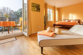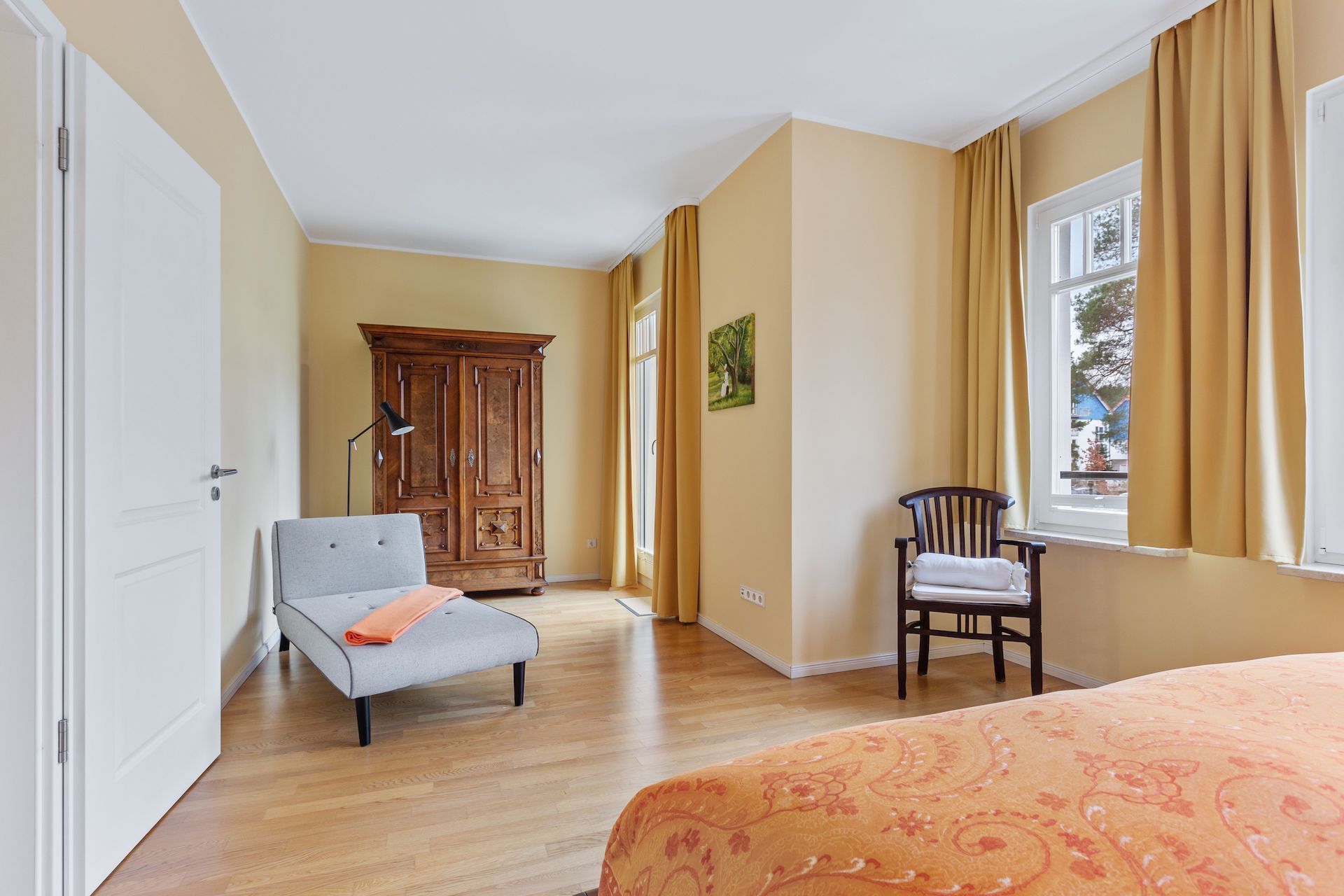 Willkommen im 71 m² großen 2-Raum-Apartment „Vilm“ im 2. Obergeschoss ideal für 2 Erwachsene und 1 Kind bis 16 Jahre. Lichtdurchflutete Räume, zwei Balkone und stilvolle Details machen dieses Urlaubsdomizil zu einem besonderen Rückzugsort. Beginnen Sie den Tag auf dem Balkon am Wohnzimmer zur Seeseite bei Frühstück und Morgensonne, während Sie den Blick zur Ostsee schweifen lassen. Am Abend genießen Sie auf dem Südbalkon am Schlafzimmer die warmen Sonnenstrahlen und den Blick auf einen kleinen Park. Das Apartment kombiniert moderne Ausstattung mit liebevoll ausgewählten antiken Einzelstücken. Im Wohnbereich erwarten Sie eine bequeme Ledercouch, ein Stressless-Relaxsessel, UHD-LED-TV sowie ein separater Essplatz. Das geräumige Schlafzimmer bietet ein komfortables Doppelbett, eine Relaxliege (geeignet als Aufbettung für Kinder bis 16 Jahre) sowie viel Stauraum durch Schränke und einen Wandschrank mit Safe. Das großzügige Badezimmer verfügt über Dusche, Badewanne, Waschtisch, WC und Tageslichtfenster. Für angenehme Wohnatmosphäre sorgen Echtholzparkett in allen Zimmern, schwellenfreier Zugang und Fußbodenheizung im gesamten Appartement. Ein eigener PKW-Stellplatz am Haus rundet das Angebot ab. Hier wohnen Sie hell, stilvoll und nur einen Augenblick vom Ostseestrand entfernt perfekt für erholsame Tage und lange Abende mit Meerblick.