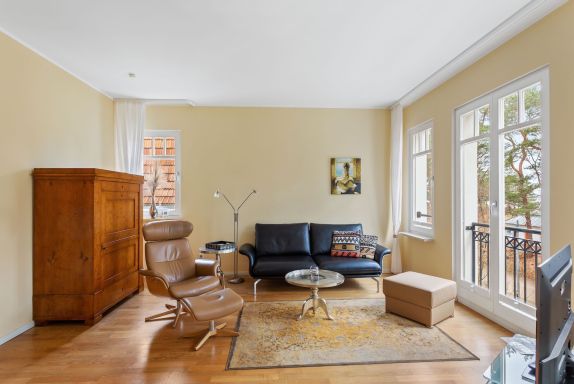 Willkommen im 71 m² großen 2-Raum-Apartment Vilm im 2. Obergeschoss ideal für 2 Erwachsene und 1 Kind bis 16 Jahre. Lichtdurchflutete Räume, zwei Balkone und stilvolle Details machen dieses Urlaubsdomizil zu einem besonderen Rückzugsort. Beginnen Sie den Tag auf dem Balkon am Wohnzimmer zur Seeseite bei Frühstück und Morgensonne, während Sie den Blick zur Ostsee schweifen lassen. Am Abend genießen Sie auf dem Südbalkon am Schlafzimmer die warmen Sonnenstrahlen und den Blick auf einen kleinen Park. Das Apartment kombiniert moderne Ausstattung mit liebevoll ausgewählten antiken Einzelstücken. Im Wohnbereich erwarten Sie eine bequeme Ledercouch, ein Stressless-Relaxsessel, UHD-LED-TV sowie ein separater Essplatz. Das geräumige Schlafzimmer bietet ein komfortables Doppelbett, eine Relaxliege (geeignet als Aufbettung für Kinder bis 16 Jahre) sowie viel Stauraum durch Schränke und einen Wandschrank mit Safe. Das großzügige Badezimmer verfügt über Dusche, Badewanne, Waschtisch, WC und Tageslichtfenster. Für angenehme Wohnatmosphäre sorgen Echtholzparkett in allen Zimmern, schwellenfreier Zugang und Fußbodenheizung im gesamten Appartement. Ein eigener PKW-Stellplatz am Haus rundet das Angebot ab. Hier wohnen Sie hell, stilvoll und nur einen Augenblick vom Ostseestrand entfernt perfekt für erholsame Tage und lange Abende mit Meerblick.