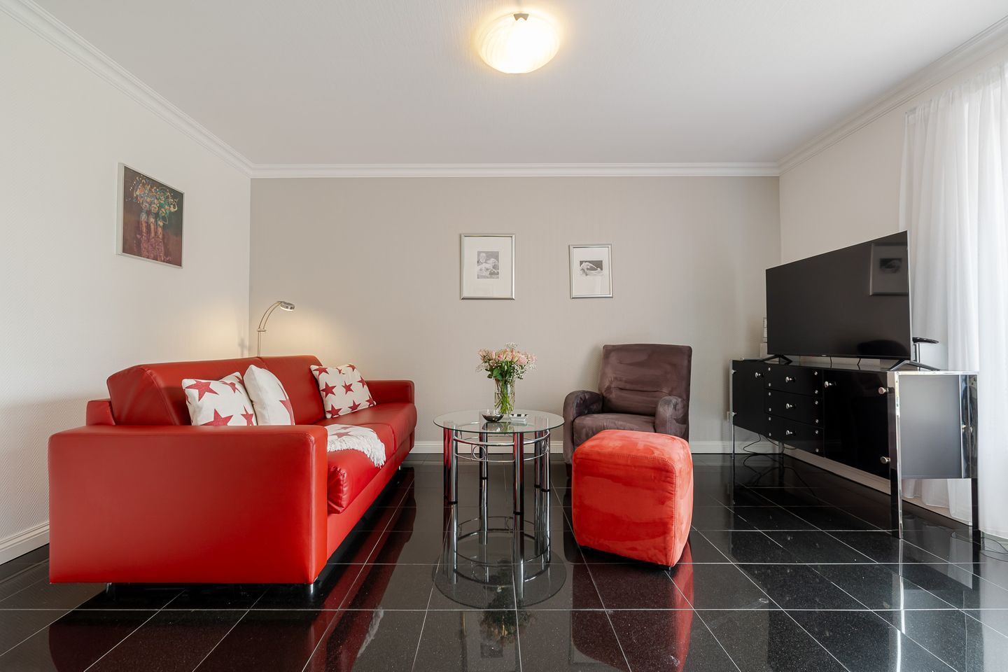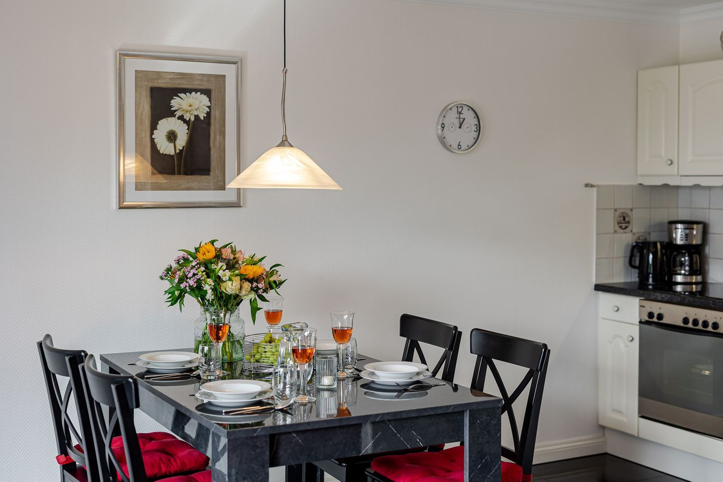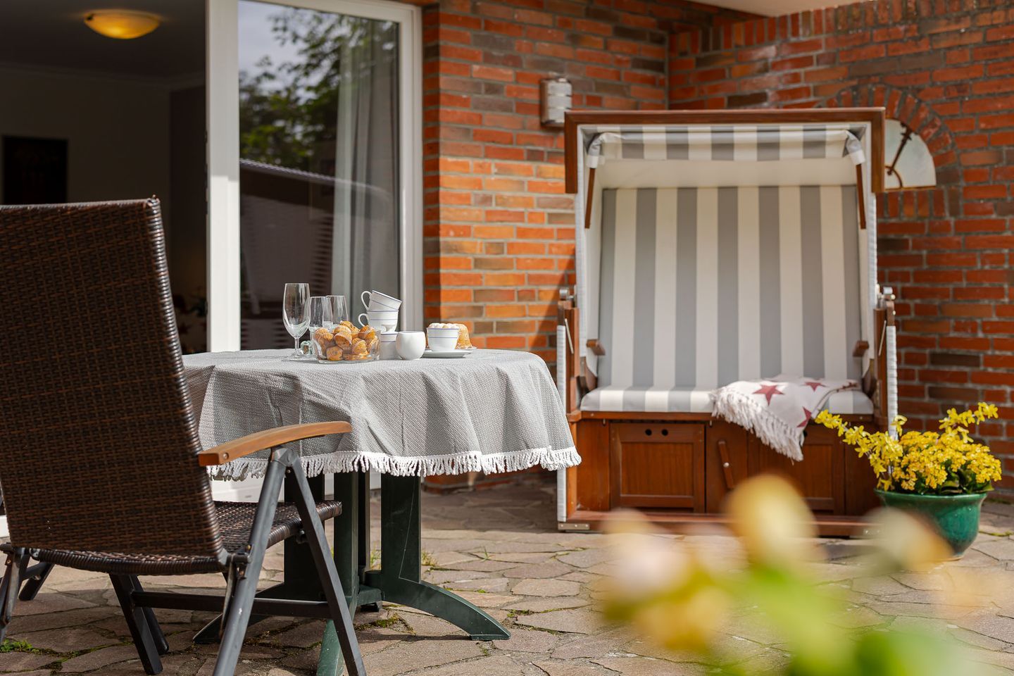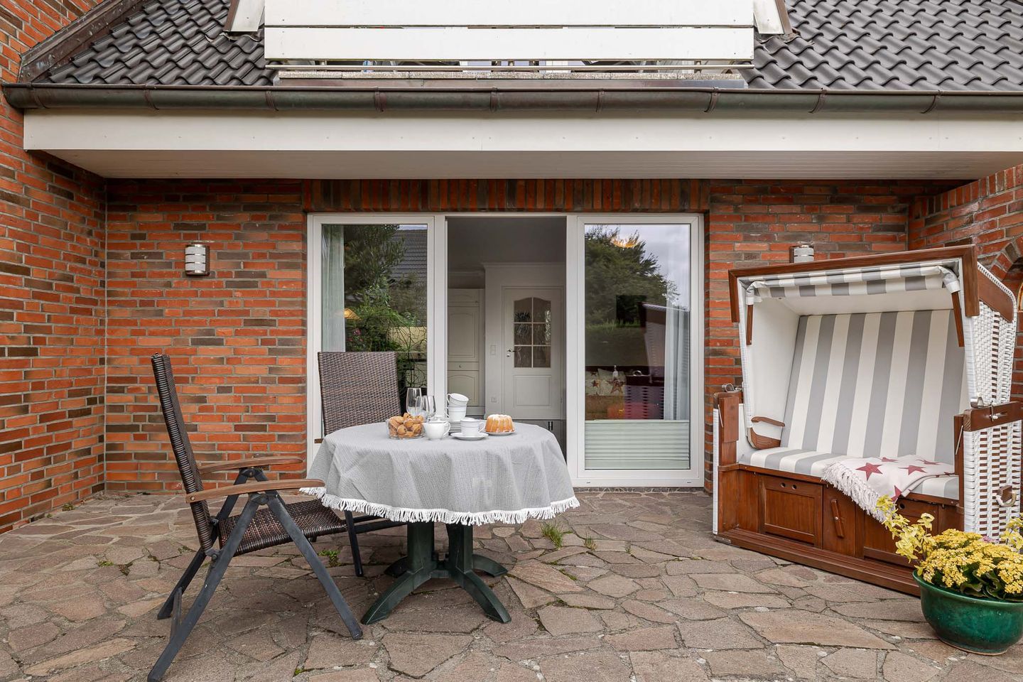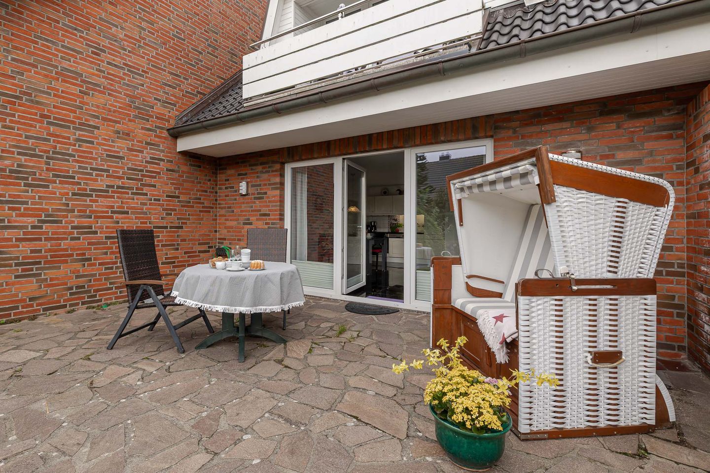 Im Wohnzimmer erwarten Sie ein Kabel-TV und eine Musikanlage für entspannte Stunden. Die Couch im Wohnbereich lässt sich bei Bedarf zu einem Doppelbett umfunktionieren und sorgt so für zusätzliche Flexibilität. Die möblierte Südterrasse mit eigenem Strandkorb ist das Herzstück der Wohnung – hier können Sie die Sylter Sonne und die frische Meeresbrise in vollen Zügen genießen.