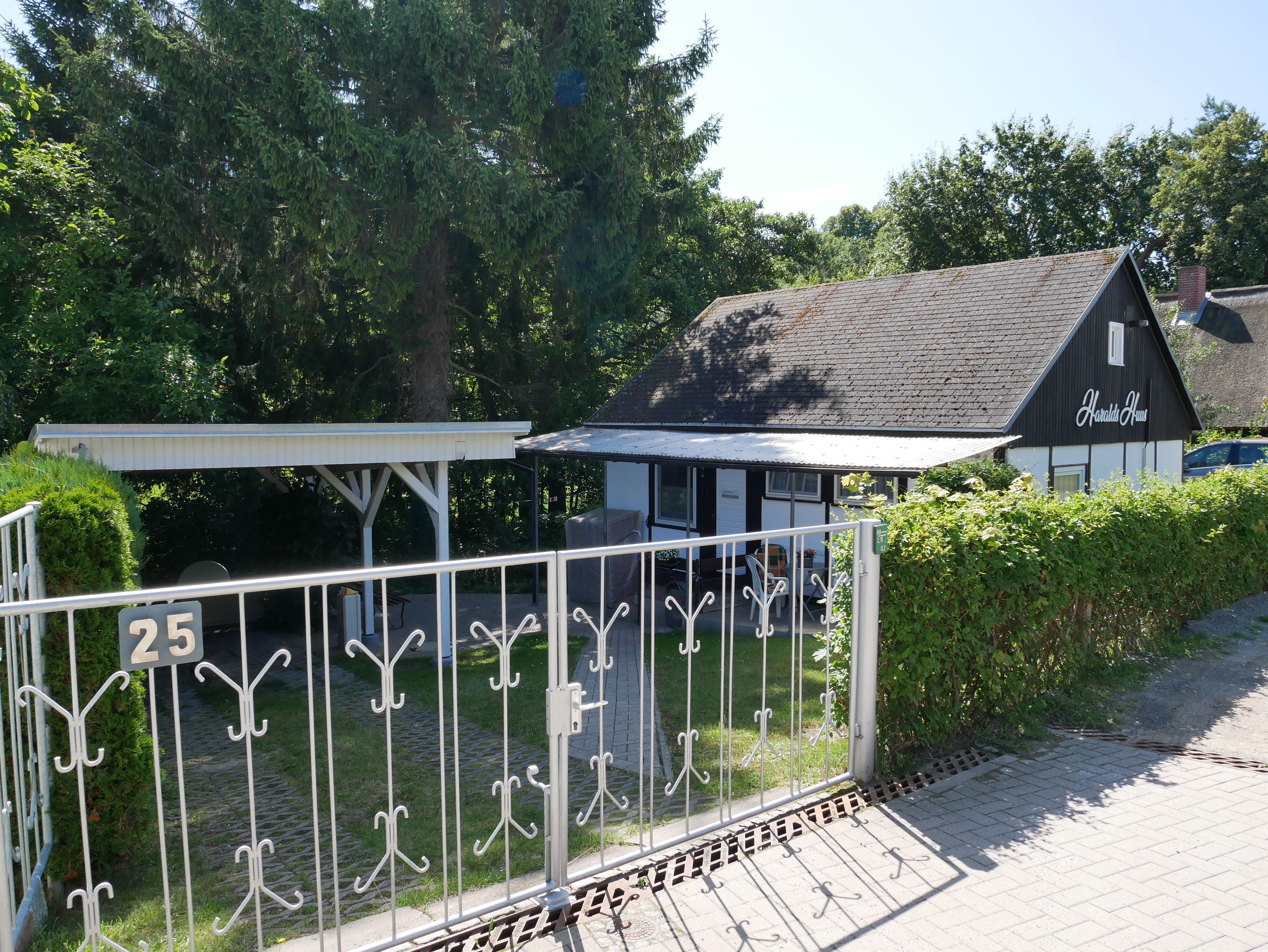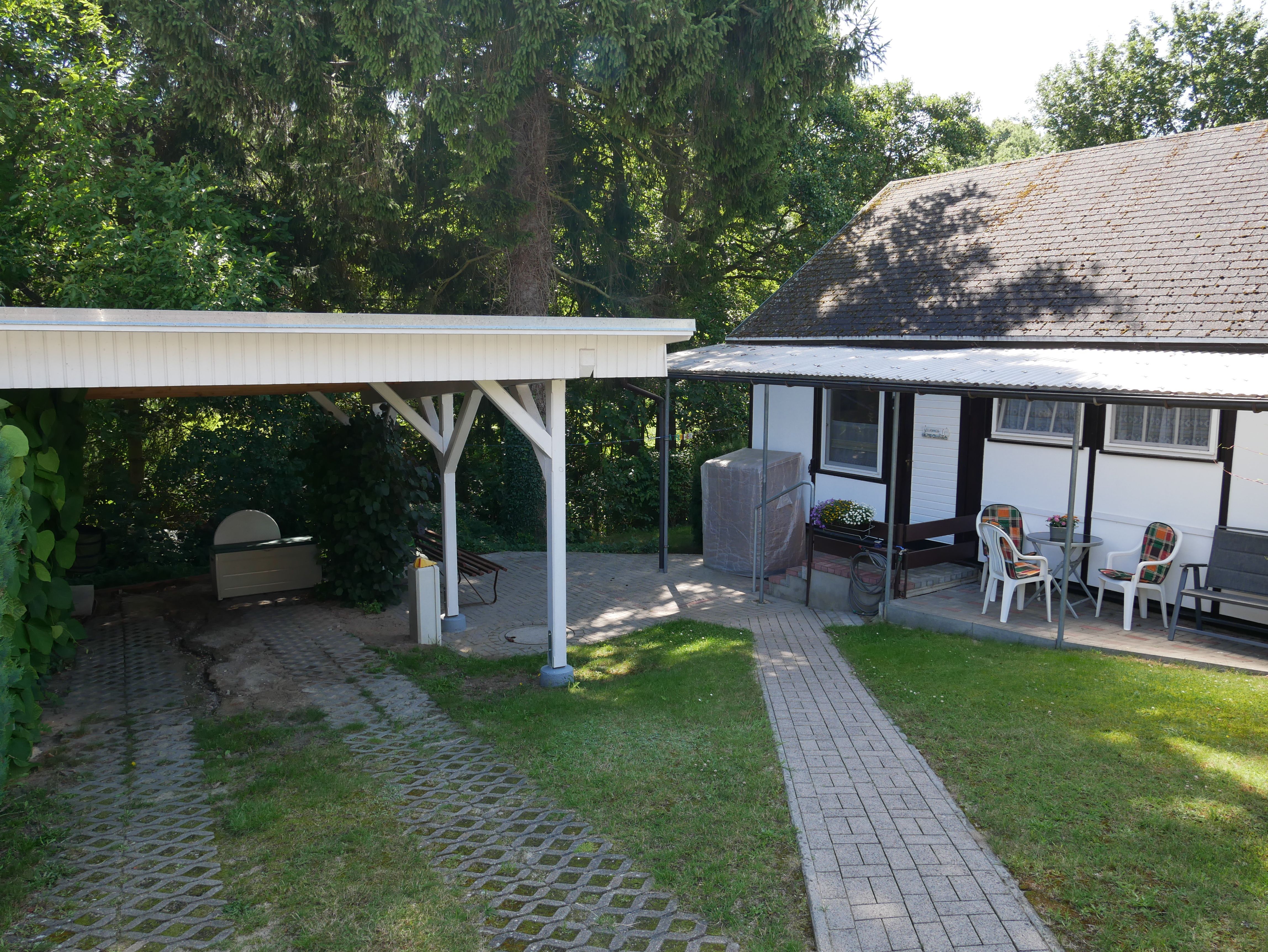 Vor dem Haus finden Sie eine überdachte, möblierte Terrasse. Ihren PKW und Ihre Fahrräder können Sie unter dem Carport abstellen.