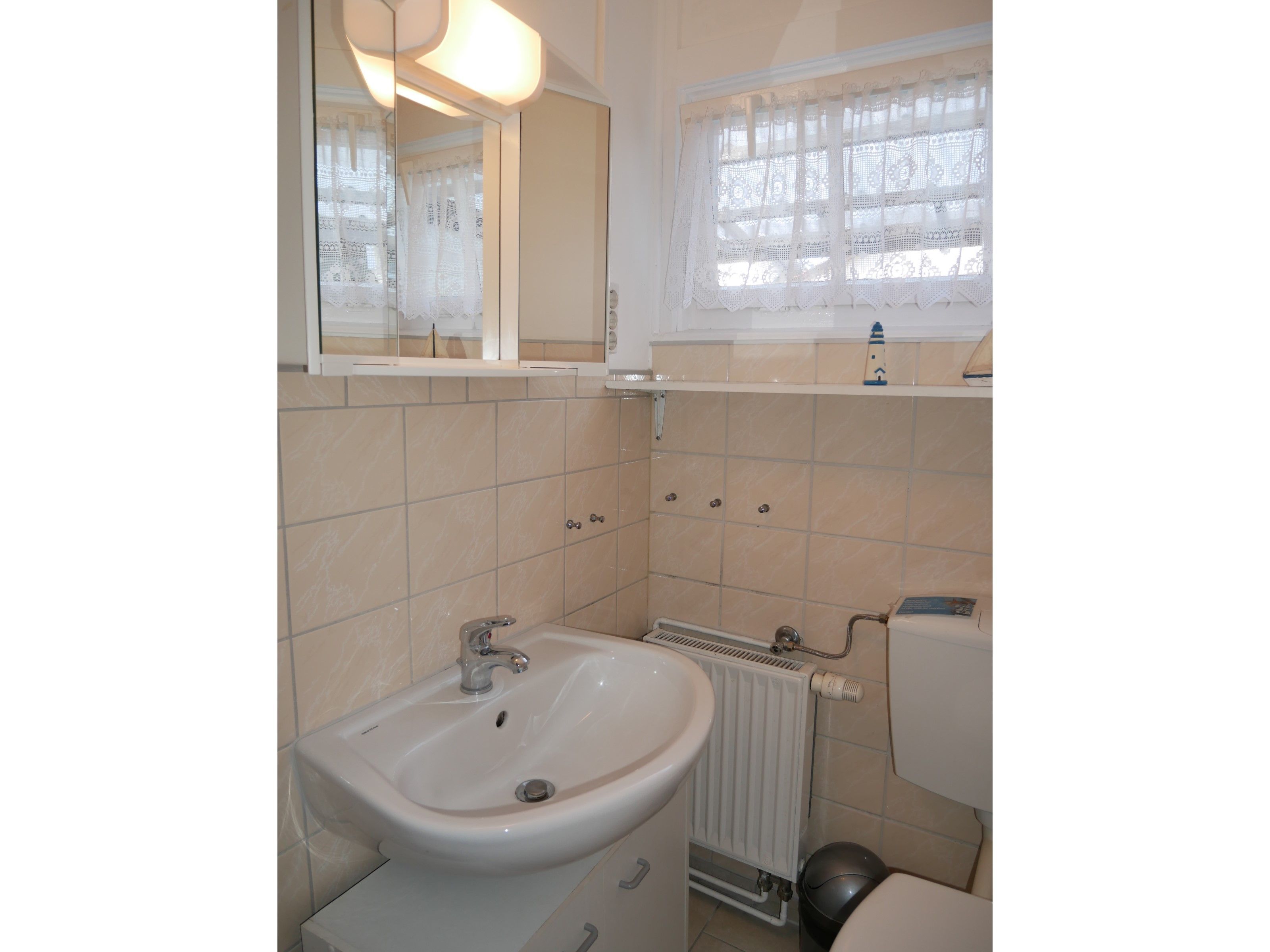 Ein Bad mit Waschbecken, WC und Spiegelschrank befindet sich einem weiteren Zimmer.