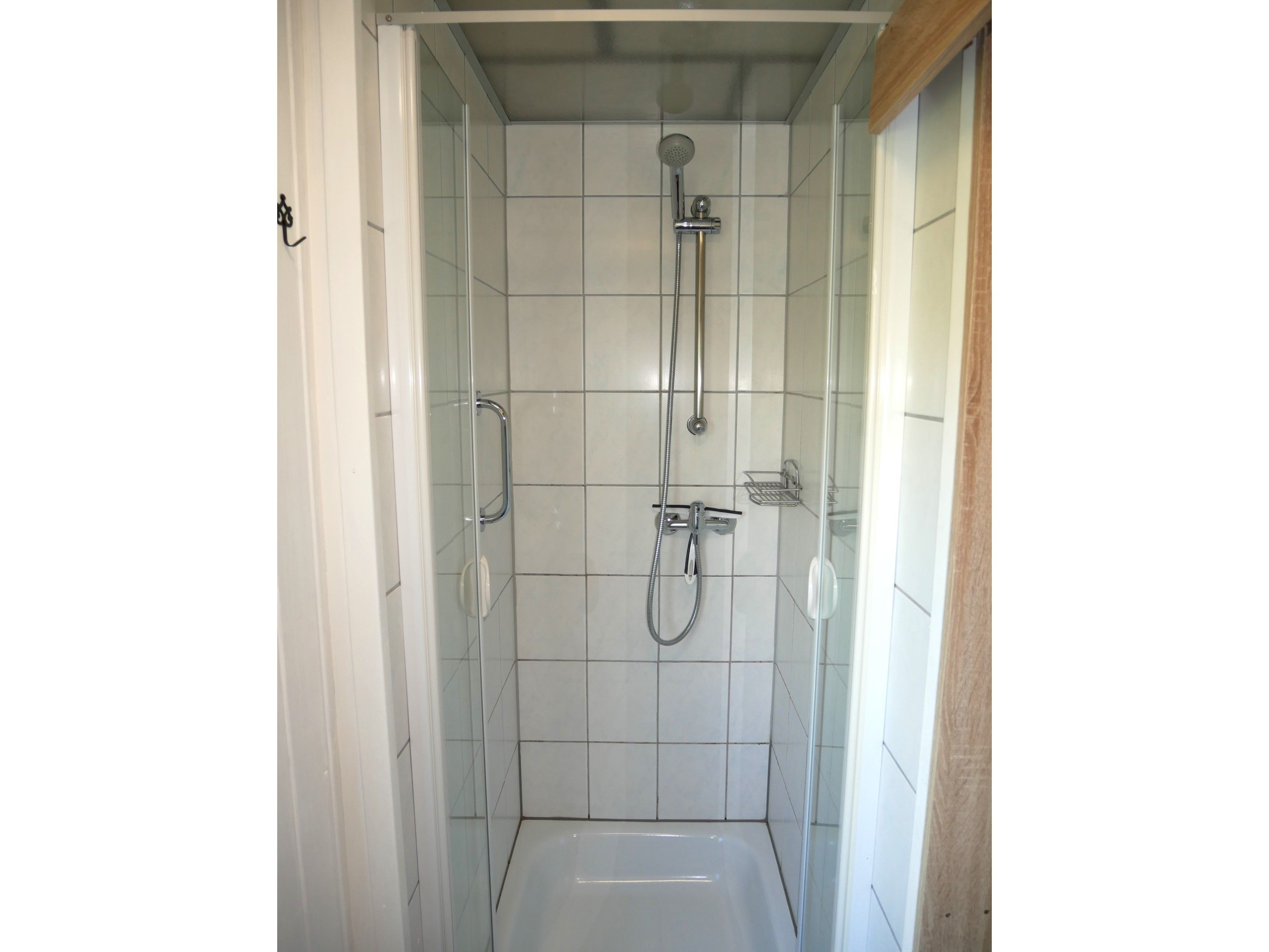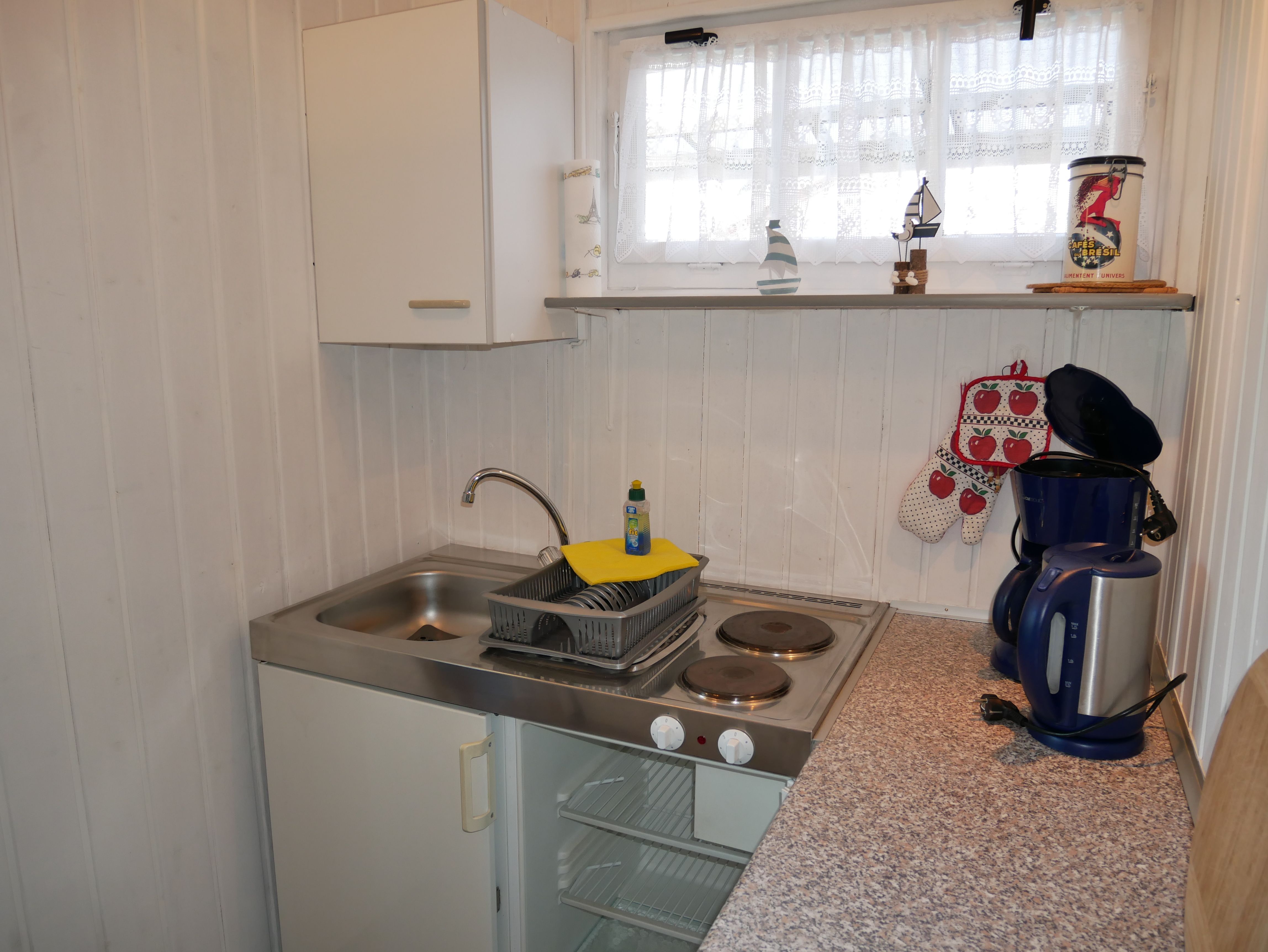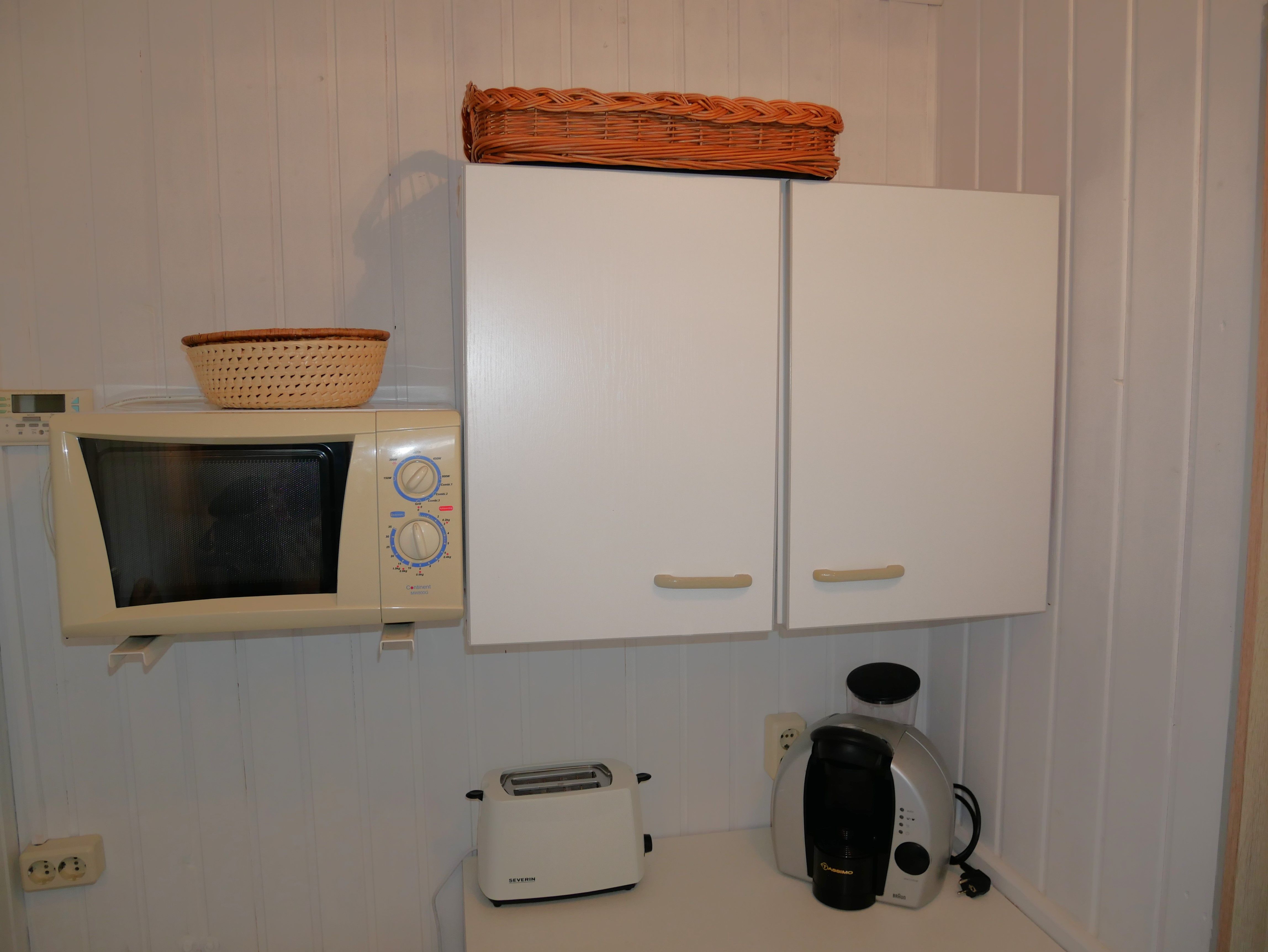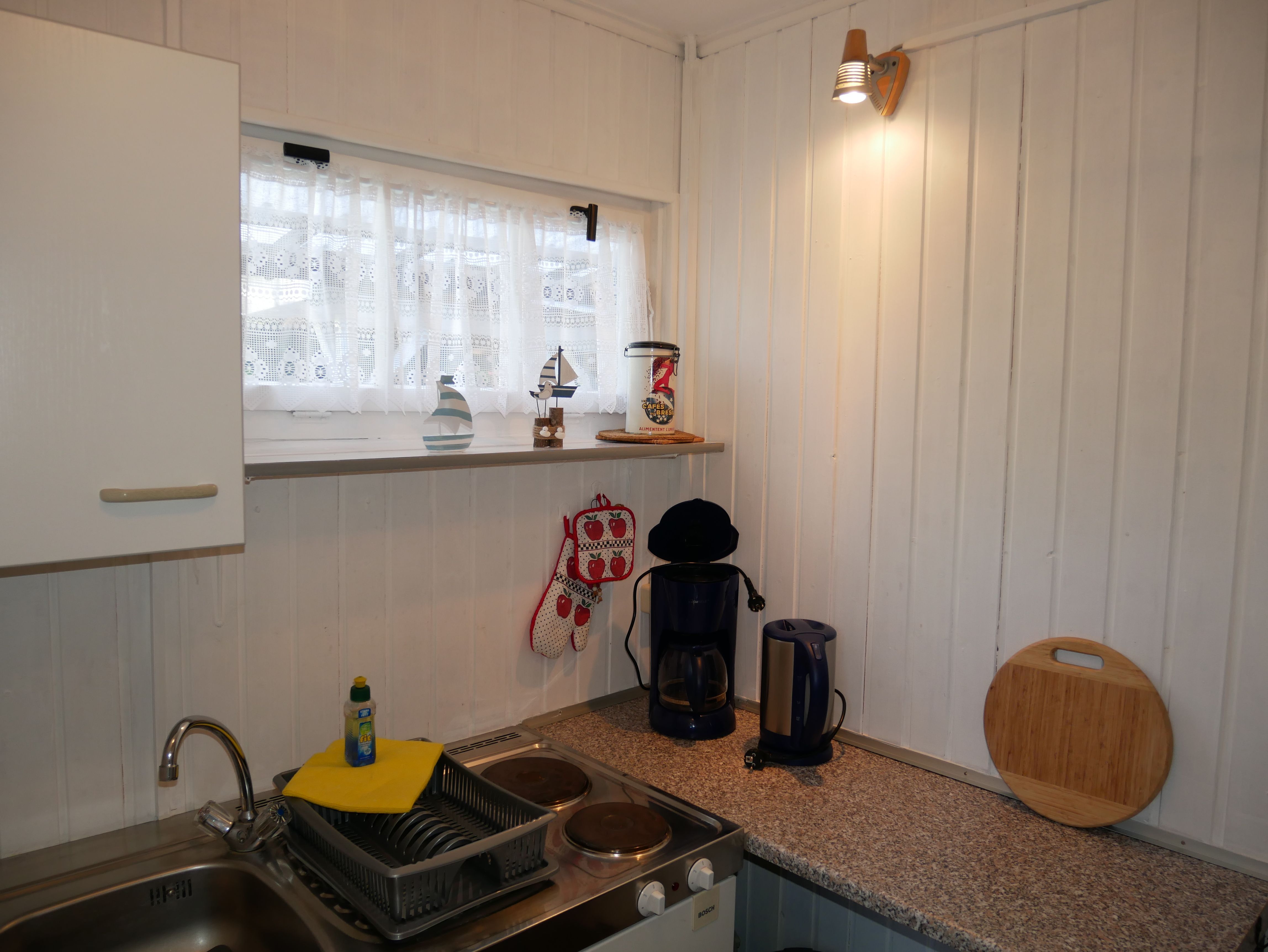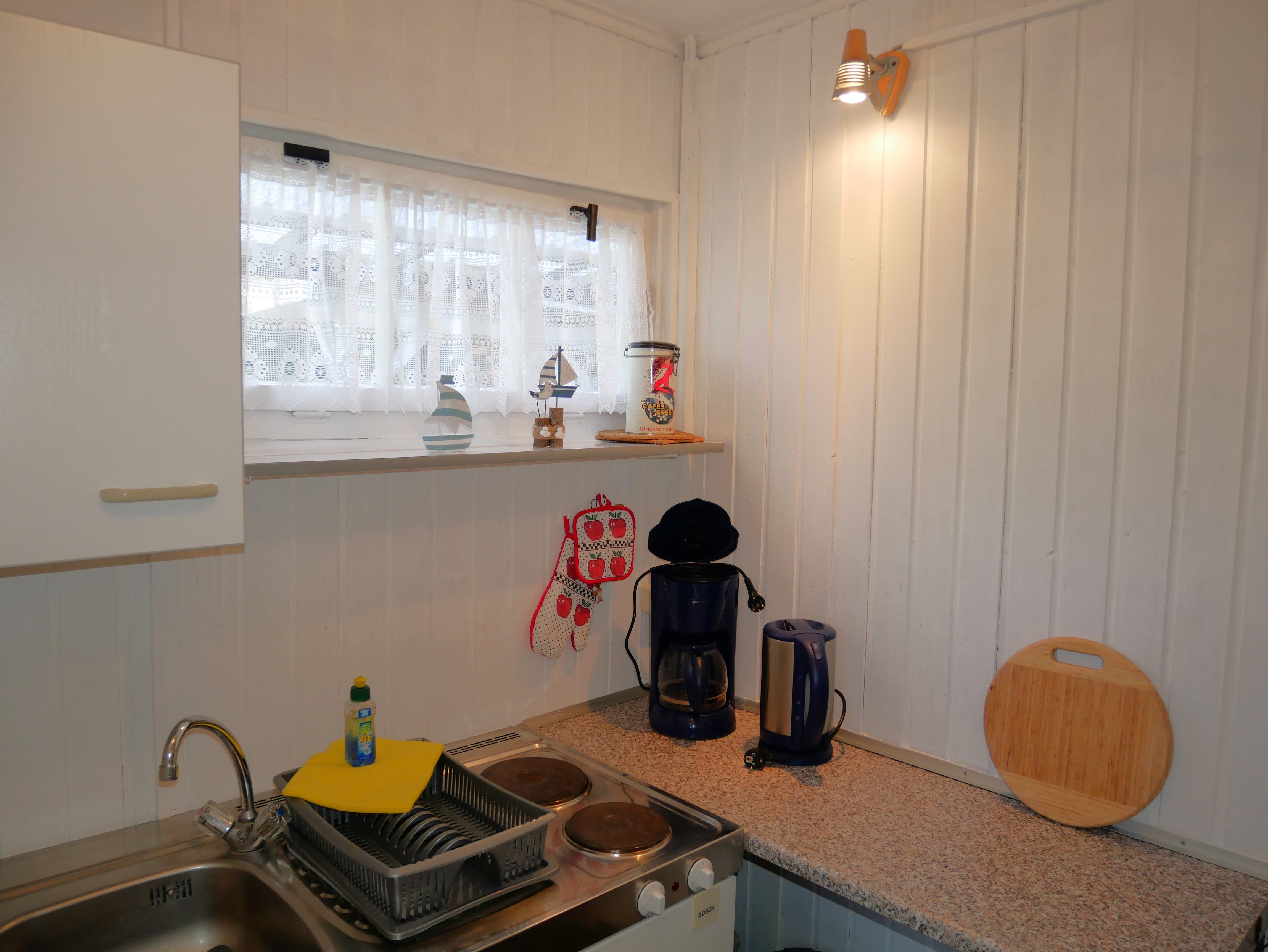 In der kleinen separaten Pantry-Küche ist ein 2 Plattenherd, ein Kühlschrank mit Gefrierfach, Wasserkocher, Kaffeemaschine und Toaster vorhanden. Hinter der Küche befindet sich die Dusche.