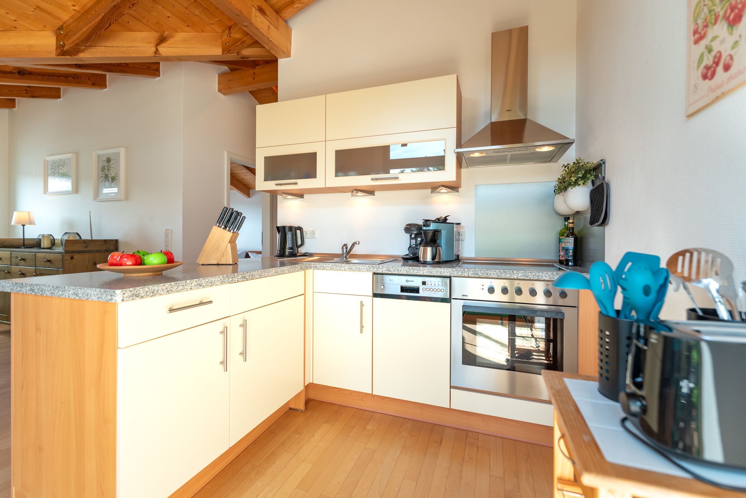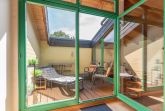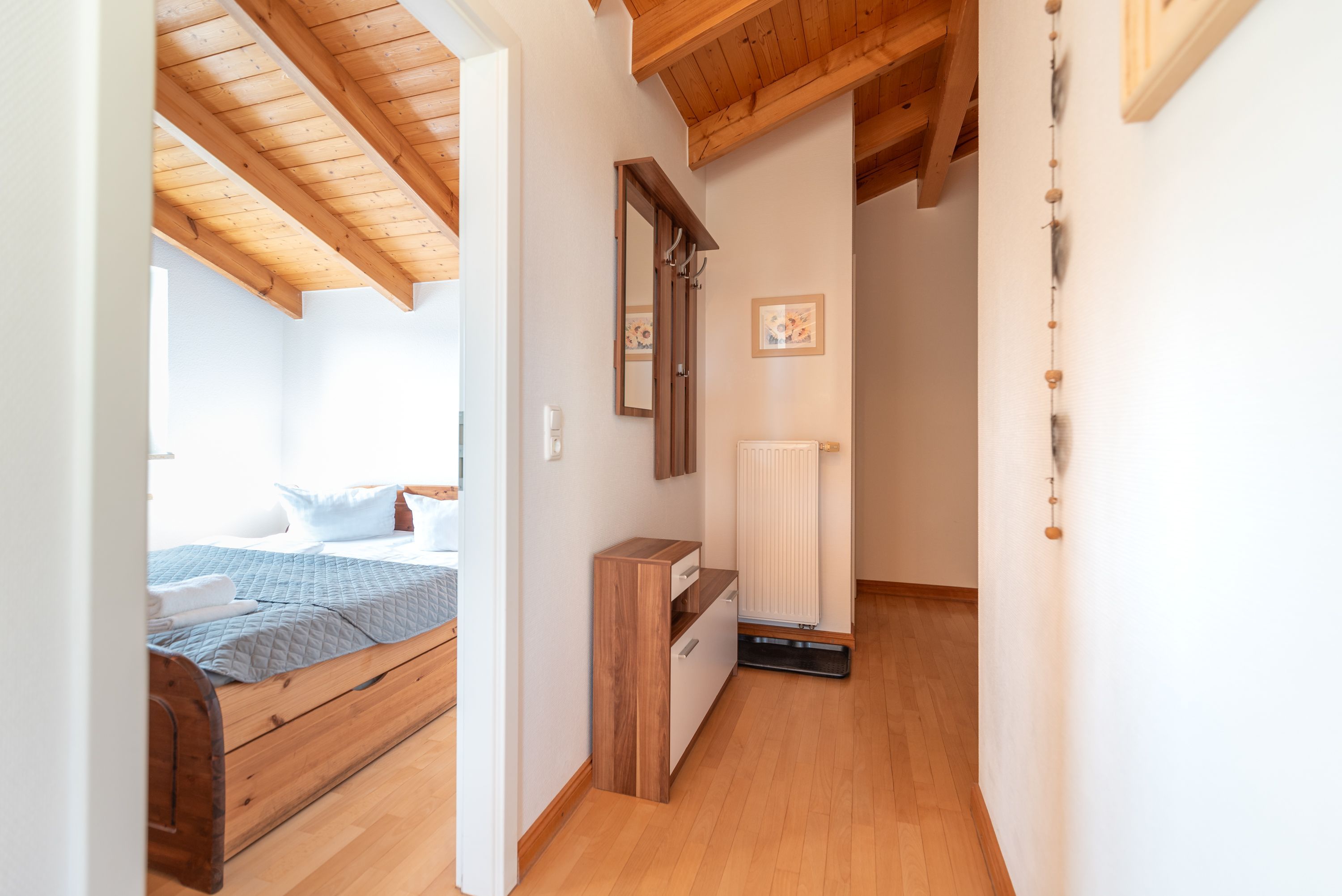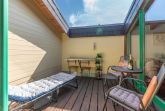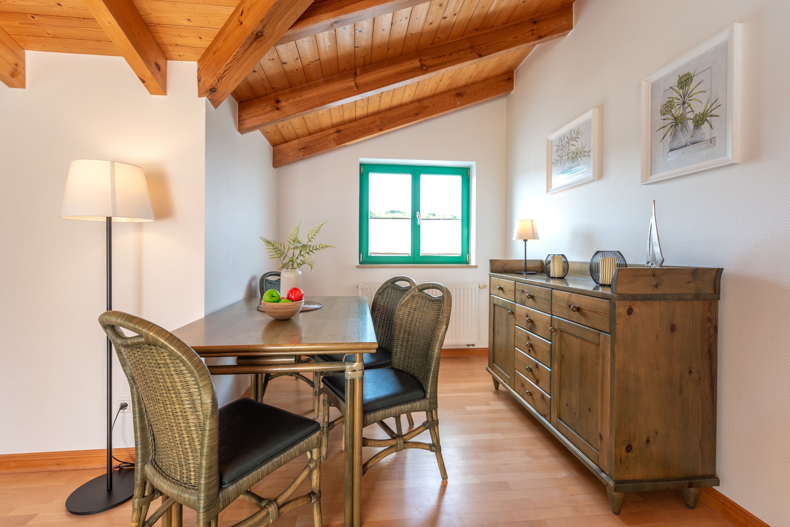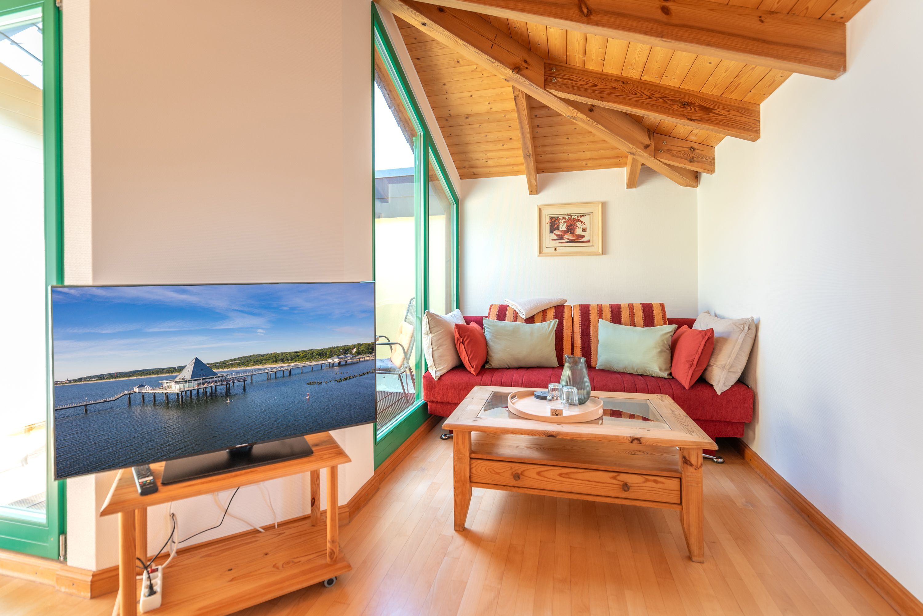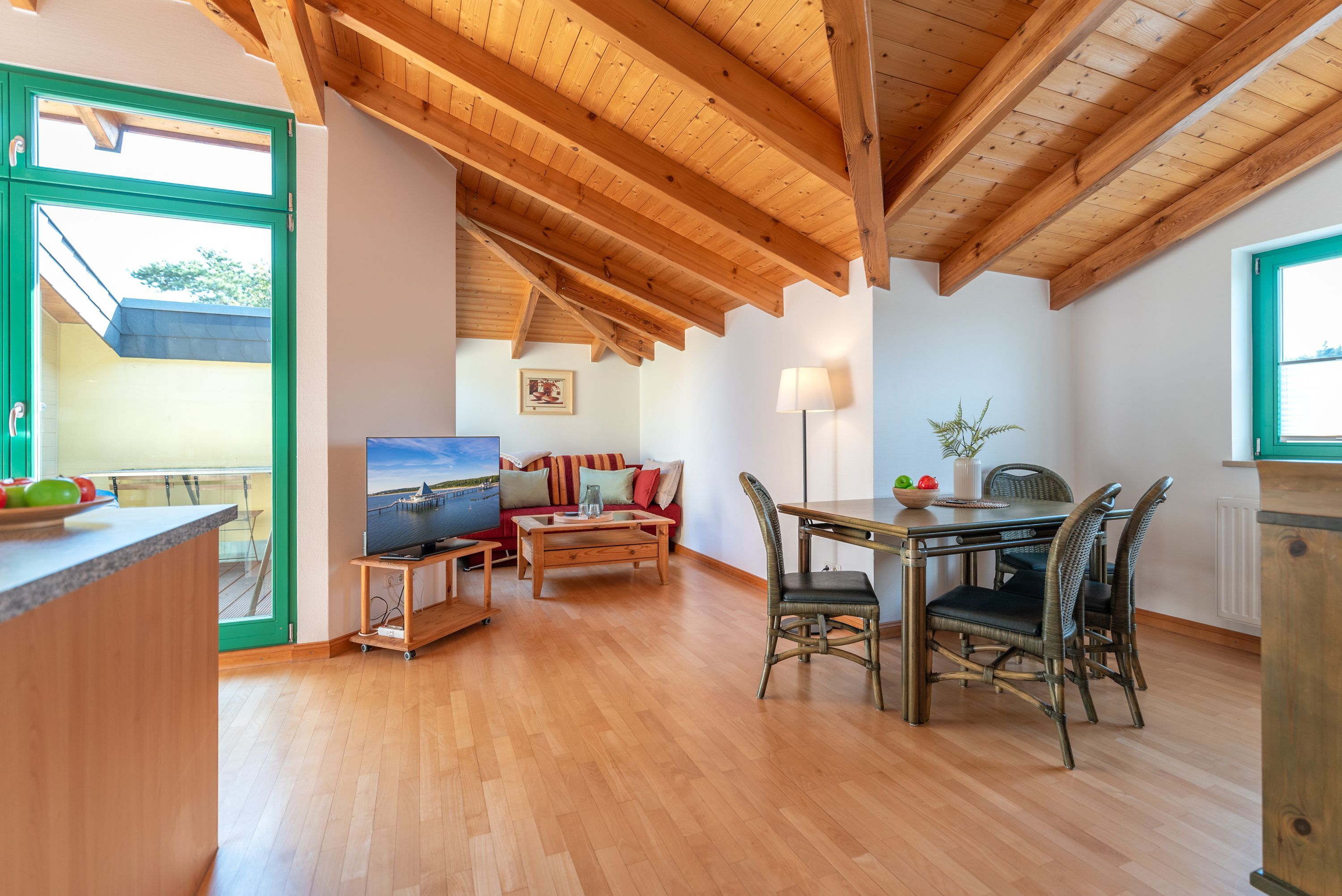 Die ca. 55 m² große Dachgeschosswohnung im 3. Obergeschoss (kein Fahrstuhl) ist ruhig gelegen und eignet sich für bis zu drei Personen. Ein heller Wohnbereich mit gemütlicher Sitzecke, Schlafcouch und Flachbild-TV lädt zum Entspannen ein. Das separate Schlafzimmer ist mit einem Doppelbett (180 × 200 cm) und ausreichend Stauraum ausgestattet. Offene Holzbalken und die verglaste Dachkonstruktion verleihen der Wohnung eine besondere Atmosphäre. Vom Wohnzimmer aus gelangen Sie direkt auf die geschützte Dachterrasse, die bis in den Herbst hinein ein herrlicher Rückzugsort im Freien ist.