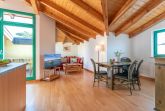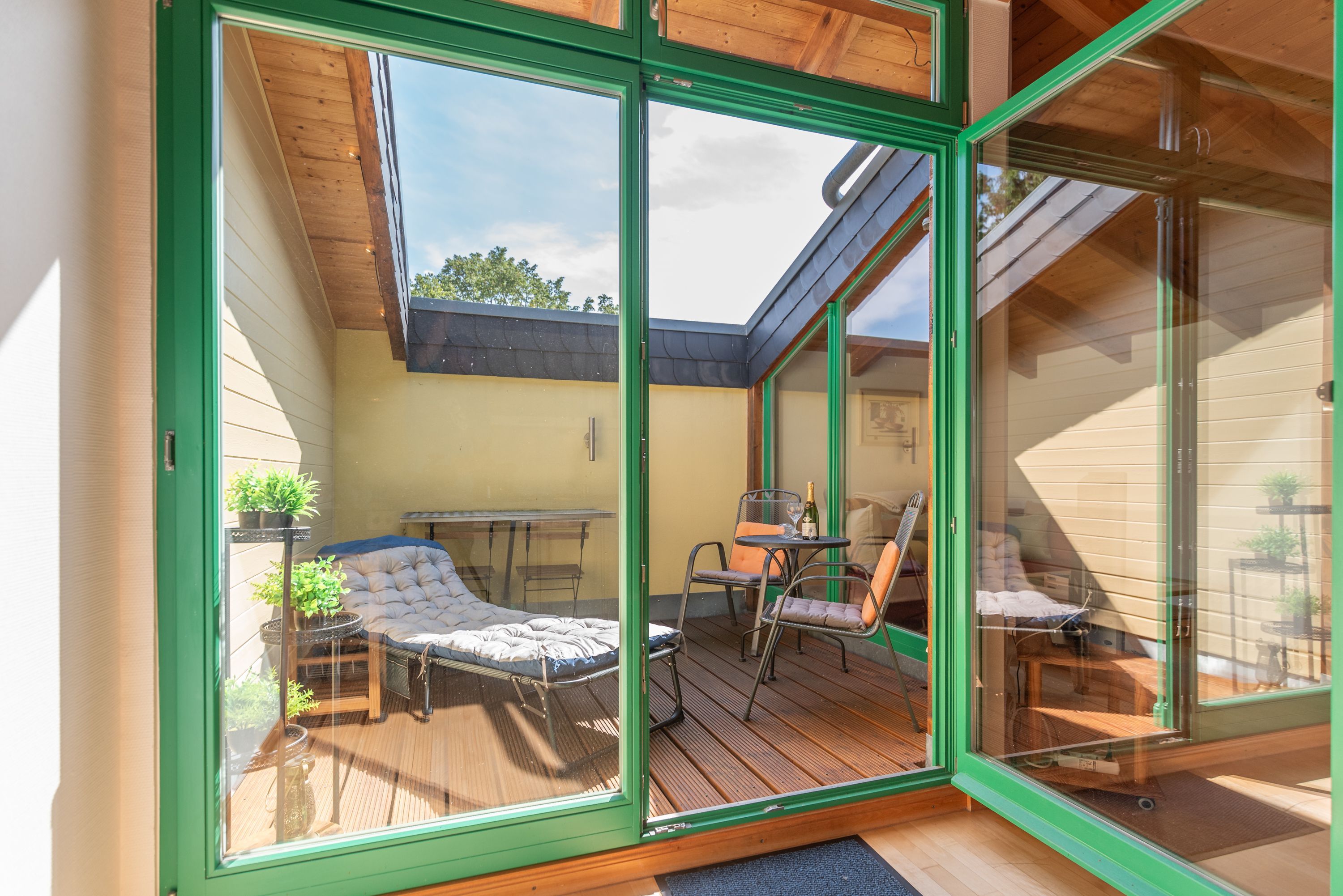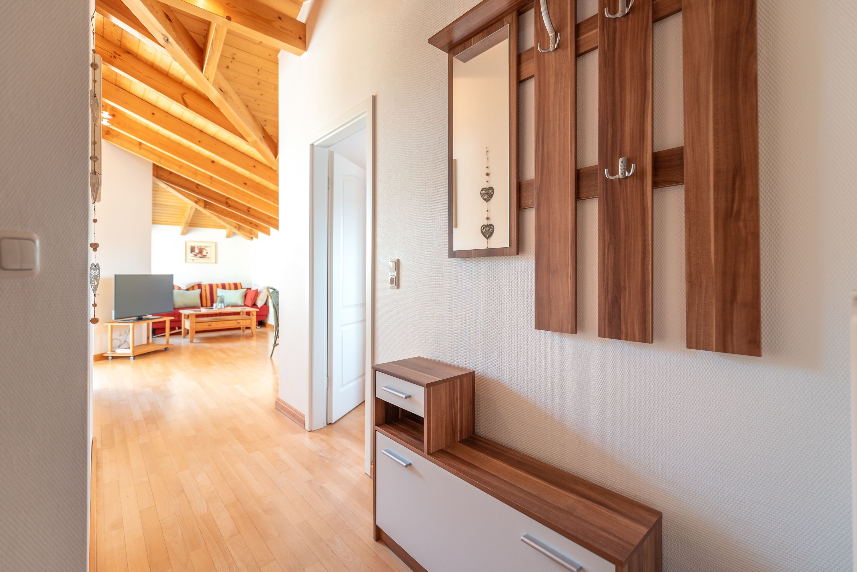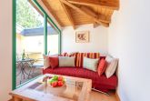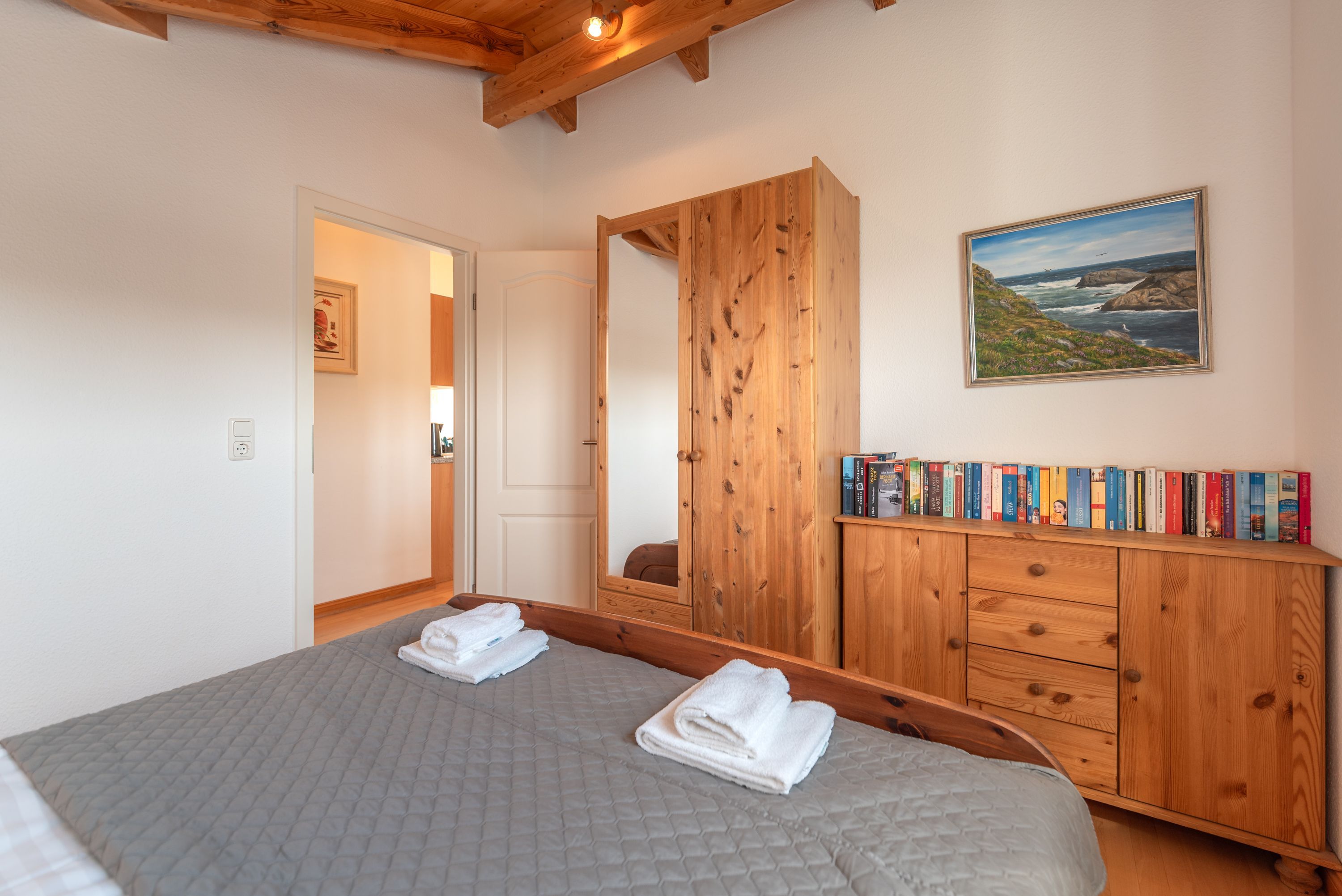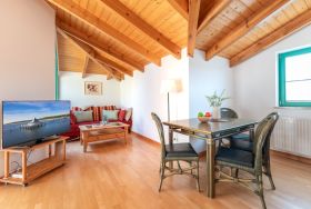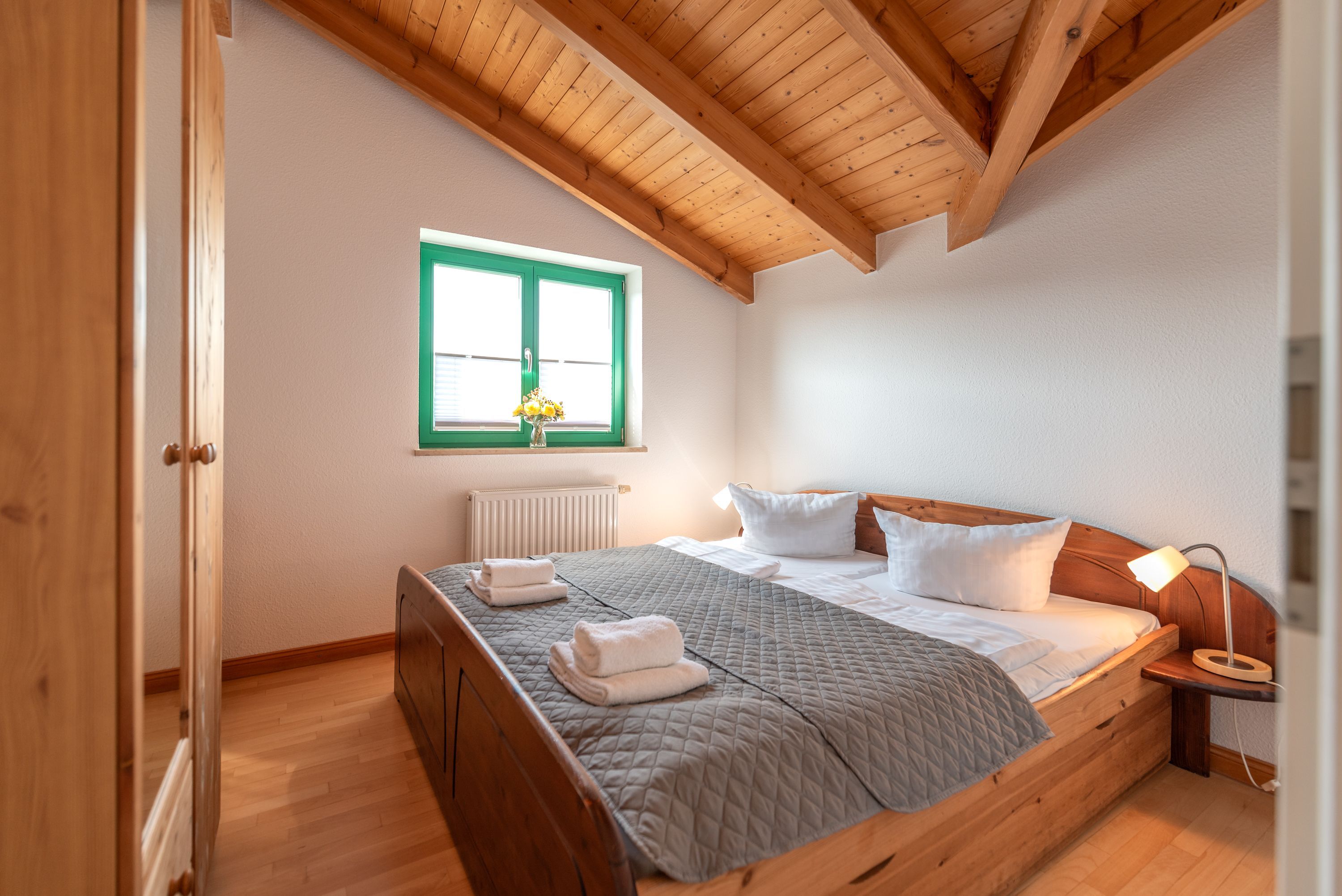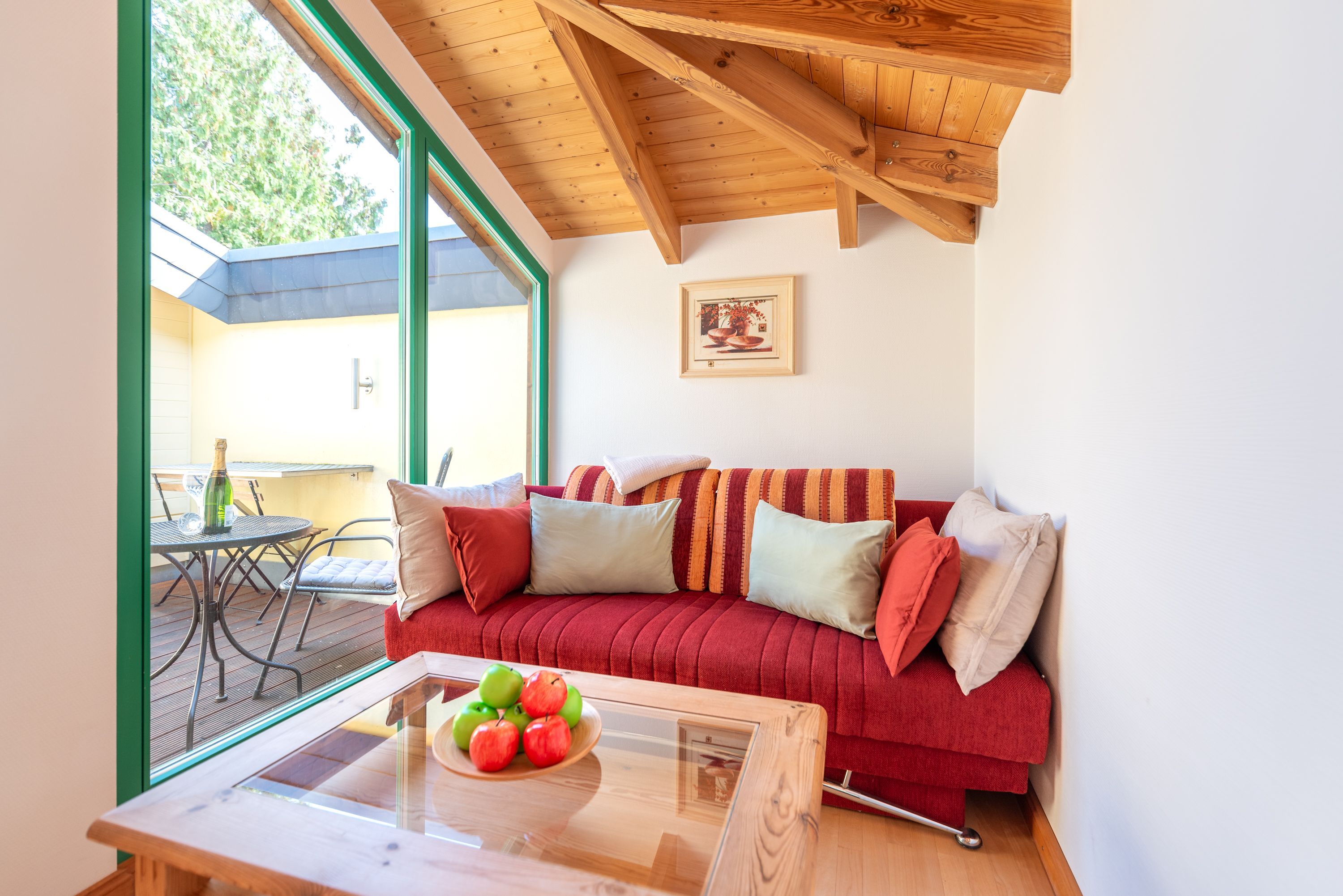 Die ca. 55 m² große Dachgeschosswohnung im 3. Obergeschoss (kein Fahrstuhl) ist ruhig gelegen und eignet sich für bis zu drei Personen. Ein heller Wohnbereich mit gemütlicher Sitzecke, Schlafcouch und Flachbild-TV lädt zum Entspannen ein. Das separate Schlafzimmer ist mit einem Doppelbett (180 × 200 cm) und ausreichend Stauraum ausgestattet. Offene Holzbalken und die verglaste Dachkonstruktion verleihen der Wohnung eine besondere Atmosphäre. Vom Wohnzimmer aus gelangen Sie direkt auf die geschützte Dachterrasse, die bis in den Herbst hinein ein herrlicher Rückzugsort im Freien ist.