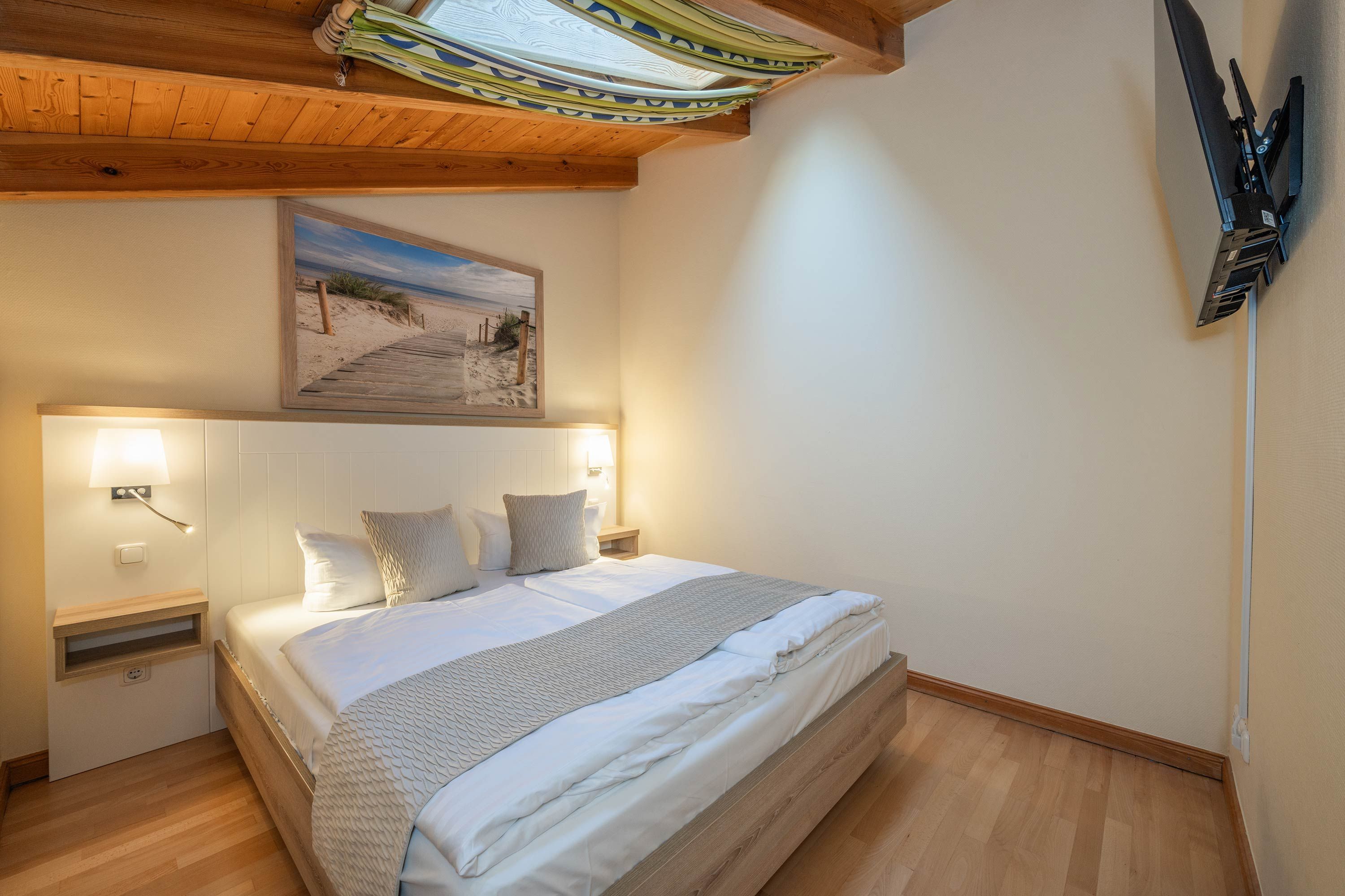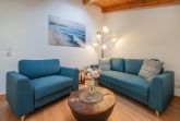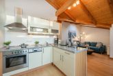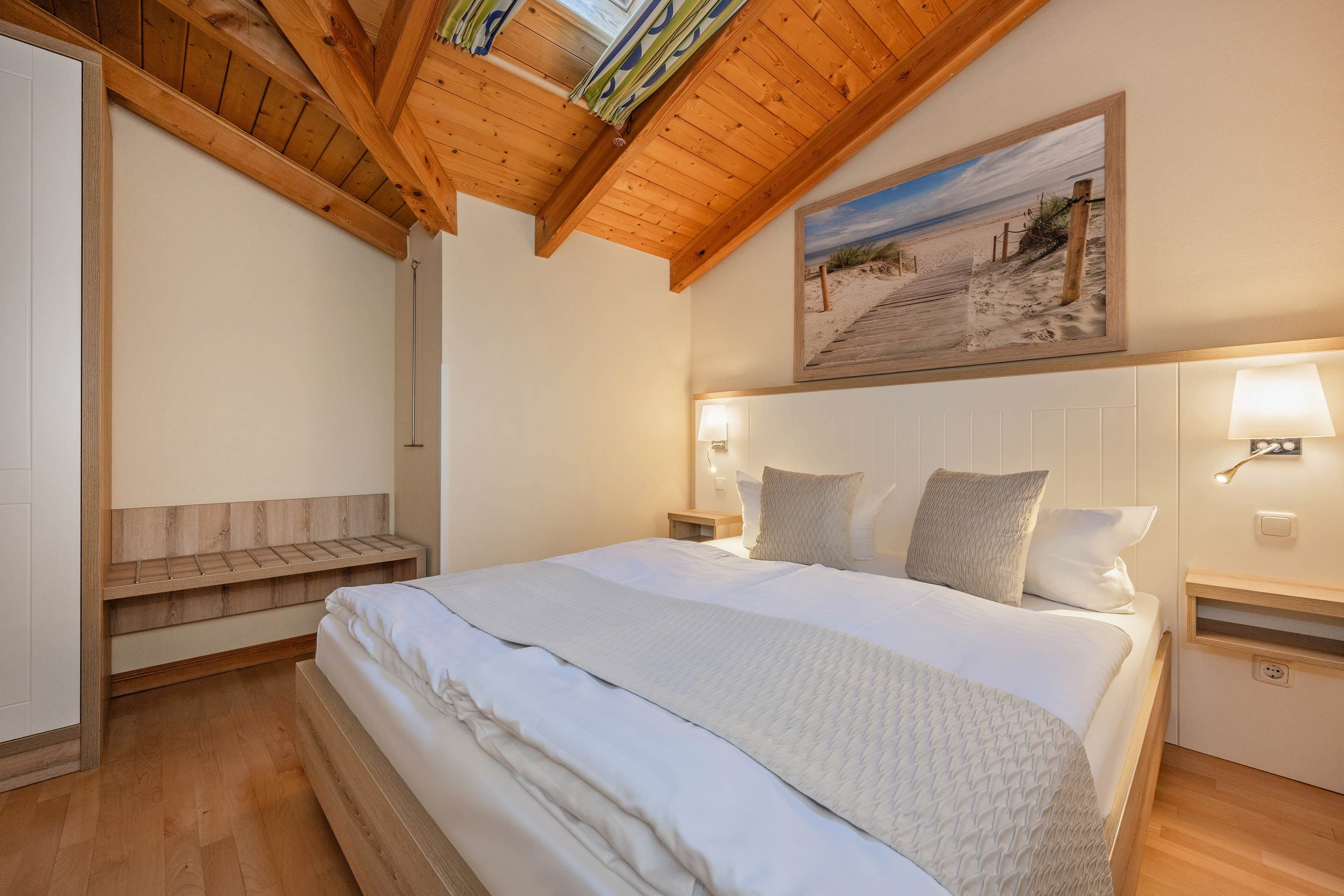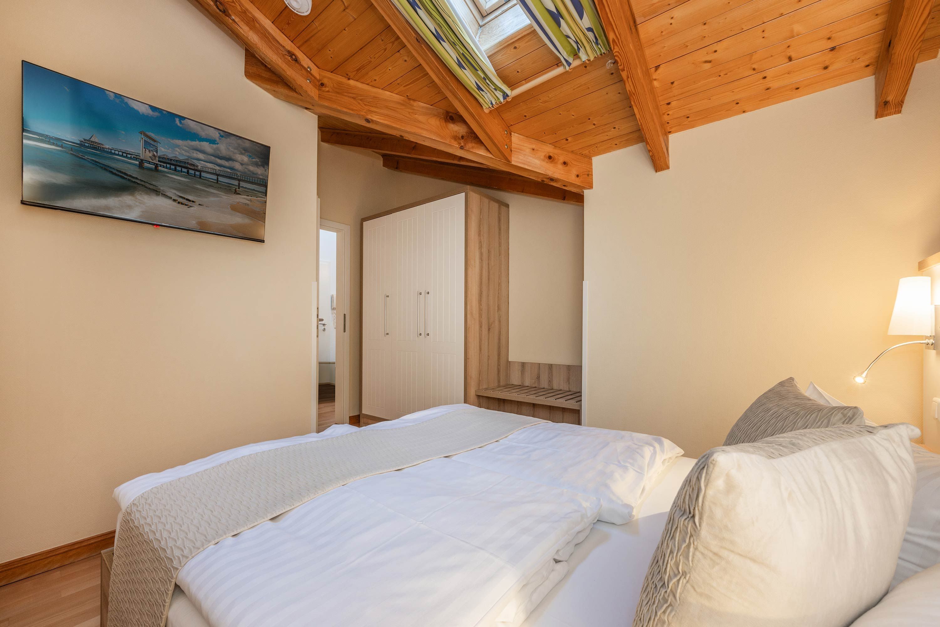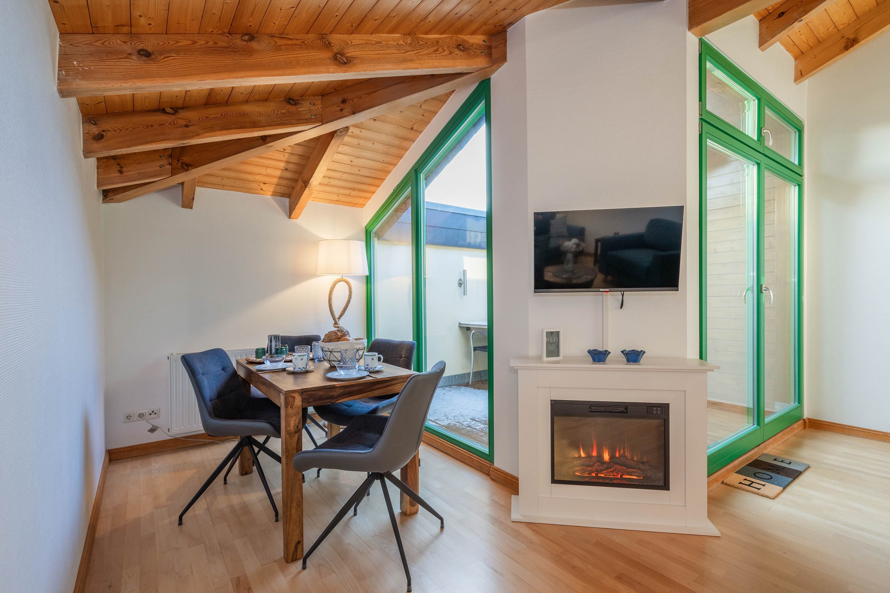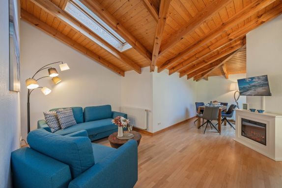 Der helle Wohnbereich bietet eine gemütliche Sitzecke mit Schlafcouch (160 × 200 cm), Elektrokamin und Flachbild-TV. Das separate Schlafzimmer ist mit einem Doppelbett (160 × 200 cm) und ausreichend Stauraum ausgestattet. Die sichtbare Holzbalkenkonstruktion und die geöffnete Dachdecke verleihen den Räumen eine offene, besondere Atmosphäre. Vom Wohnzimmer aus haben Sie Zugang zur blick- und windgeschützte Dachterrasse, die bis in den Herbst hinein zu entspannten Stunden im Freien einlädt.