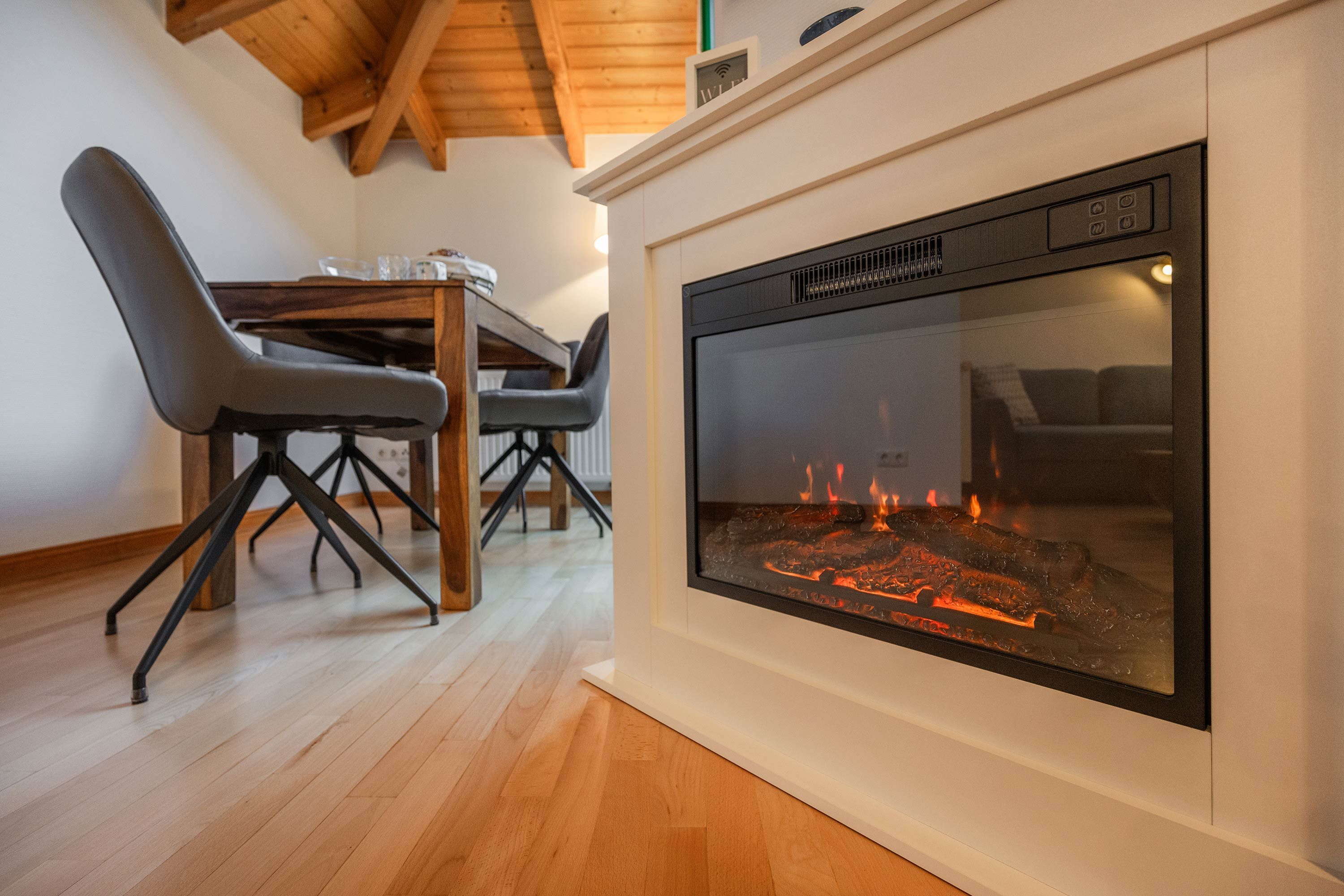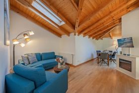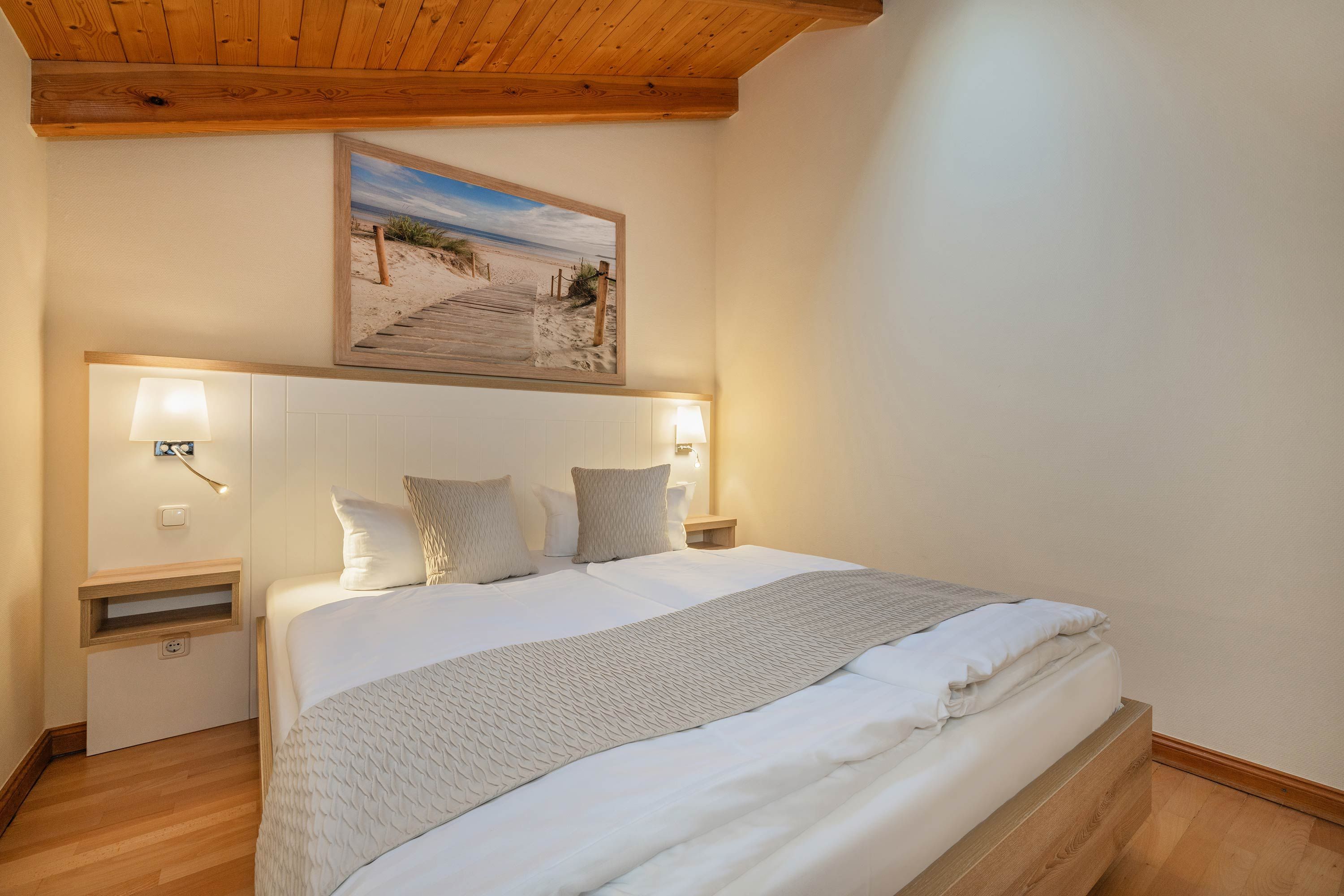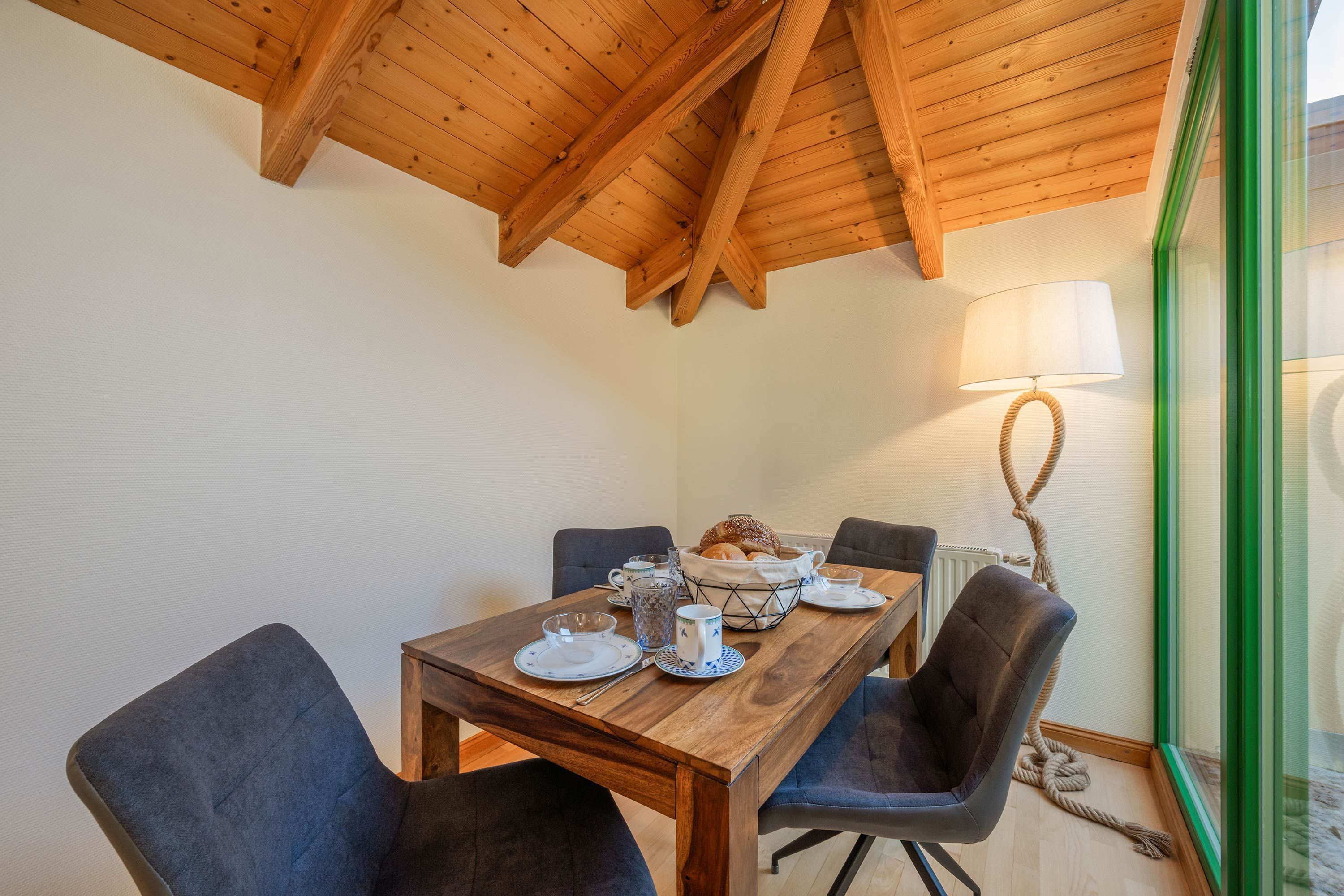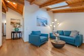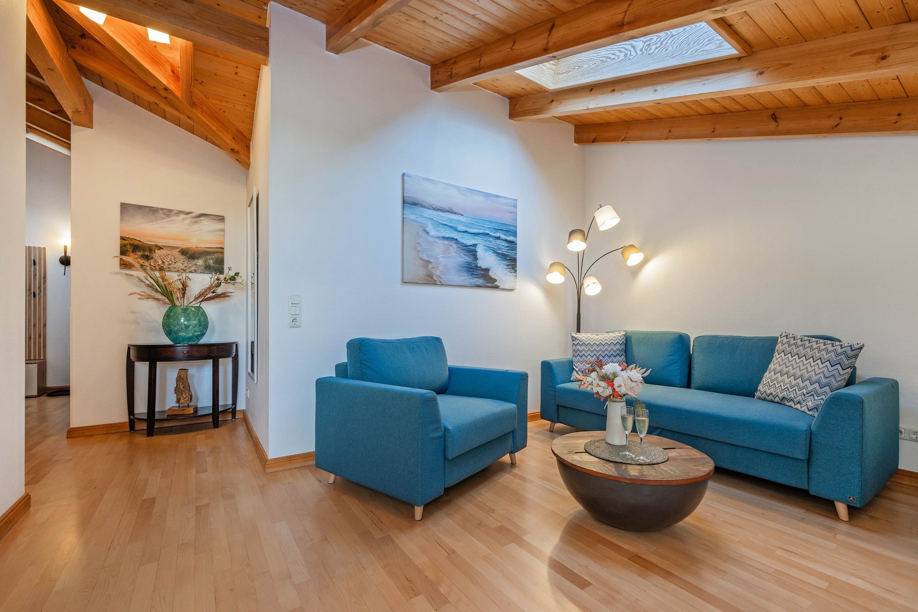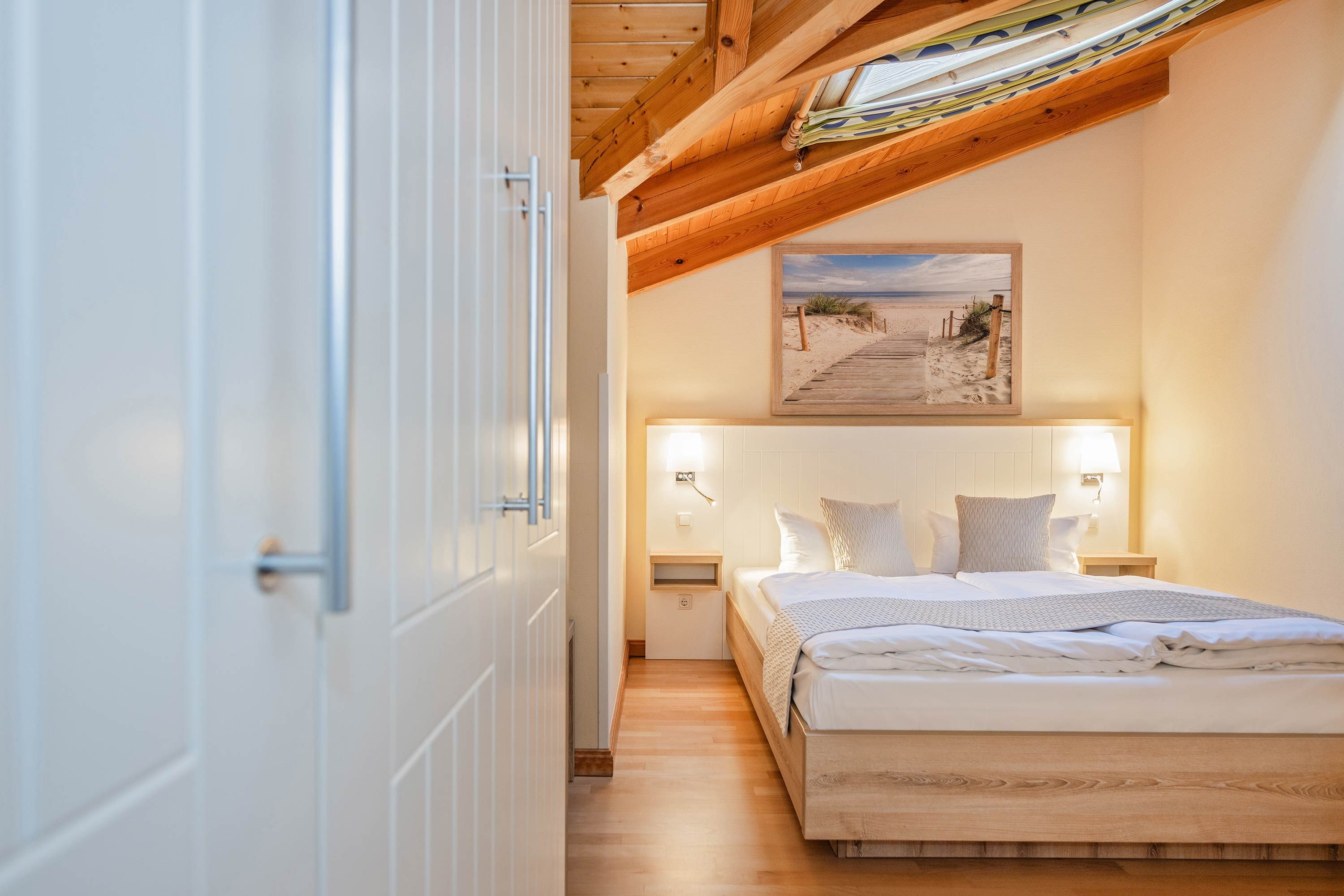 Der helle Wohnbereich bietet eine gemütliche Sitzecke mit Schlafcouch (160 × 200 cm), Elektrokamin und Flachbild-TV. Das separate Schlafzimmer ist mit einem Doppelbett (160 × 200 cm) und ausreichend Stauraum ausgestattet. Die sichtbare Holzbalkenkonstruktion und die geöffnete Dachdecke verleihen den Räumen eine offene, besondere Atmosphäre. Vom Wohnzimmer aus haben Sie Zugang zur blick- und windgeschützte Dachterrasse, die bis in den Herbst hinein zu entspannten Stunden im Freien einlädt.