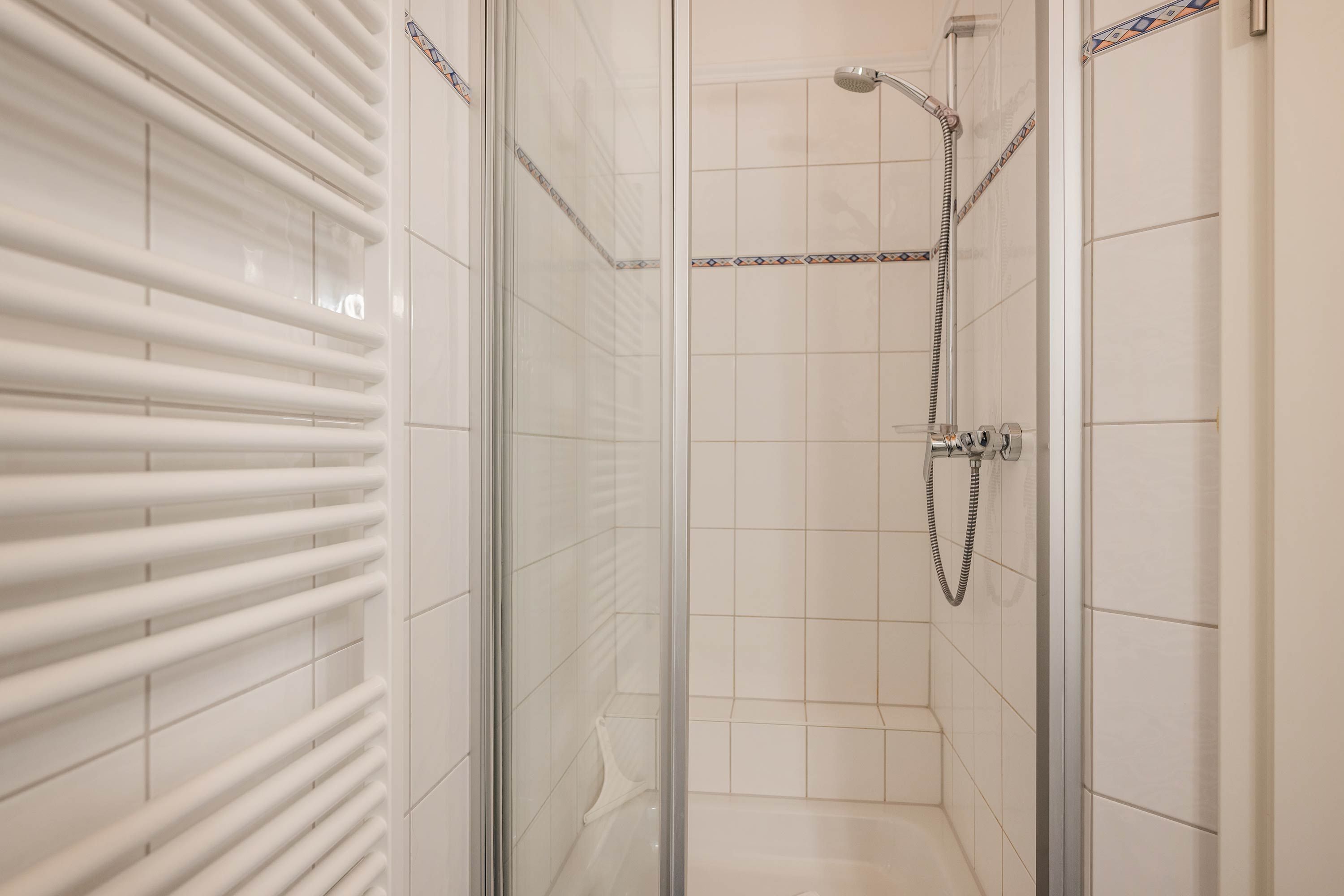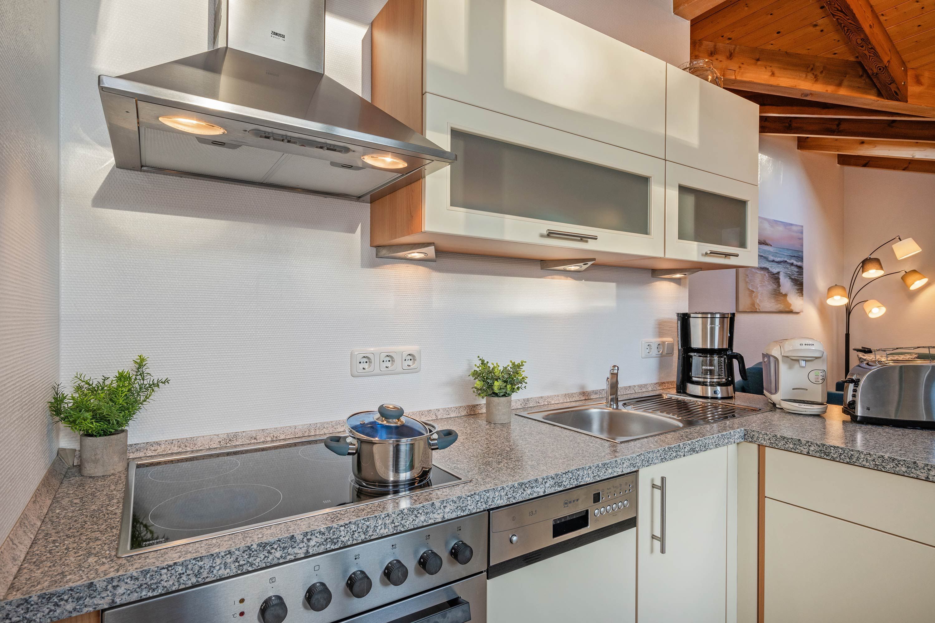 Die moderne Küchenzeile ist vollständig ausgestattet mit Kühlschrank, Geschirrspüler, Backofen und Kaffeemaschine. Das Badezimmer verfügt über Dusche, WC, Waschbecken, Haartrockner und Fußbodenheizung.