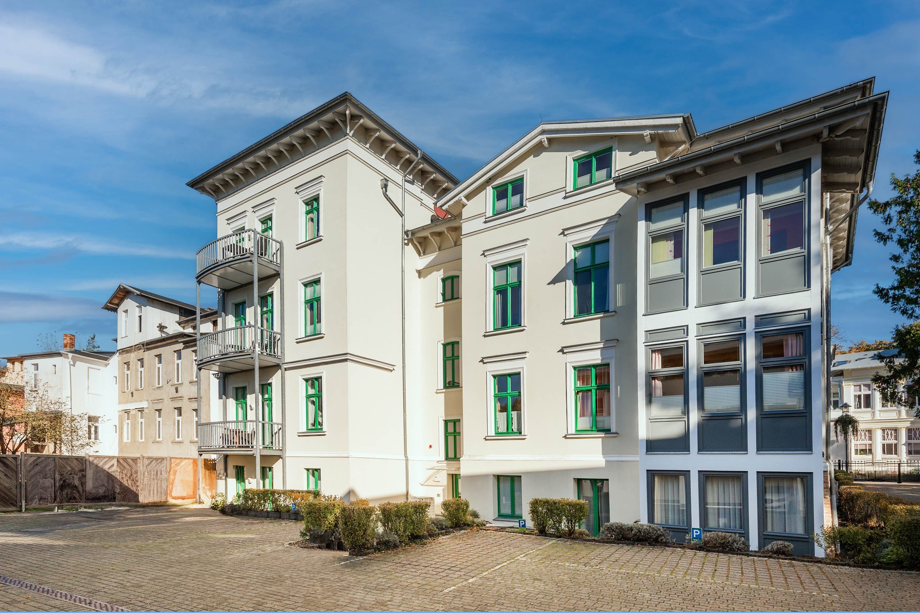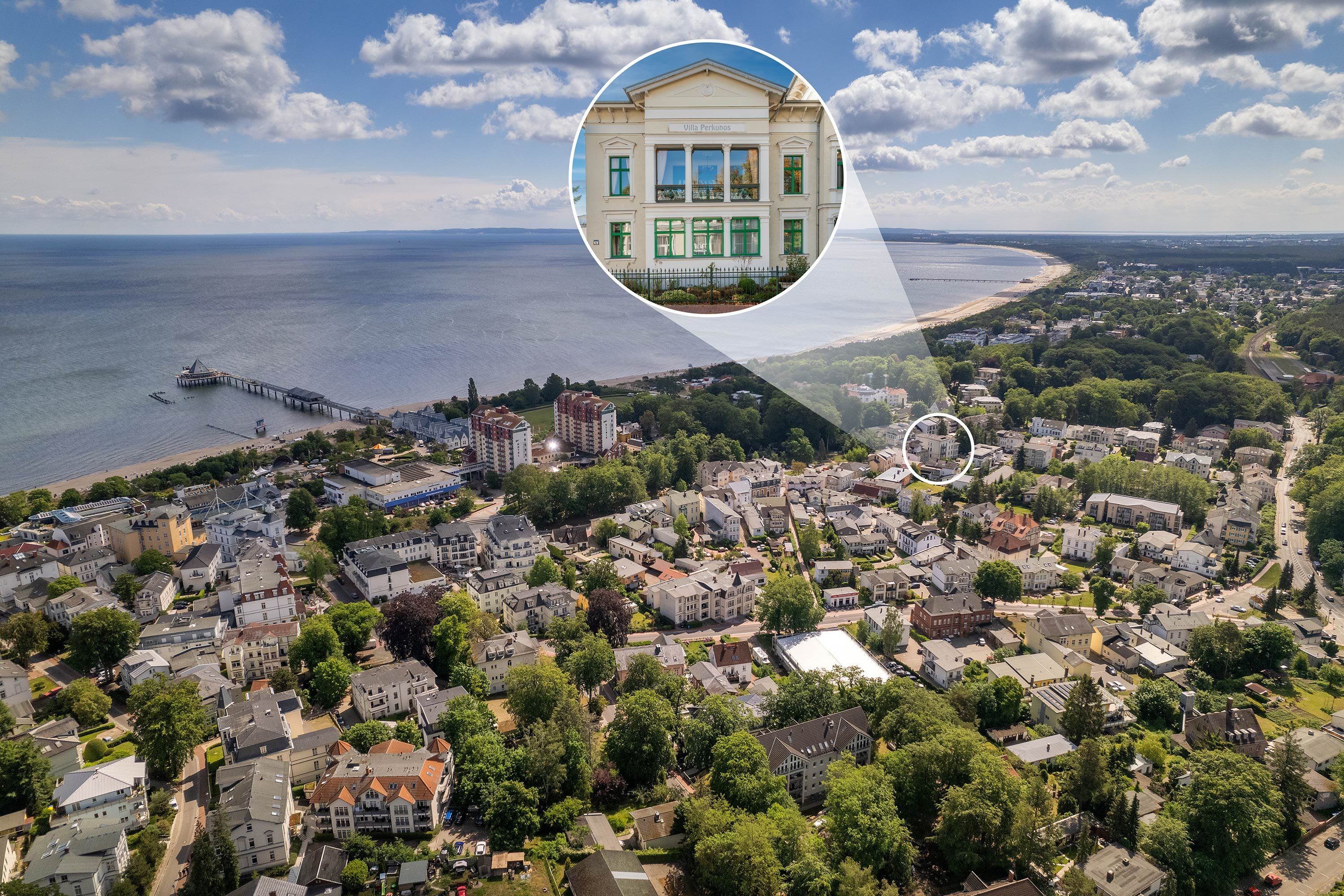 Im Dachgeschoss der denkmalgeschützten Villa Perkunos erwartet Sie Wohnung 15 ruhig gelegen und dennoch nur wenige Gehminuten vom Strand, der Seebrücke Heringsdorf und zahlreichen Einkaufsmöglichkeiten entfernt. Die aufwendig sanierte Bädervilla verbindet historischen Charme mit modernem Komfort und bietet damit ein ideales Urlaubszuhause mitten im Kaiserbad.