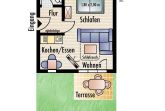 Vom Wohnraum aus ist der Zugang zur Terrasse mit Gartenmöbeln gegeben. Im Flur ist eine Flurgarderobe angebracht. Das Bad (innen liegend) ist mit Dusche/WC und Waschbecken ausgestattet.