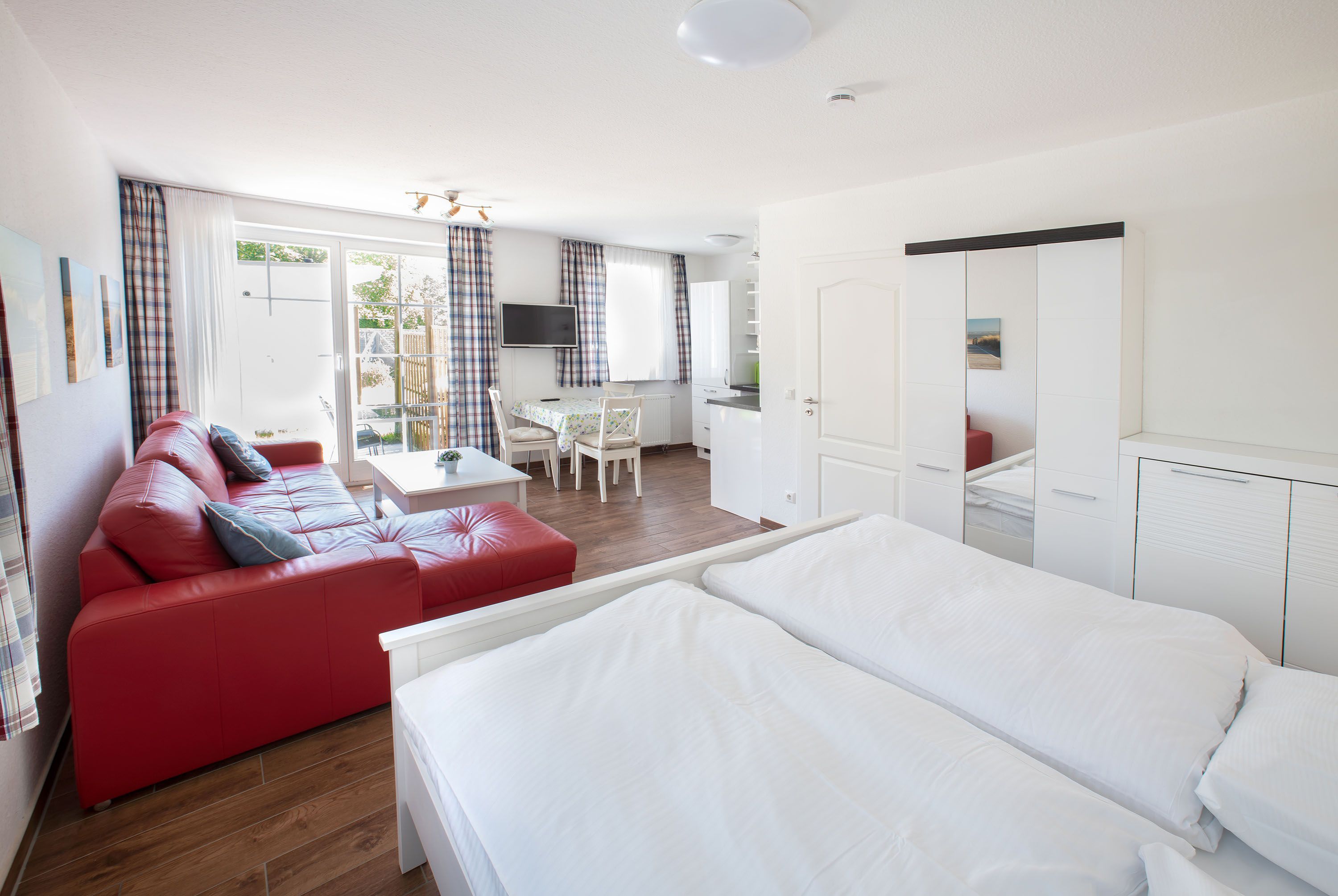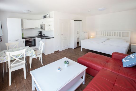 In der Ferienwohnung in Wiek können bis zu 3 Personen übernachten. Sie besteht aus einem Wohn/Schlafraum mit SAT-TV, in dem ein Doppelbett und eine ausziehbare Couch zur Verfügung stehen.