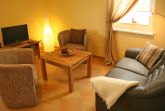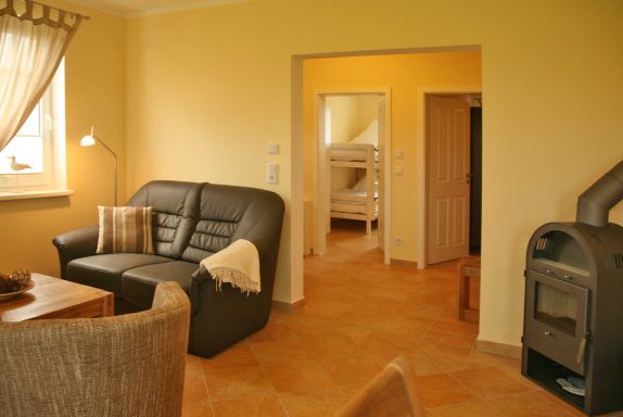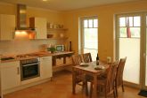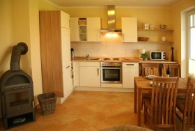 Das Ferienappartement befindet sich im EG mit Terrasse und Garten und ist somit ideal auch geeignet für Ihre tierischen Lieblinge. Hier finden Sie 3 Räume davon ein kombinierter Wohn-Essbereich Tisch mit 4 Stühlen integrierter Küche, Couch-Sitzecke mit TV und Kaminofen. Die Küche ist ausgestattet mit Kühlschrank u. Gefrierfach, Mikrowelle, Spülmaschine, Toaster, Herd mit Backofen und Kaffeemaschine. Es befinden sich 2 Schlafzimmer in der Wohnung - eines mit Doppelbett und das zweite mit einem Etagenbett. Das Bad ist ausgestattet mit Dusche und WC. Im gesamten Wohnbereich ist eine Fußbodenheizung installiert. Eine bestuhlte Terrasse ist der Wohnung angeschlossen. Eine Waschmaschine befindet sich im angrenzenden HWR und ist per Münzen zu bedienen. Für unsere kleinen Gäste stellen wir kostenfrei einen Kinderhochstuhl sowie ein Reisebabybettchen zur Verfügung. Der PKW-Stellplatz befindet sich direkt vor dem Haus. Wir bitten Bettwäsche und Handtücher mitzubringen. Haustiere sind nicht im Preis inkl. hierfür berechnen wir EUR 20,00 pro Nacht. Die Endreinigung berechnen wir zusätzlich mit EUR 100,00. Für Monteure ist die Unterkunft nicht geeignet.