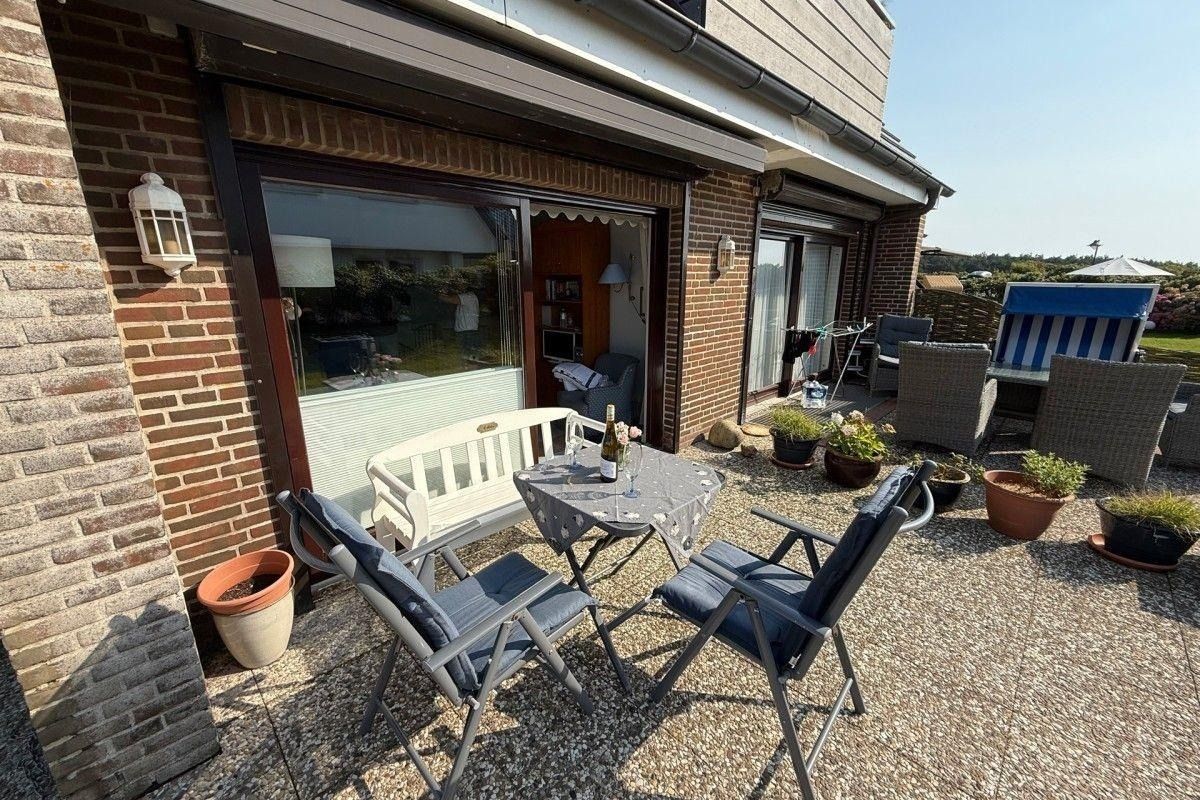 Die große Terrasse mit Strandkorb lädt zu entspannten Stunden unter freiem Himmel ein. Genießen Sie Ihren Kaffee mit Blick ins Grüne oder lassen Sie nach einem Strandtag die salzige Luft auf sich wirken – einfach Urlaub!