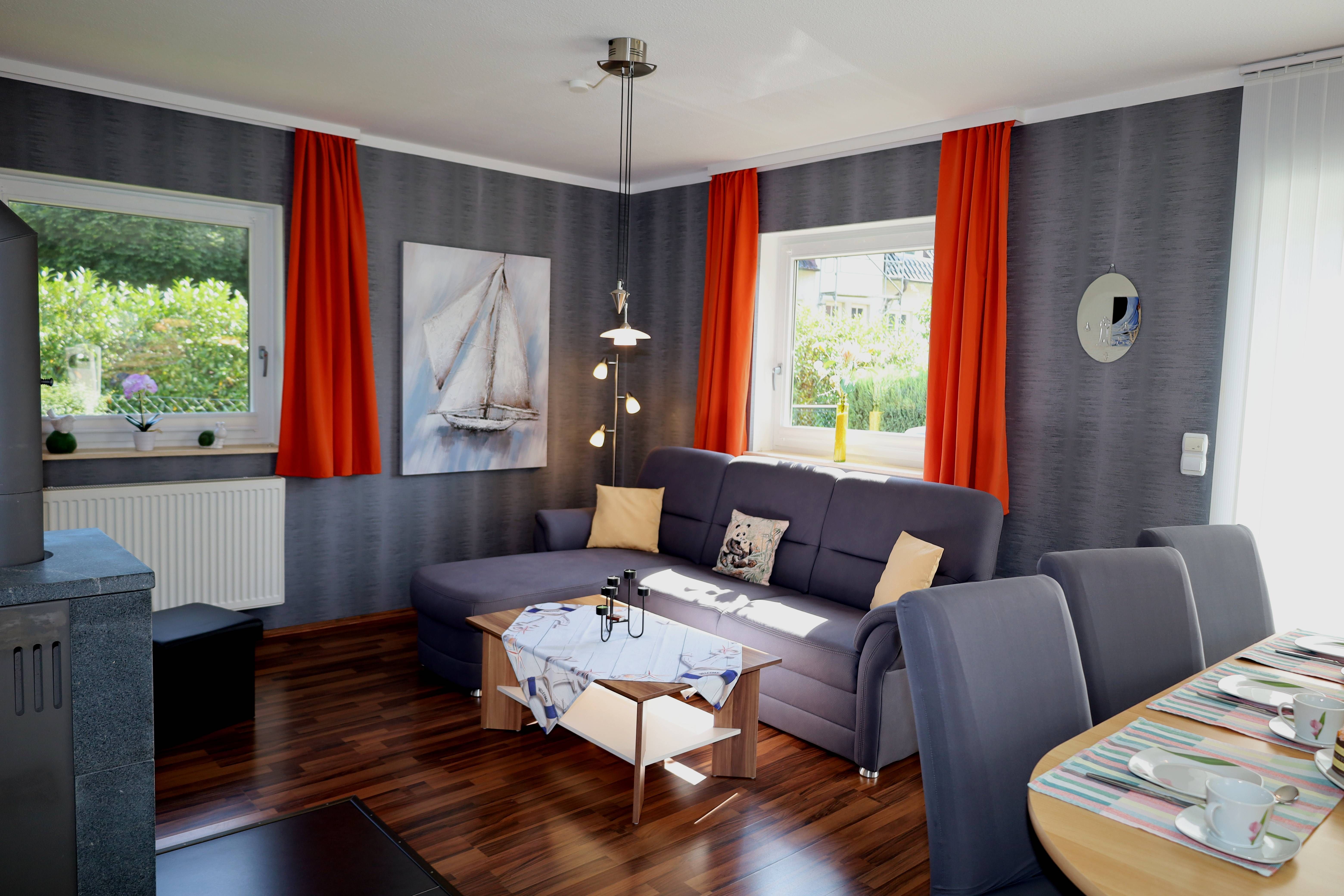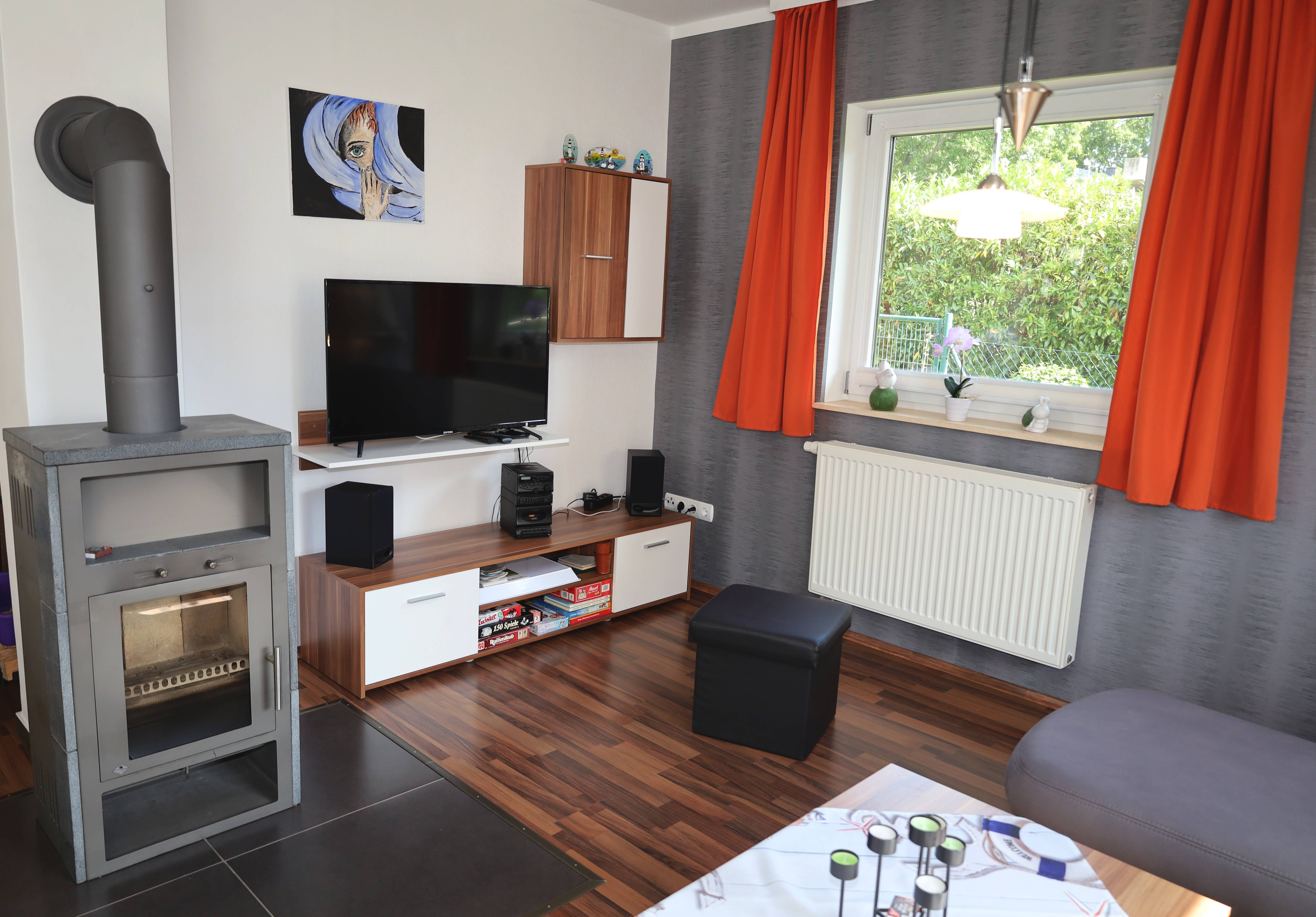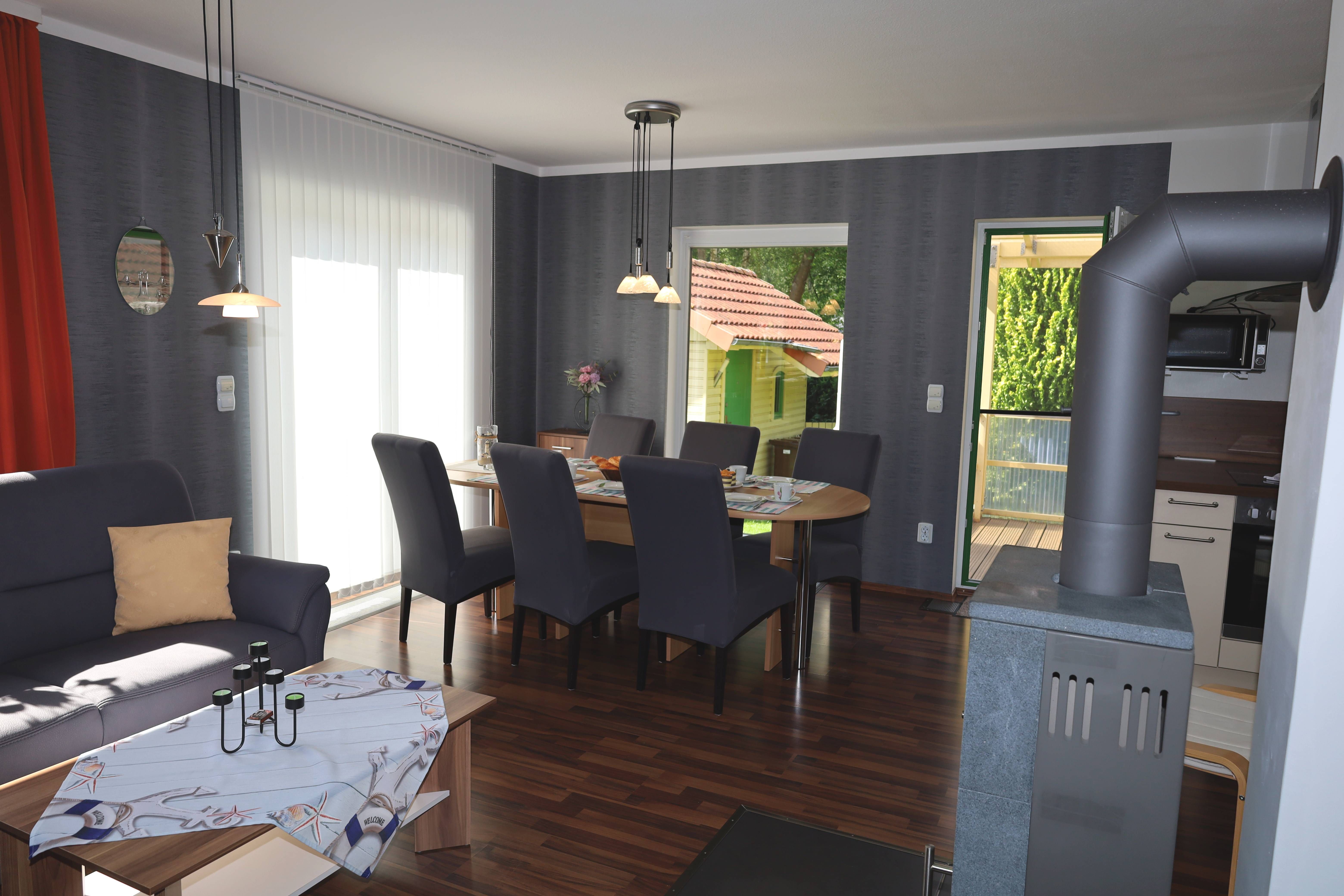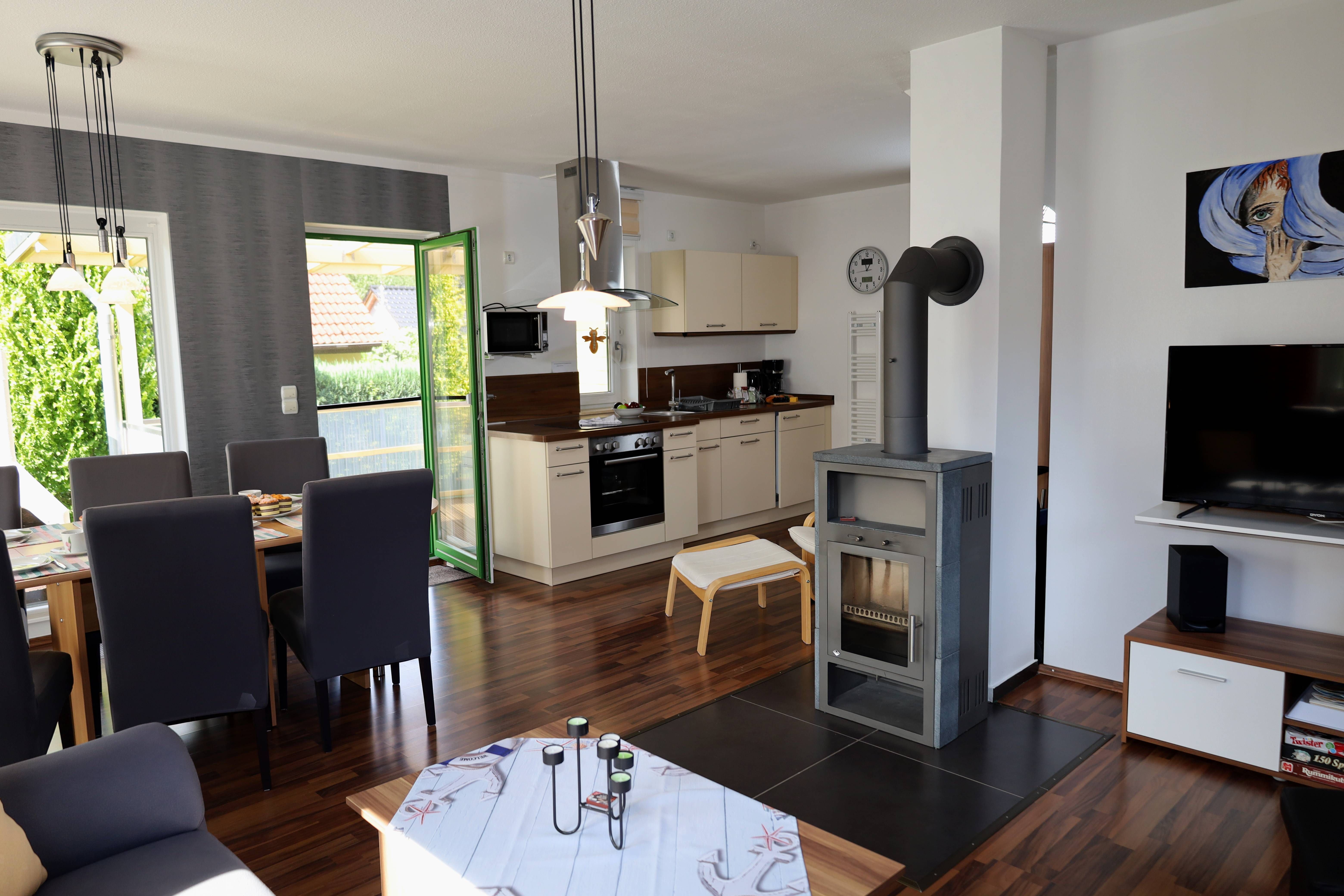 Das Wohnzimmer lädt mit seiner gemütlichen Couch, dem knisternden Kamin und dem Fernseher sowie kostenlosen W-Lan zu entspannten Abenden ein. Am großen Esstisch finden bis zu sechs Personen gemeinsam Platz für ein geselliges Frühstück oder ein Abendessen.