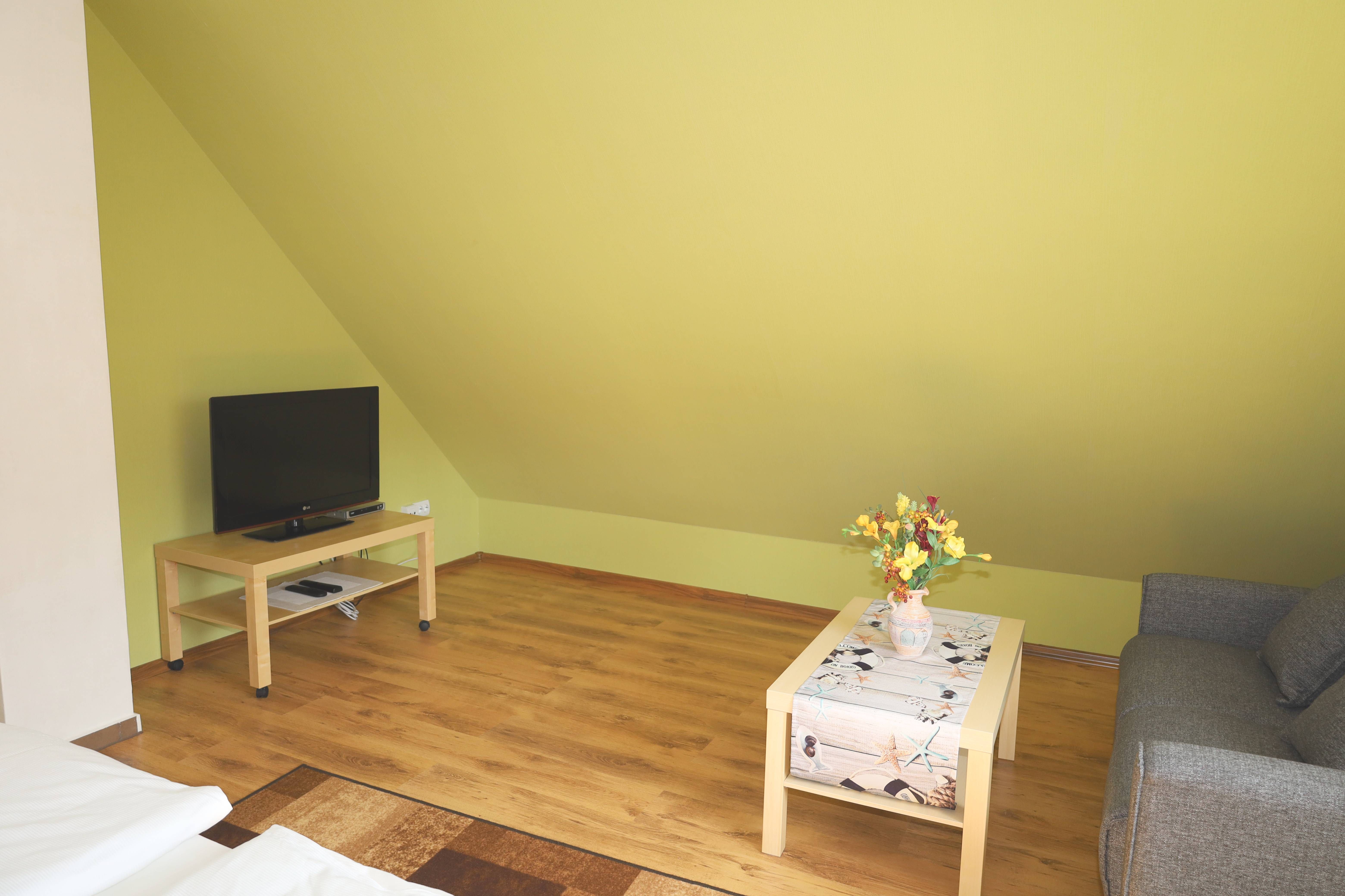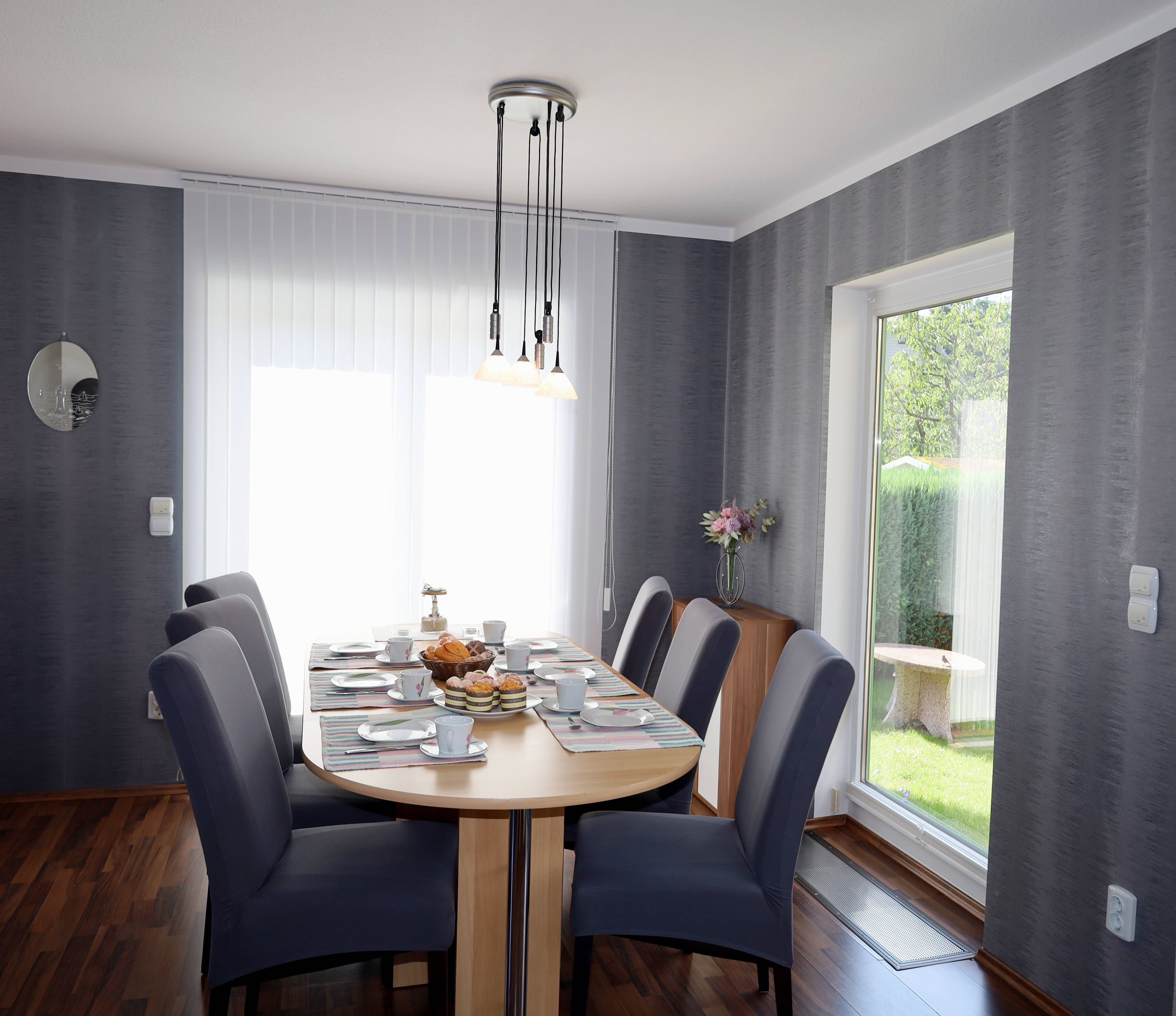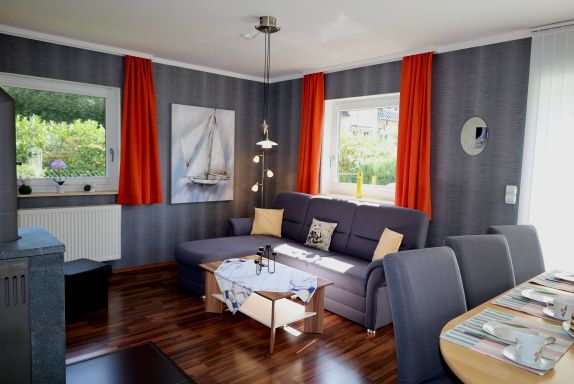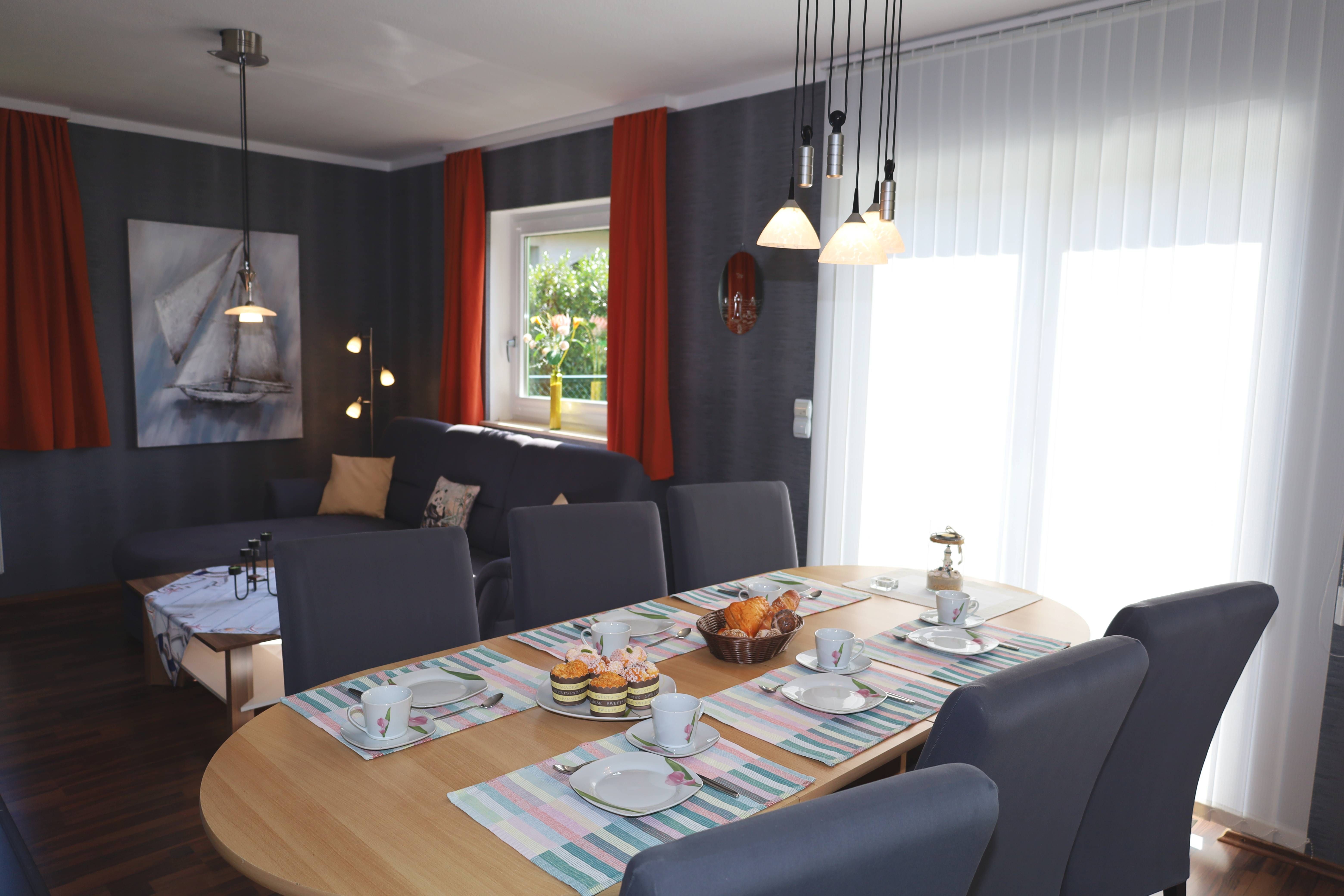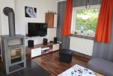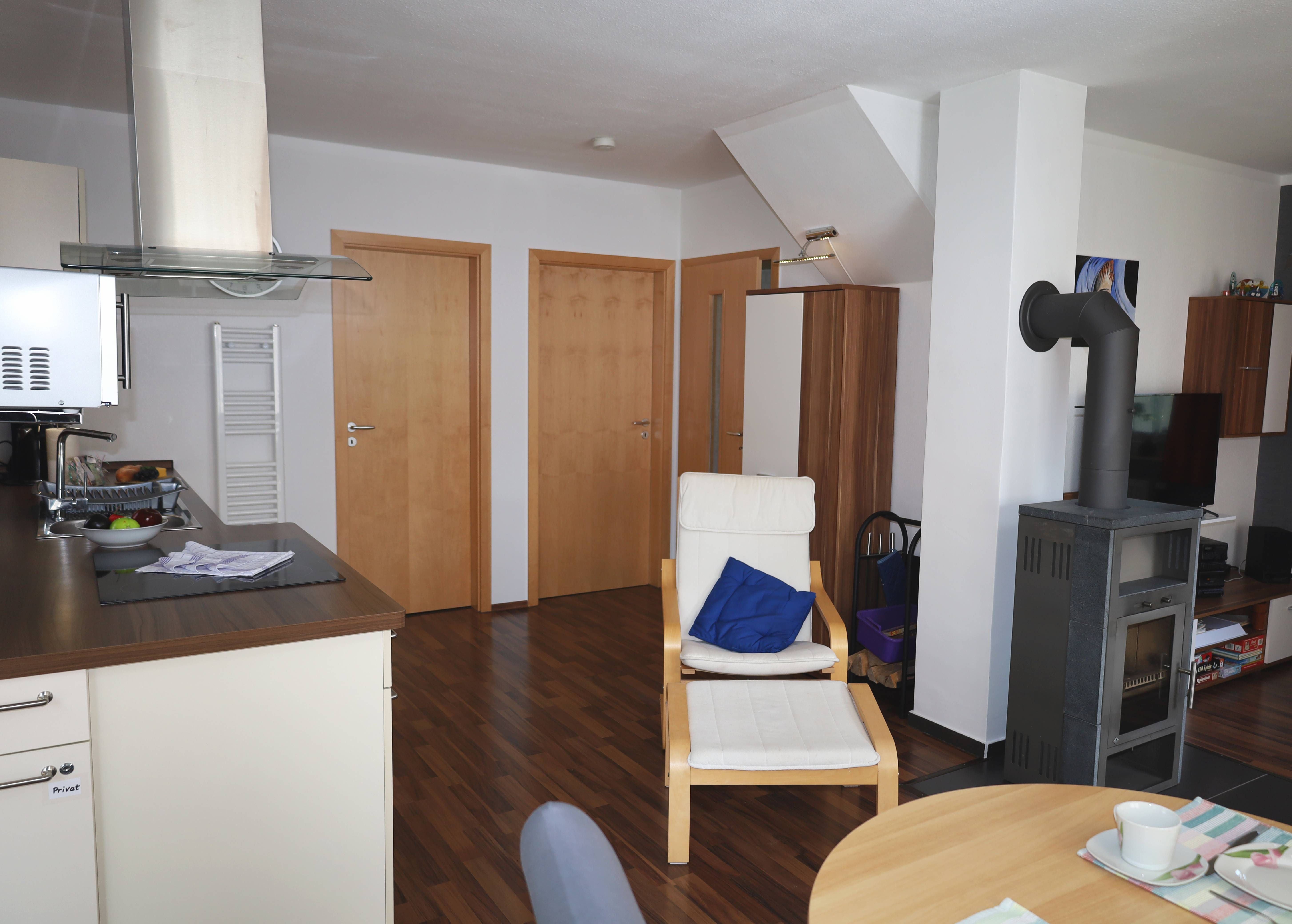 Das Wohnzimmer lädt mit seiner gemütlichen Couch, dem knisternden Kamin und dem Fernseher sowie kostenlosen W-Lan zu entspannten Abenden ein. Am großen Esstisch finden bis zu sechs Personen gemeinsam Platz für ein geselliges Frühstück oder ein Abendessen.