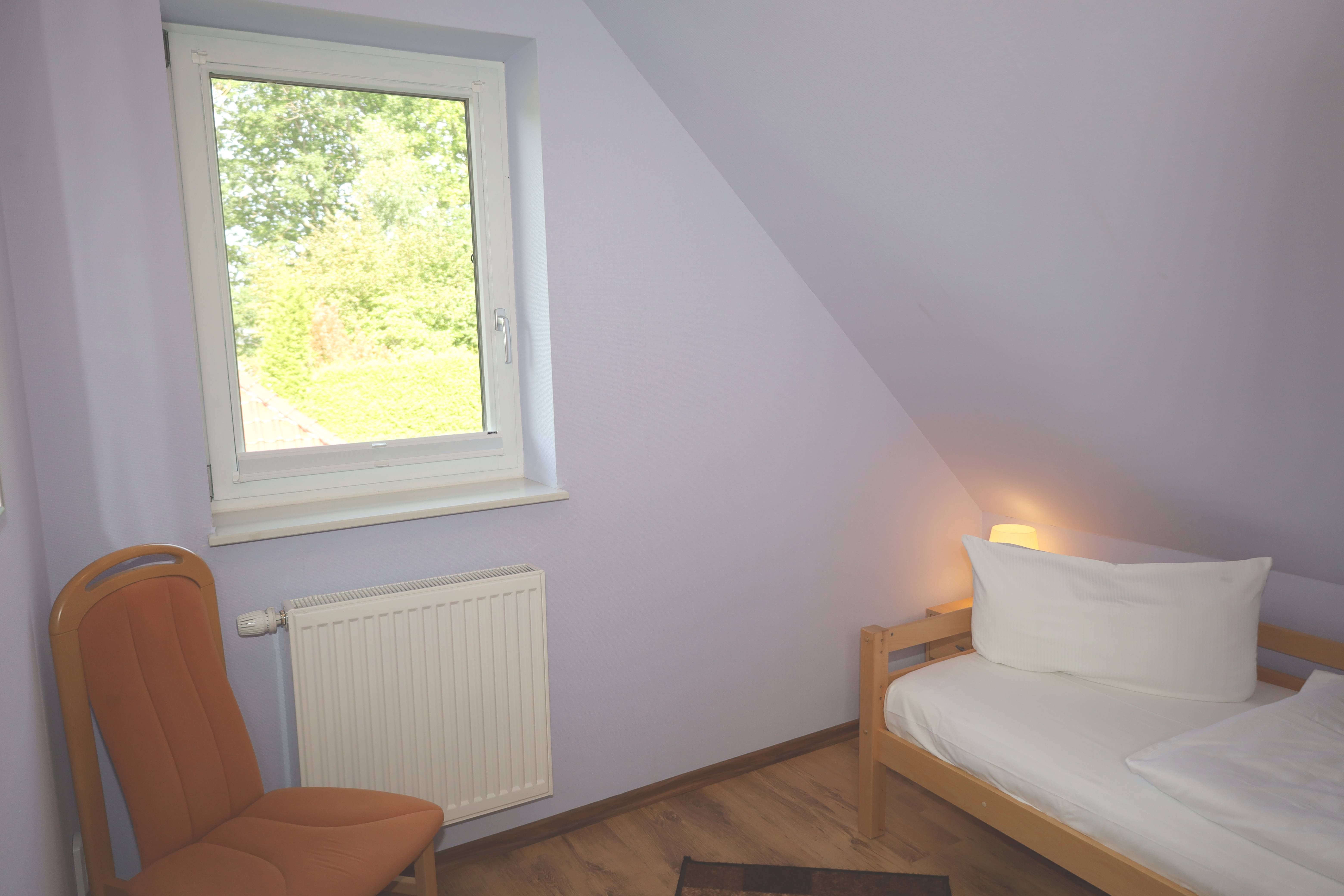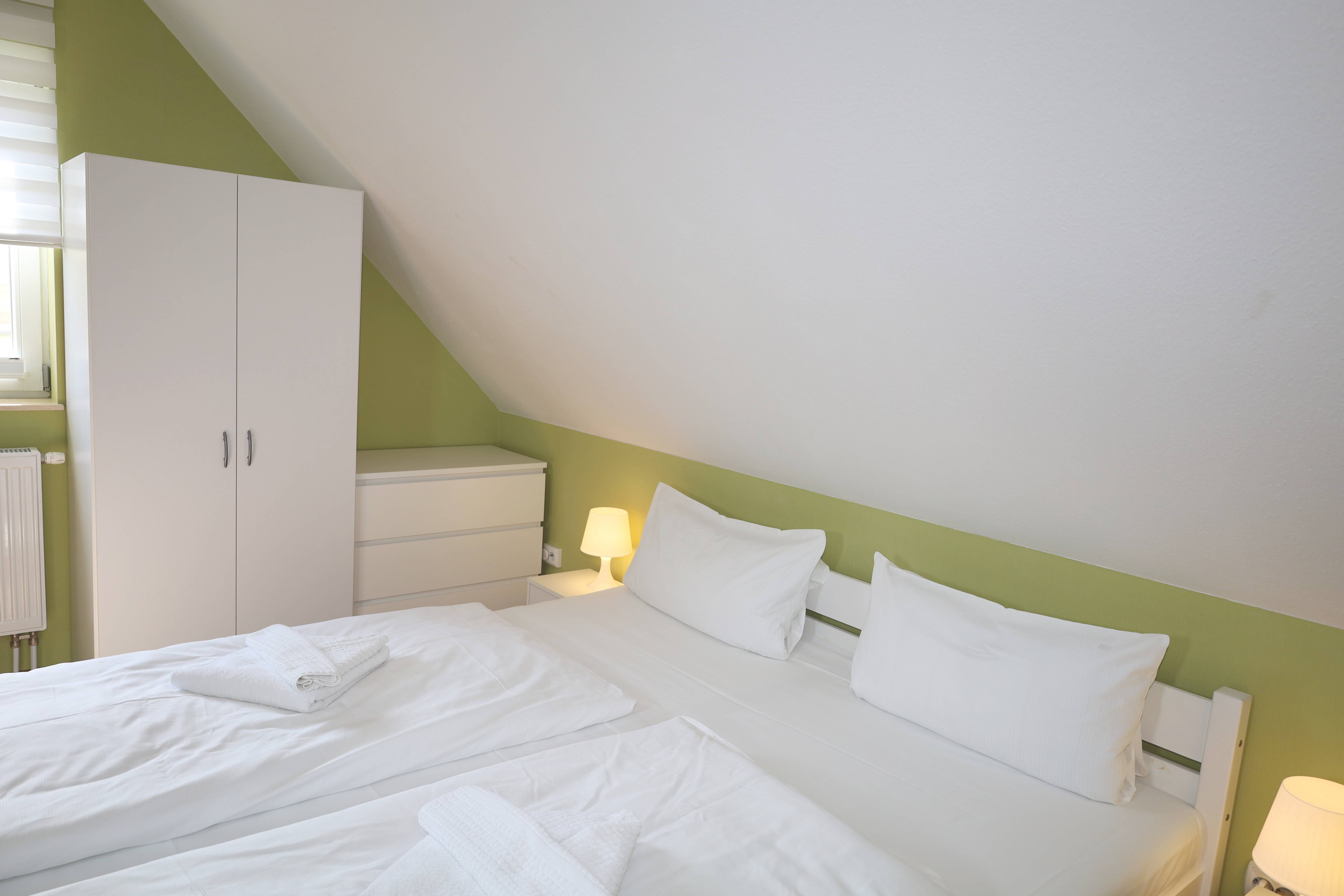 Im Obergeschoss warten weitere gemütliche Rückzugsorte auf Sie: ein Schlafzimmer mit Doppelbett, Kleiderschrank und zusätzlichem Fernseher sowie ein weiteres Schlafzimmer mit Einzelbett.