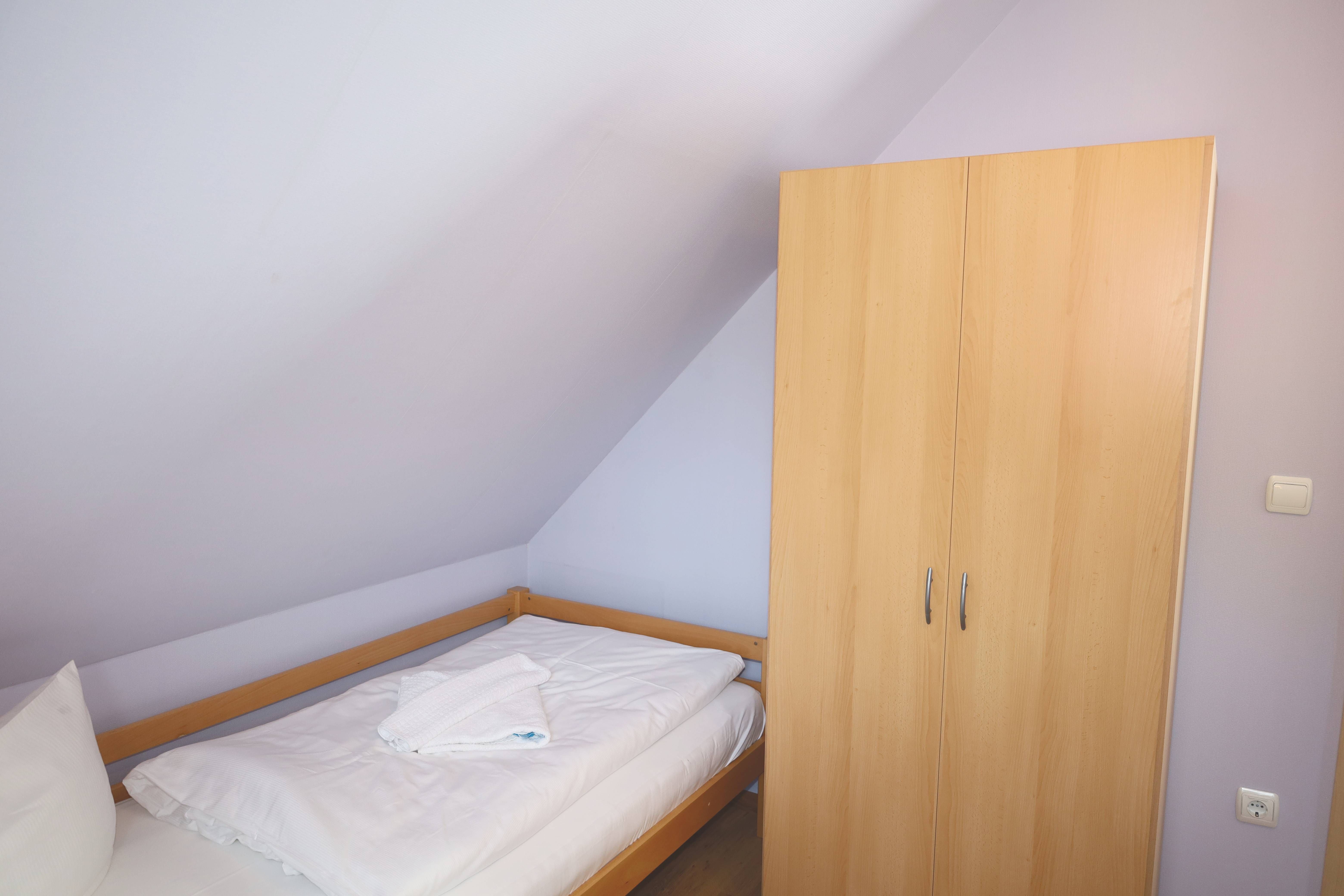 Im Erdgeschoss erwartet Sie ein gemütliches Schlafzimmer mit komfortablem Doppelbett und Kleiderschrank sowie ein weiteres Schlafzimmer mit Einzelbett und direktem Zugang zur überdachten Terrasse, perfekt, um den Tag entspannt ausklingen zu lassen.