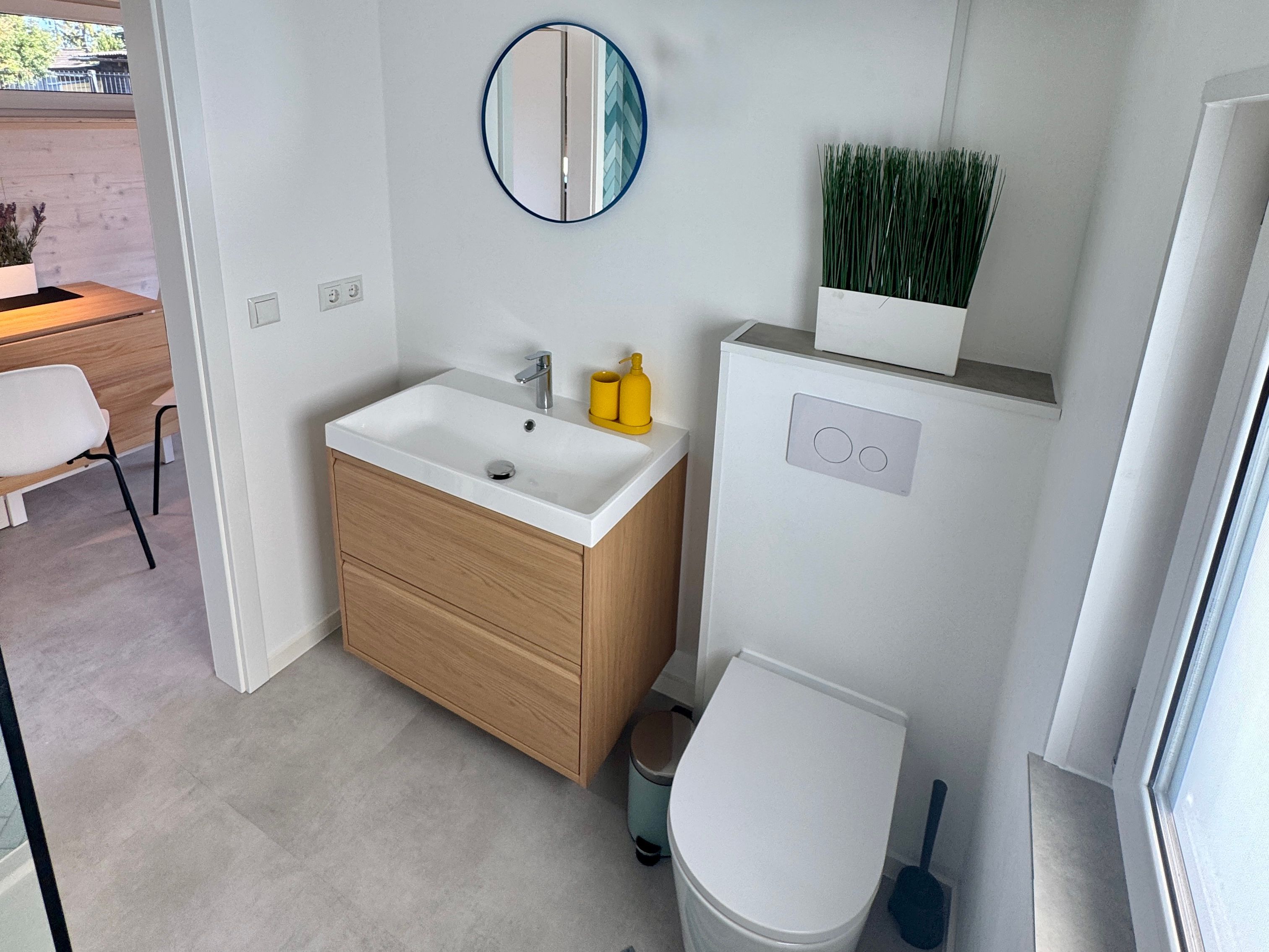 Das moderne Badezimmer verfügt über Dusche, Waschbecken, WC sowie einen 80-Liter-Boiler für warmes Wasser.