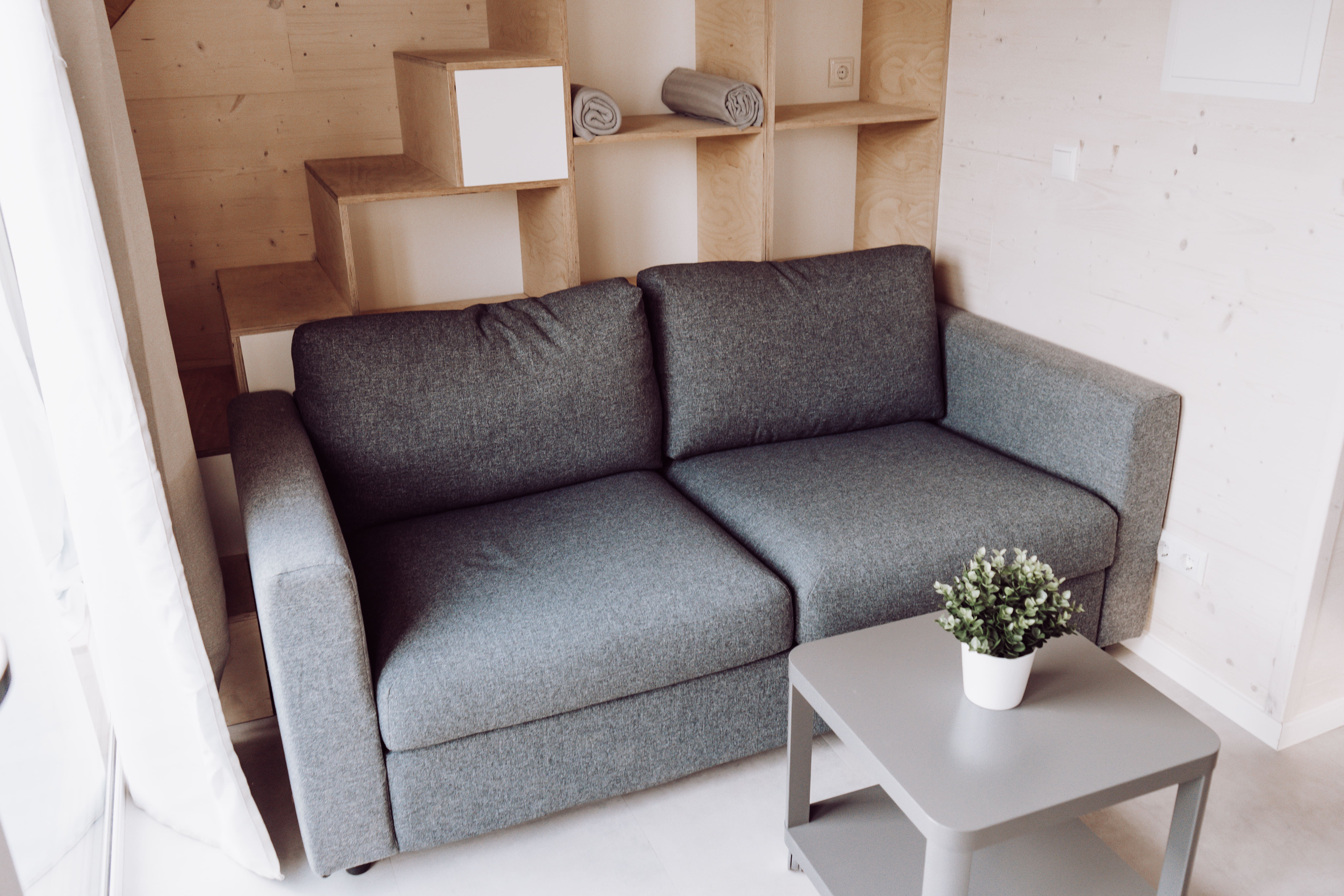 Zusammen mit der Schlafcouch im Wohnbereich (140 cm breit, mit Matratze) bietet das Tiny House Platz für maximal 4 Gäste. Für besonderen Schlafkomfort stellen wir Ihnen Decken in Übergröße (220 x 155 cm) zur Verfügung.