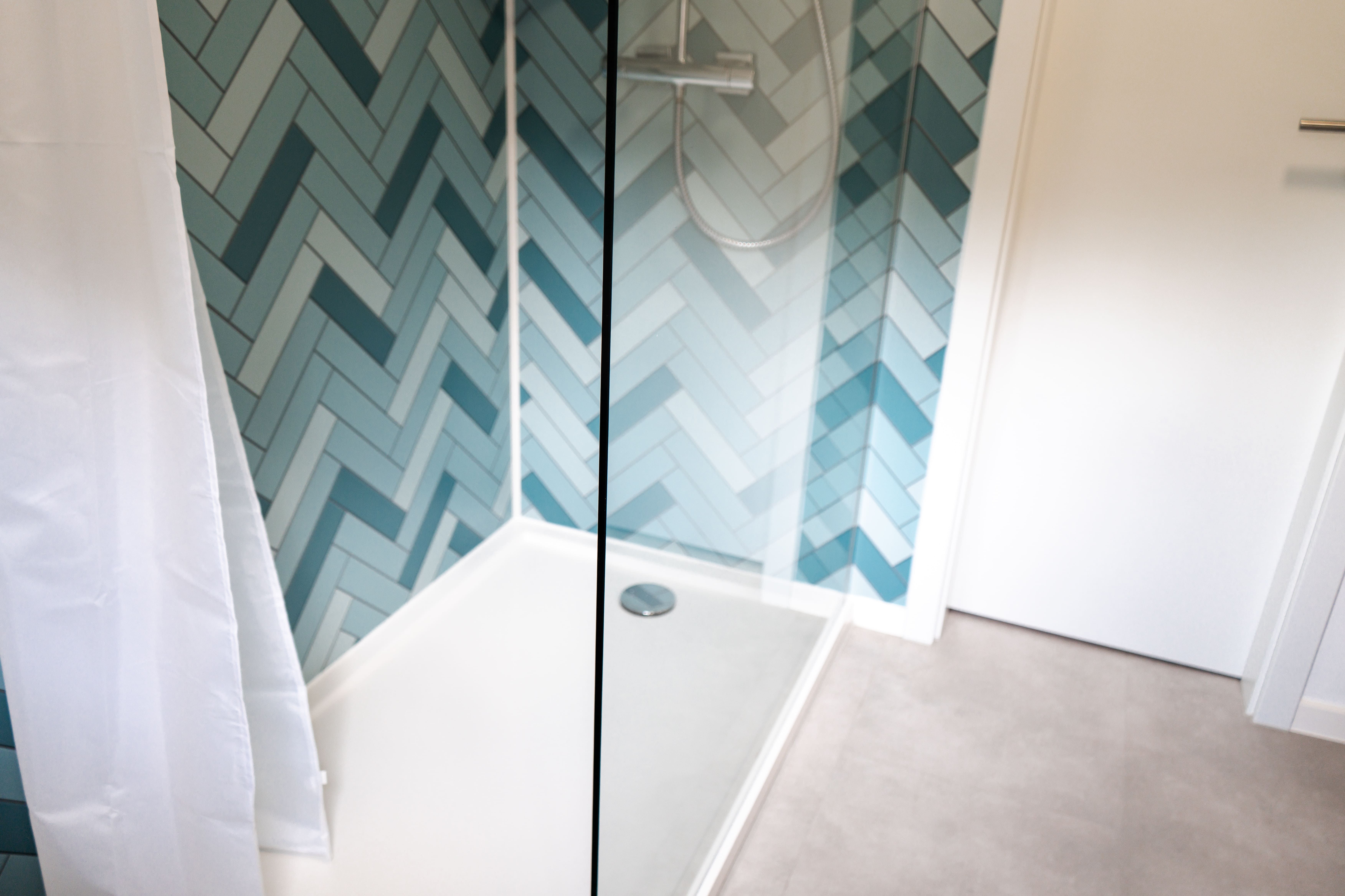 Das moderne Badezimmer verfügt über Dusche, Waschbecken, WC sowie einen 80-Liter-Boiler für warmes Wasser.