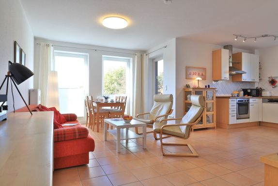 Willkommen in dieser komfortablen 2-Zimmer-Wohnung mit Balkon, im ersten Obergeschoss des Hauses. Mit einer Wohnfläche von 51qm ist dieses Ferienappartement ideal für einen erholsamen Ostseeurlaub zu zweit. Der lichtdurchflutete Wohnbereich lädt mit einem bequemen Sofa, zwei gemütlichen Sesseln, einem Flatscreen-TV, DVD-Player und einer Musikanlage zum Entspannen ein. WLAN nutzen Sie gebührenfrei. Vom Wohnbereich gelangen Sie auf den saisonal möblierten Nordwest-Balkon, wo Sie die frische Ostseeluft genießen können. Die moderne, offene Küchenzeile ist mit allen wichtigen Haushaltsgeräten ausgestattet, darunter Cerankochfeld, Backofen, Kühlschrank mit Gefrierfach, Mikrowelle, Kaffeemaschine, Wasserkocher, Toaster usw. Am Esstisch nehmen Sie Ihre Mahlzeiten zu sich. Das separate Schlafzimmer verfügt über zwei Einzelbetten, die sich zu einem Doppelbett zusammenschieben lassen, sowie einen Kleiderschrank mit viel Platz für die Urlaubsgarderobe. Ein modernes Badezimmer mit Dusche, WC und kostenfreier Nutzung einer Waschmaschine rundet das Appartement ab. Mitgebrachte Fahrräder können im wohnungseigen Abstellhäuschen untergestellt werden. Diese 2-Zimmer Nichtraucherwohnung ist der perfekte Rückzugsort für Paare, die einen entspannten Ostseeurlaub suchen.